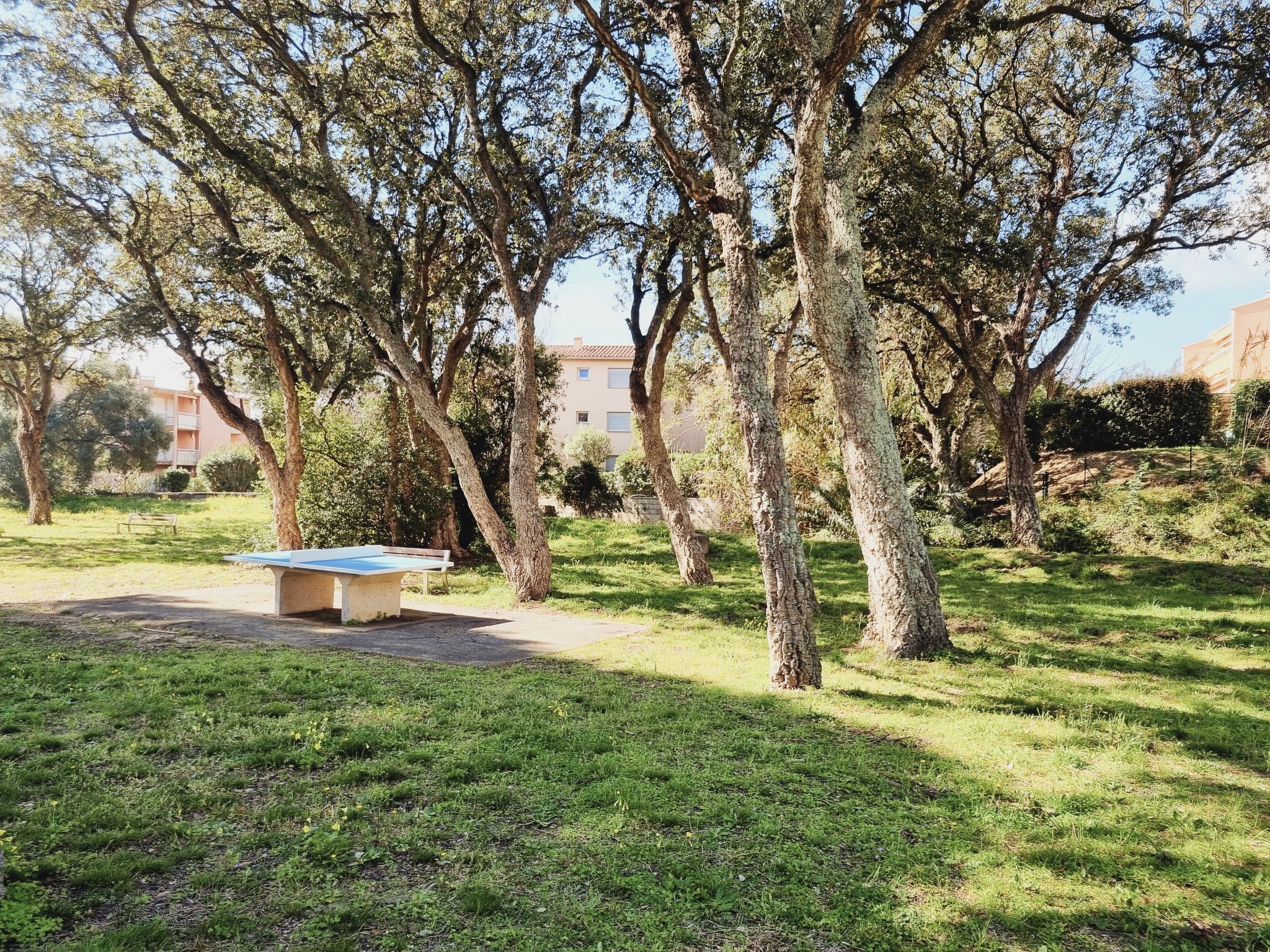 Résidence "Val des Chênes", de 2 étages. En-dehors de la localité, à 2 km du centre de Cavalaire Sur Mer, situation tranquille, ensoleillée, à 200 m de la mer, à 200 m de la plage. En commun: parc 2'000 m2 avec pelouse et arbres. Ping-pong, terrain de pétanque, espace de jeux pour les enfants, place de parking. Magasins 1.5 km, magasin d'alimentation 300 m, supermarché 2 km, restaurant, bar 300 m, boulangerie, café 600 m, arrêt de bus "place du parc" 450 m, plage de sable "Marina Viva" 250 m, parc "Aqualand" 24 m, centre de plongée 1.7 km. Port plaisance 1.6 km, ecole de voile 1.6 km, tennis 300 m, golf miniature 12 km. Attractions à proximité: Azur Park, Paint-ball 12 km, Bowling à Port-Grimaud 13 km, St-Tropez 17 km, Ste-Maxime 24 km. Région de randonnées: Sentier du Dattier 8 km, Sentier du littoral 6 km, Toulon 60 km. La remise des clés a lieu à l’agence de Cavalaire. Accès à la mer à 200m, sans traverser la rue (passage souterrain).