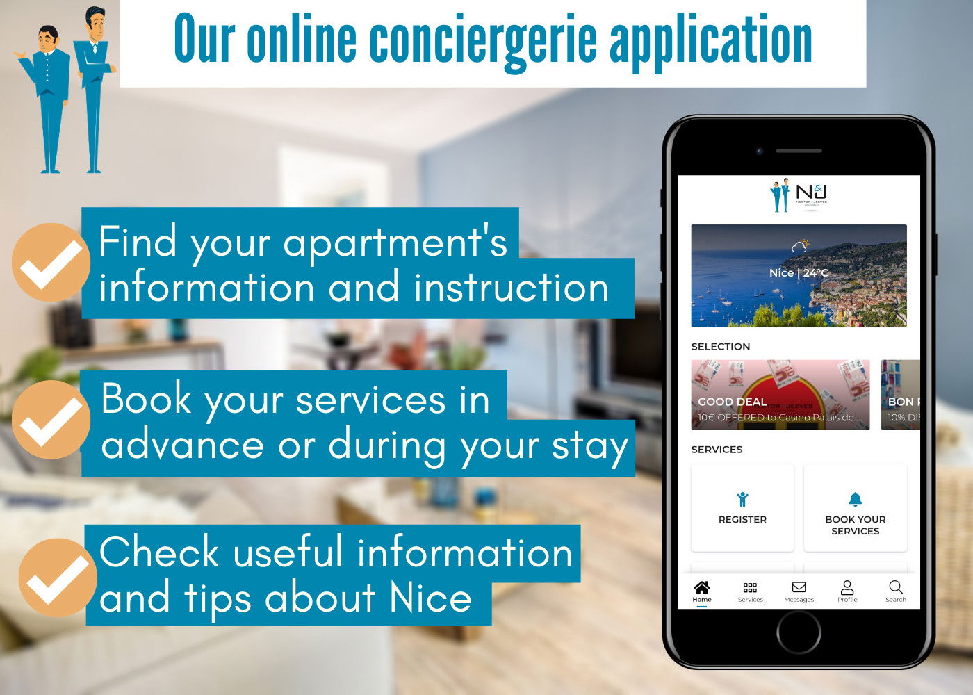 Un service de conciergerie située dans le centre de Nice sera présente pour vous accompagner pendant toute la durée de votre séjour.