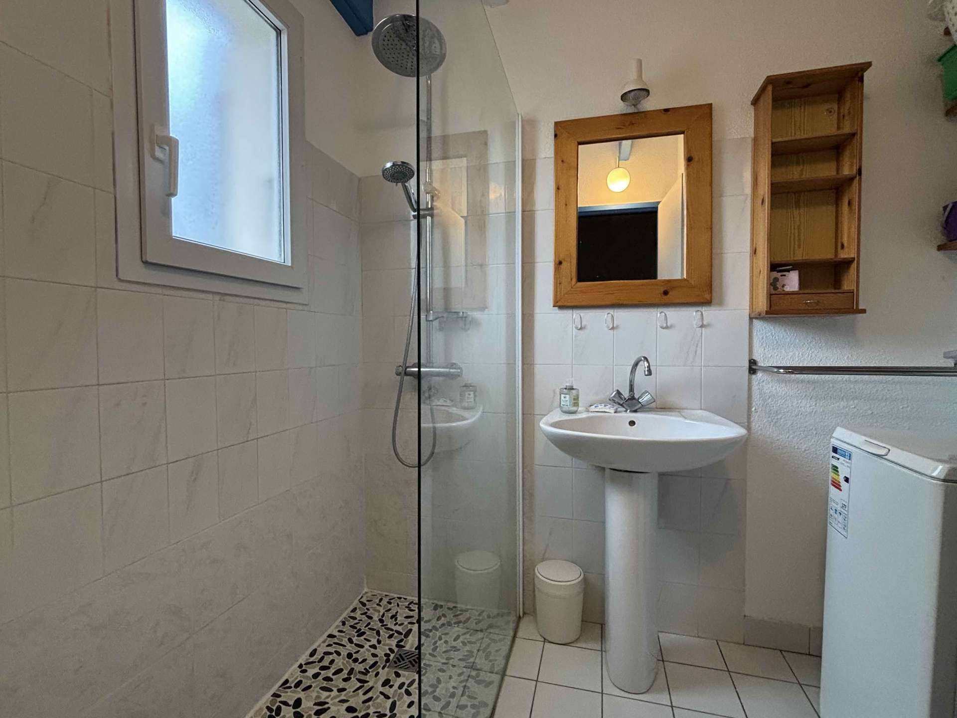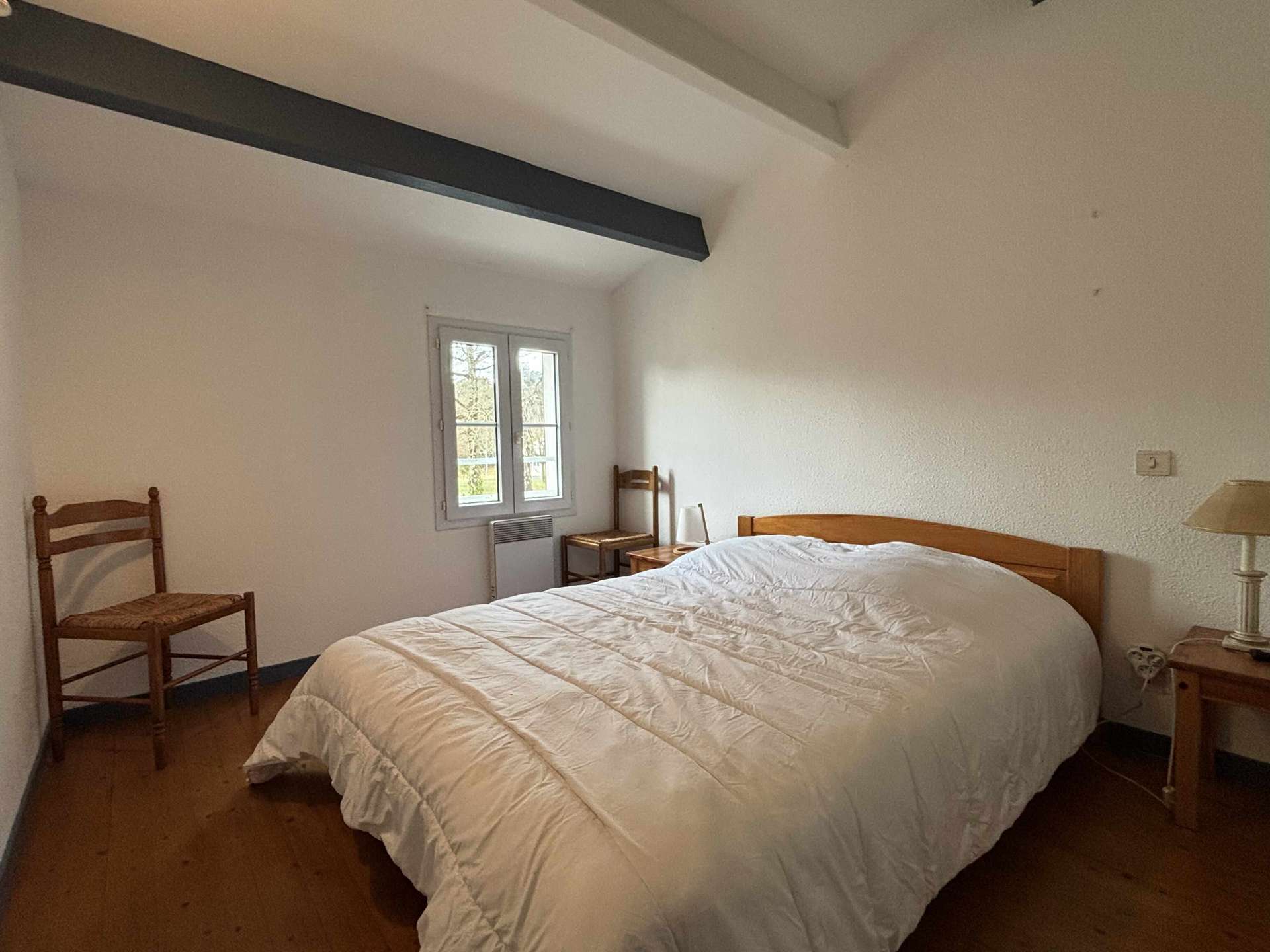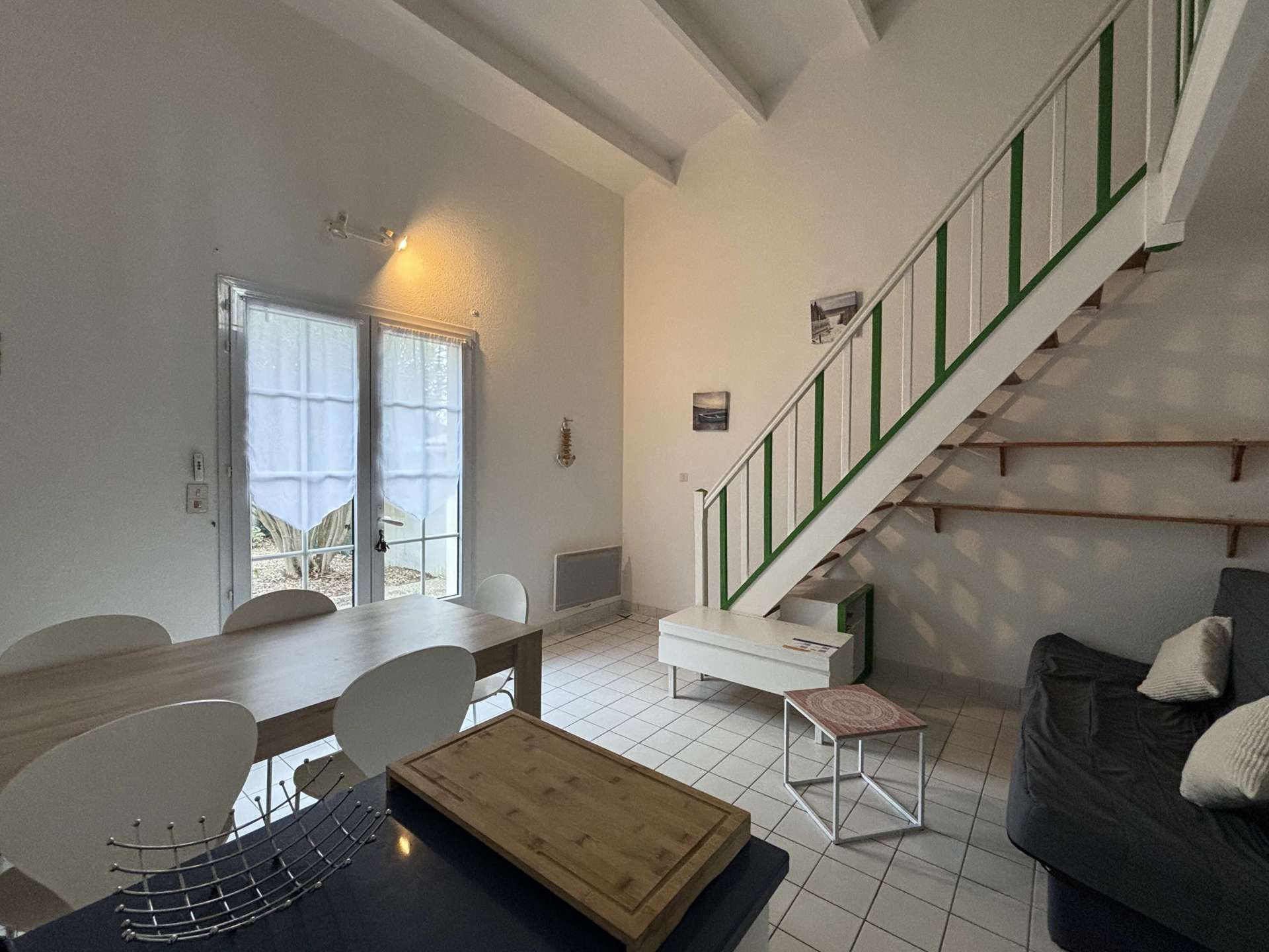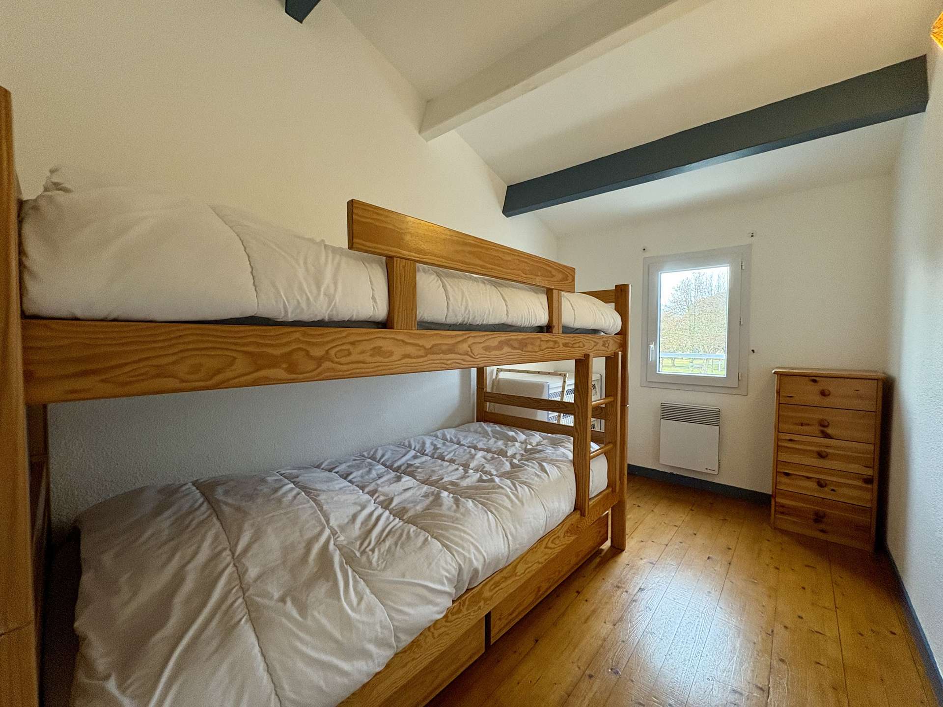 Maison dans petite résidence intimiste, à proximité de la plage. Elle se compose d'une entrée avec coin nuit (clic-clac 140), d'une salle d'eau avec machine à laver, wc séparés, pièce de vie avec coin cuisine équipé (frigo, lave-vaisselle, plaque 2 feux vitrocéramiques, micro-ondes). A l'étage une première chambre avec lit superposé 90, une seconde chambre avec lit 140 et placard. En extérieur une terrasse et un jardinet. Local à vélo privatif et emplacement de stationnement attitré dans la résidence.