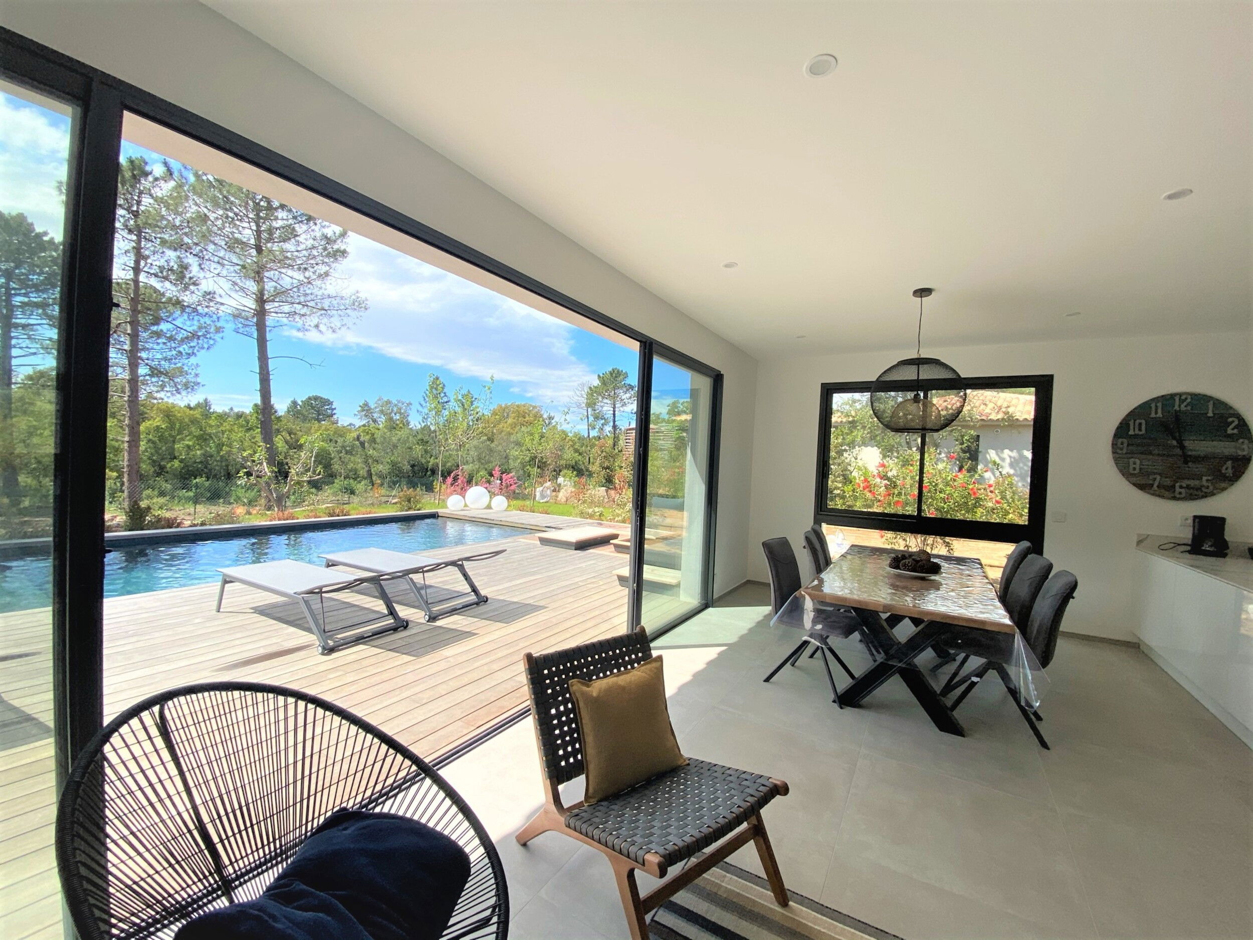 - Salon/salle à manger avec cheminée et baies vitrées donnant sur la terrasse et la piscine