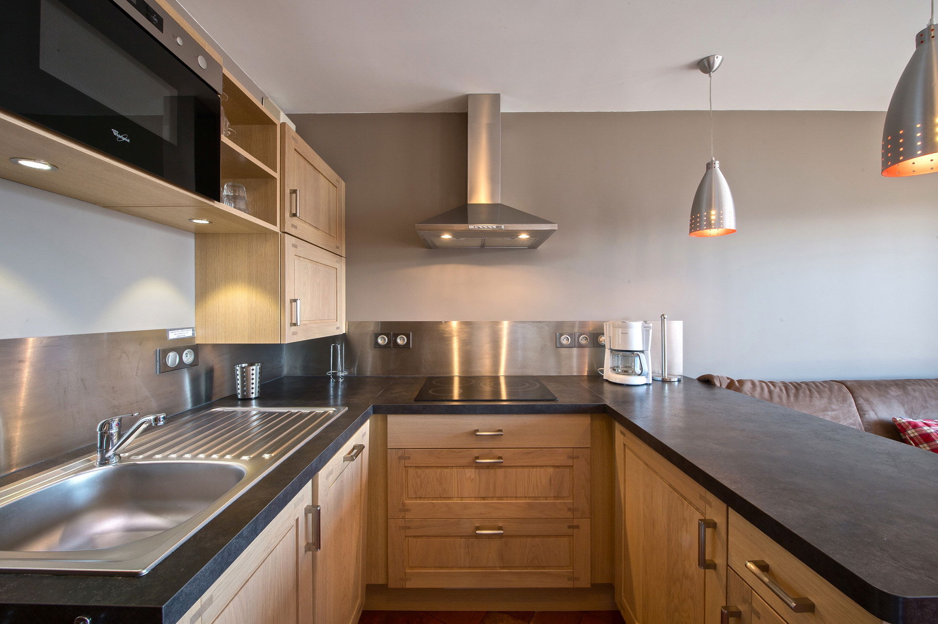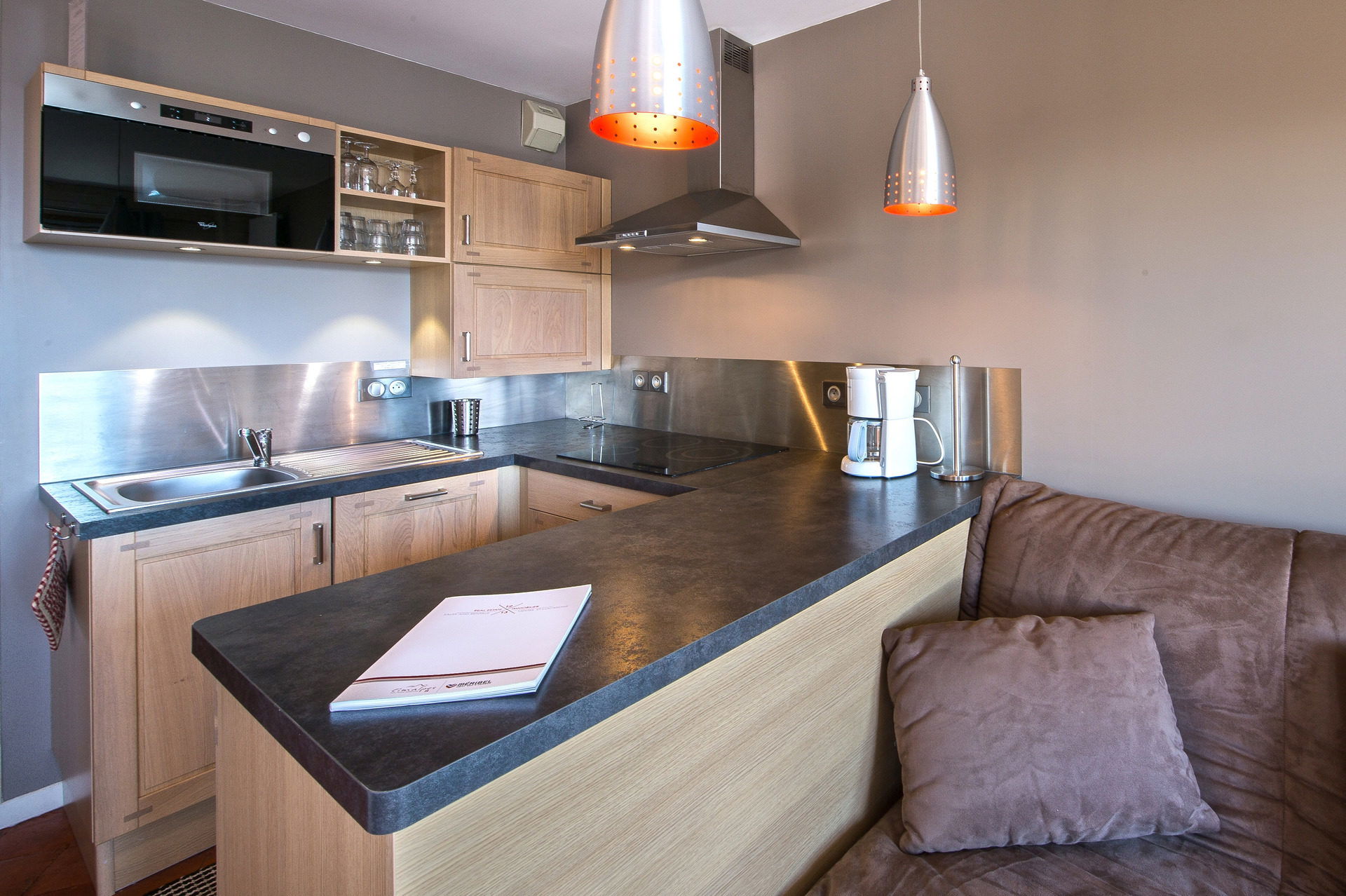 - Cuisine : 4 plaques vitrocéramiques, four combiné (traditionnel + micro-ondes), réfrigérateur, lave-vaisselle
