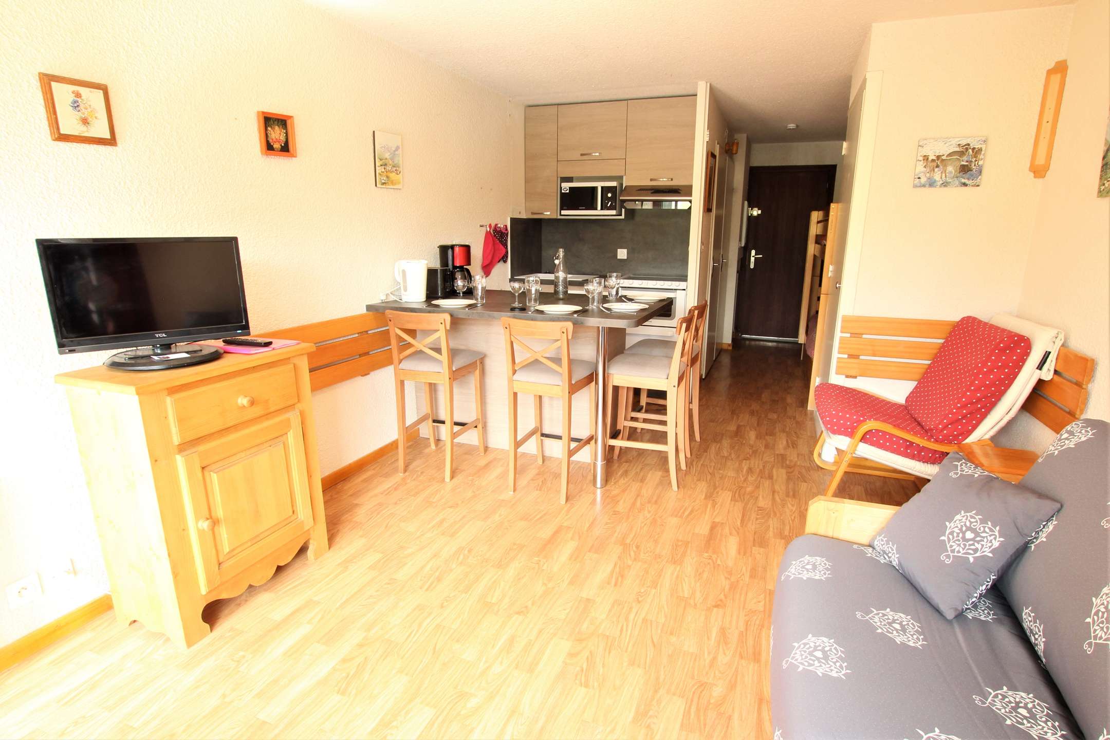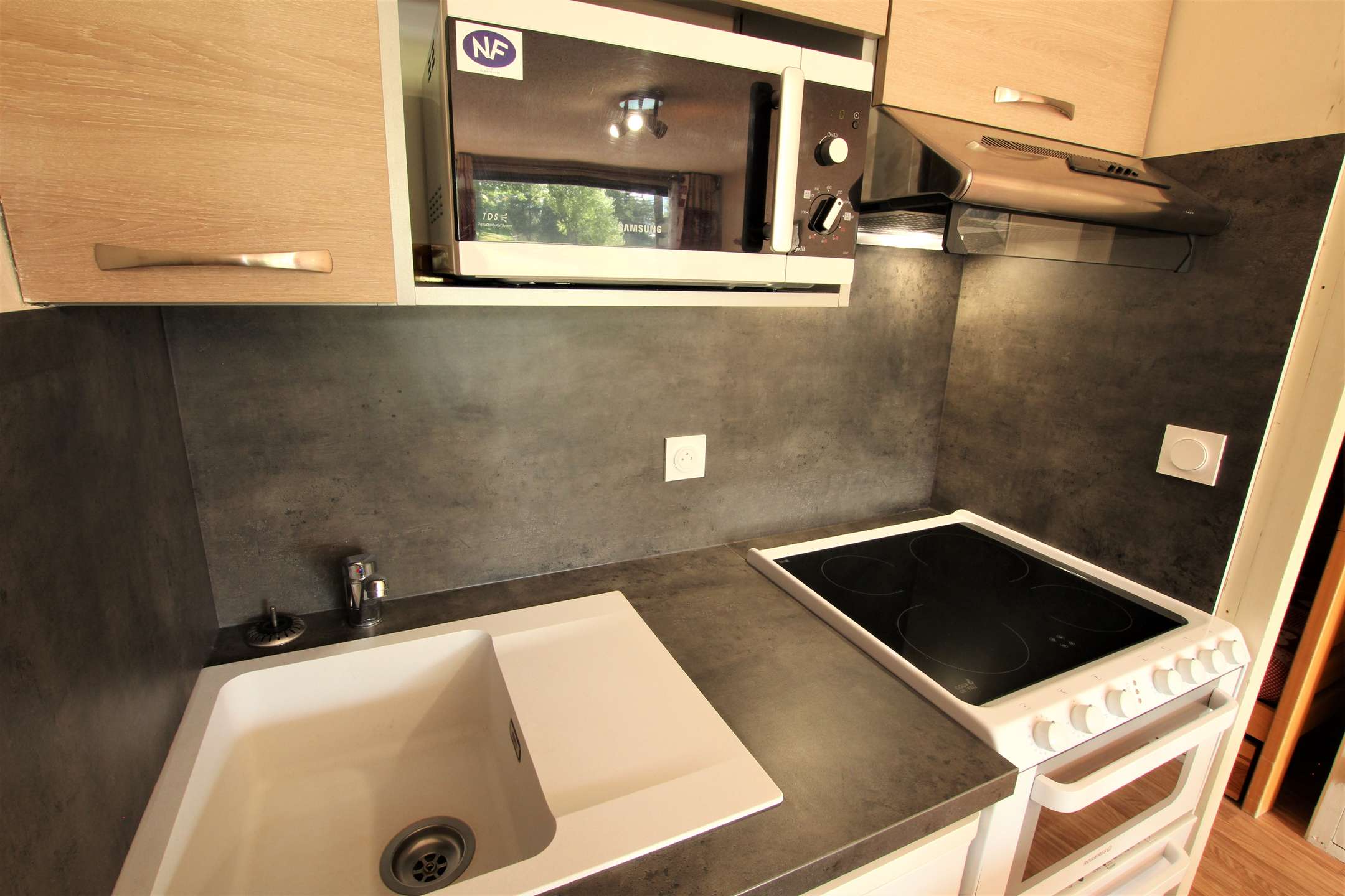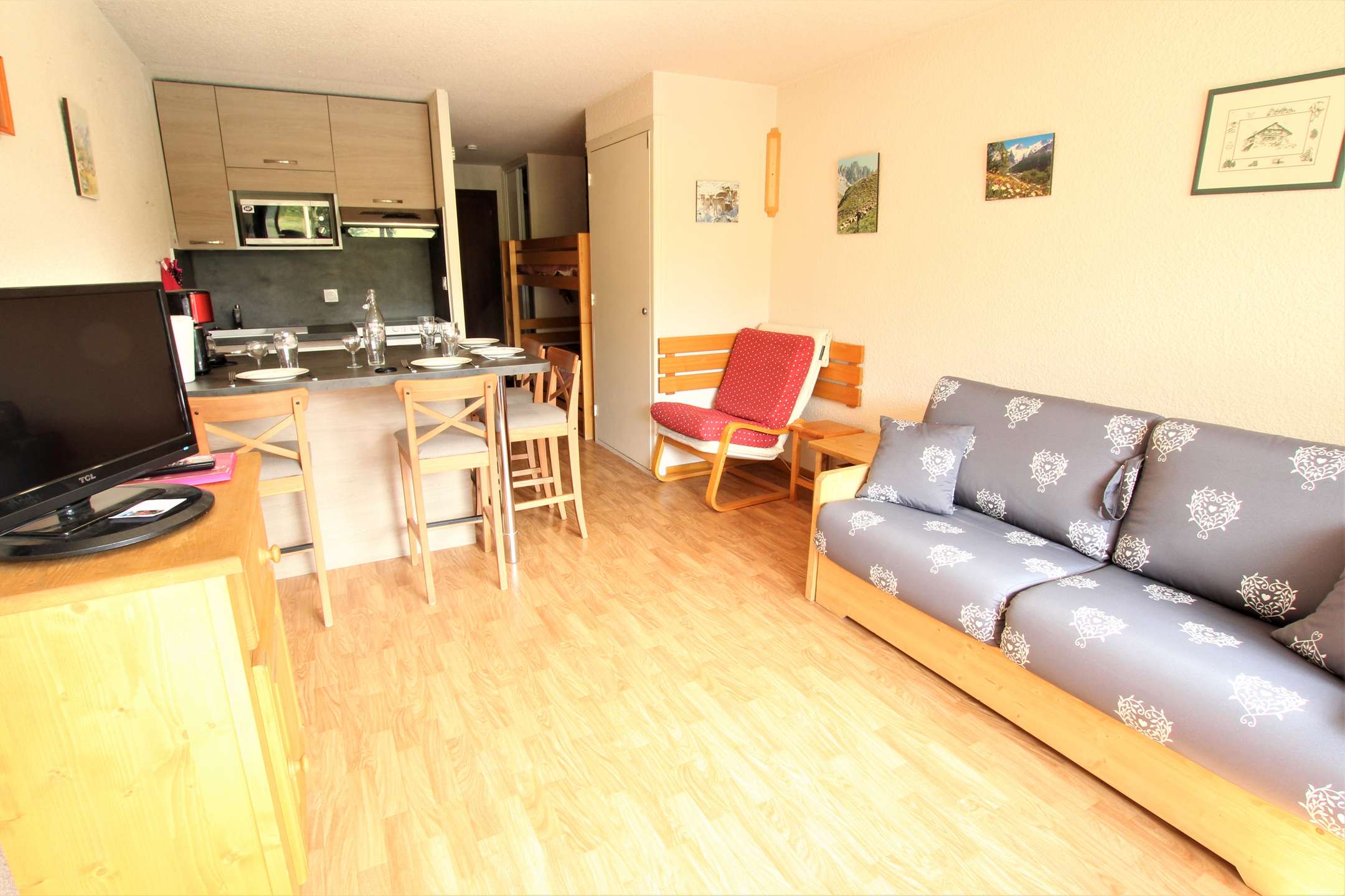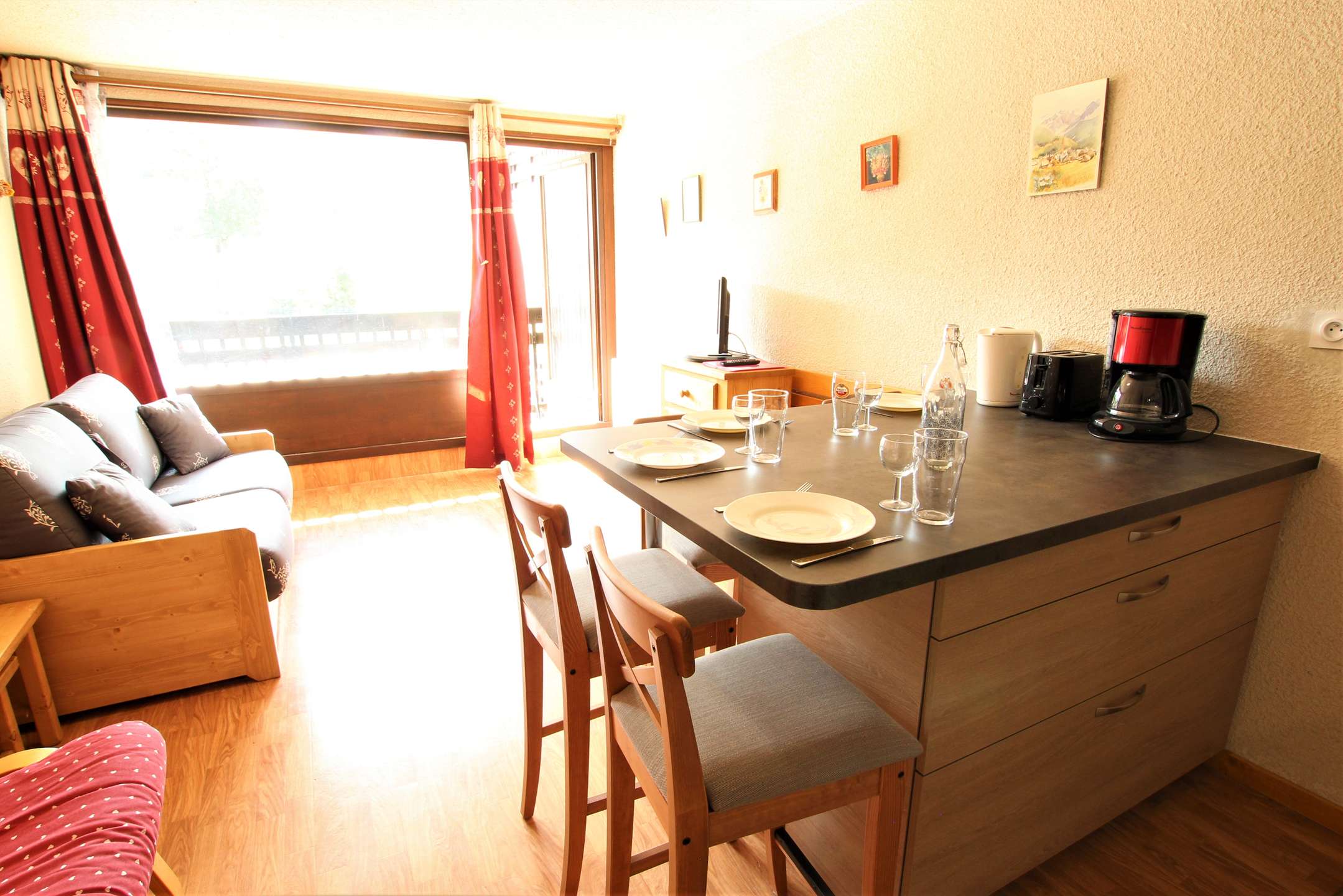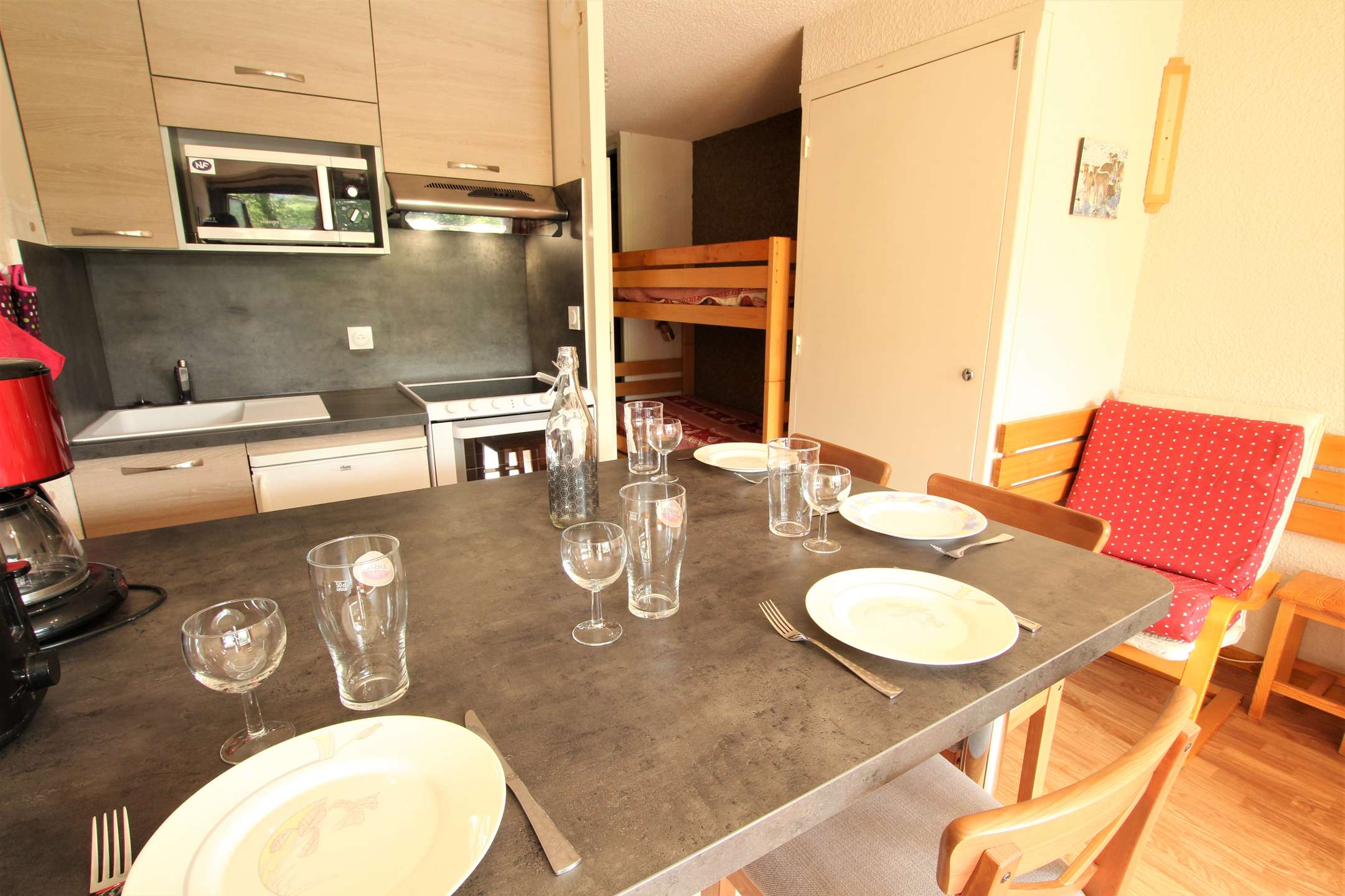 Ce charmant studio se compose d'un coin montagne avec des lits superposés , d'un séjour avec une banquette lit gigogne ( 2 places ) et une télévision, d'un coin cuisine équipé d'une cuisinière électrique avec trois plaques et un four et d'un lave vaisselle. La salle d'eau et les WC sont indépendants.