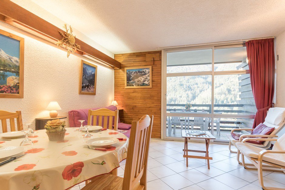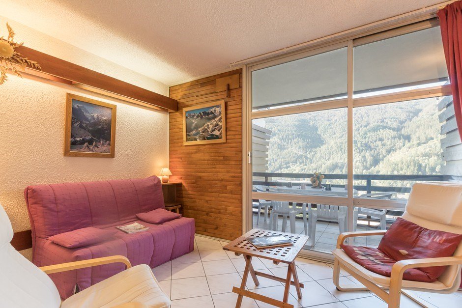 - Séjour avec canapé lit BZ pour 2 personnes, le salon est équipé de la télé et ouvre sur une baie-vitrée avec balcon et mobilier de jardin