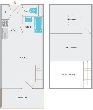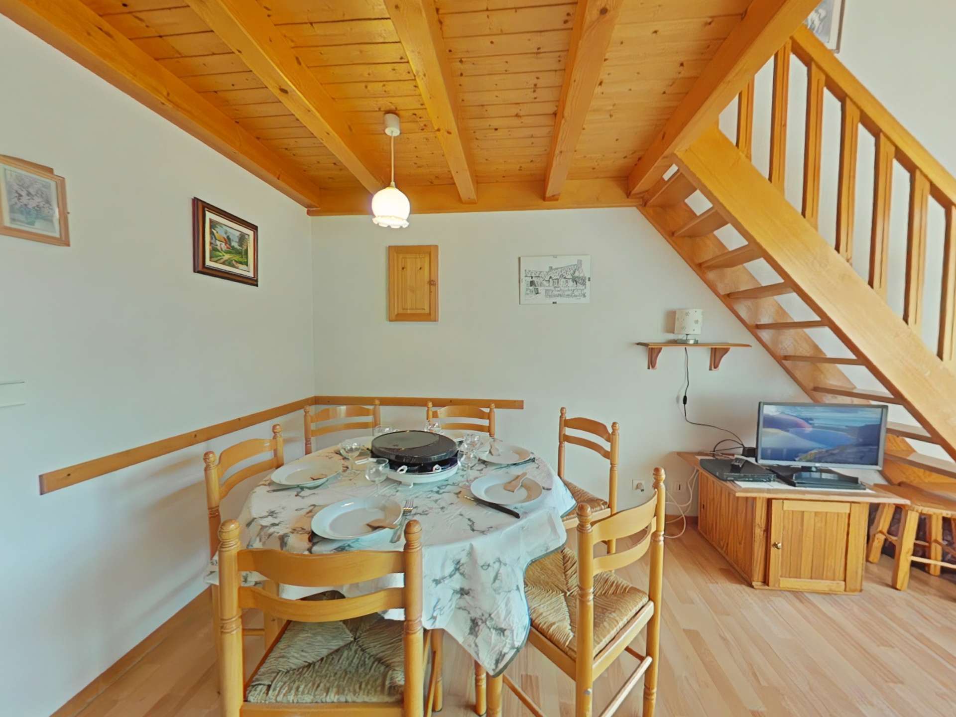 Cet appartement de vacances au 2ème étage comprend un séjour avec canapé convertible 2 personnes et télévision donnant accès à un balcon sud avec vue sur le village, un coin cuisine équipé avec lave-vaisselle, une salle de bain et un WC indépendant. Une mezzanine avec un canapé convertible 2 personnes et une chambre avec 1 lit double.