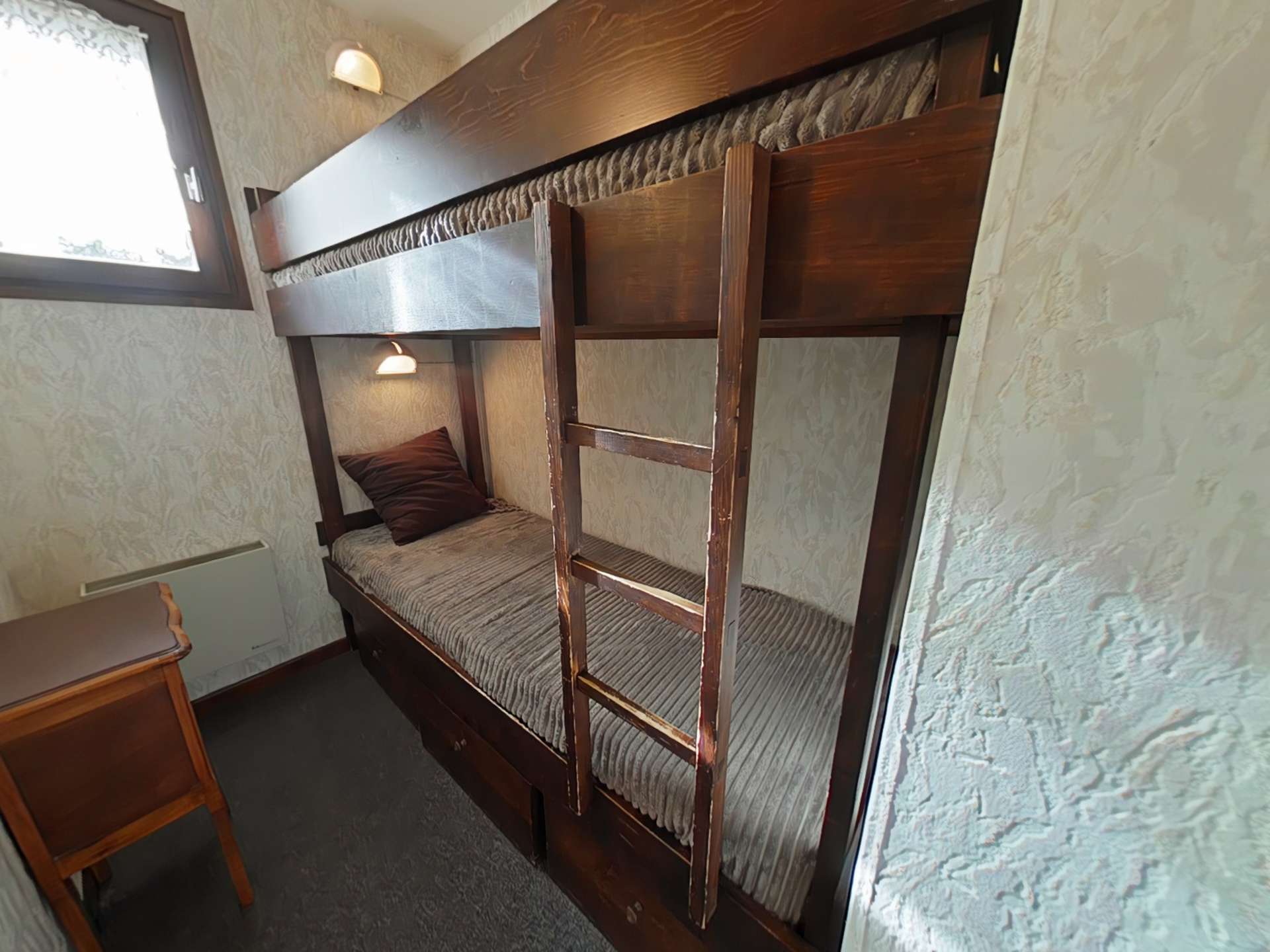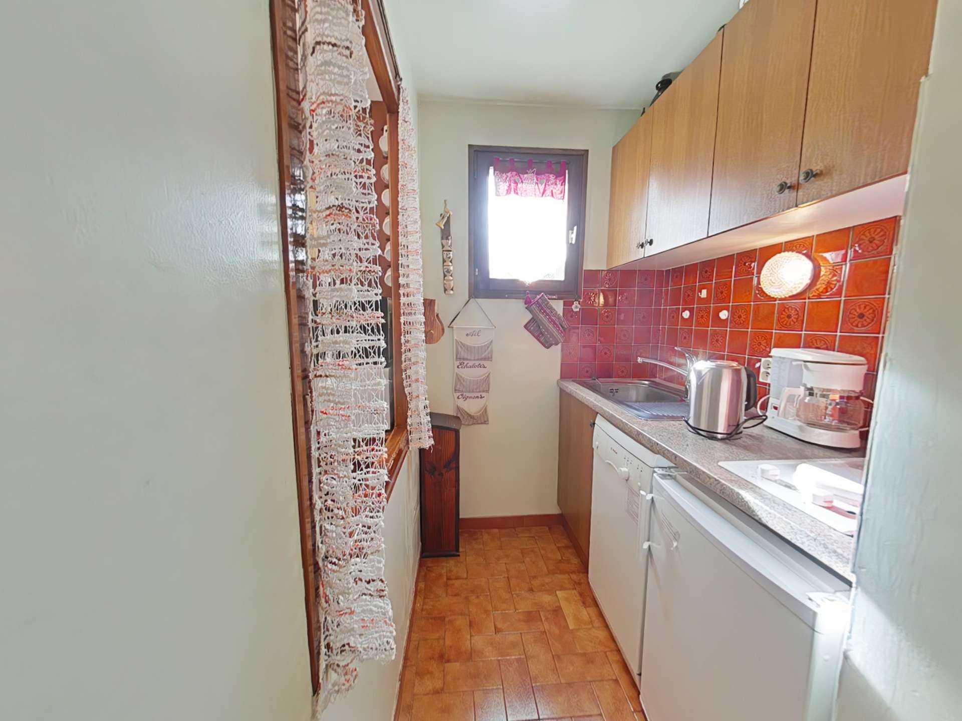 Cet appartement de vacances en rez de chaussée, comprend un séjour avec un canapé convertible 2 personnes et télévision avec accès balcon Sud avec vue sur la Colombière, un coin cuisine équipé avec lave-vaisselle, une cabine avec 2 lits superposés, une salle de bain avec WC. Pas de réseau WIFI