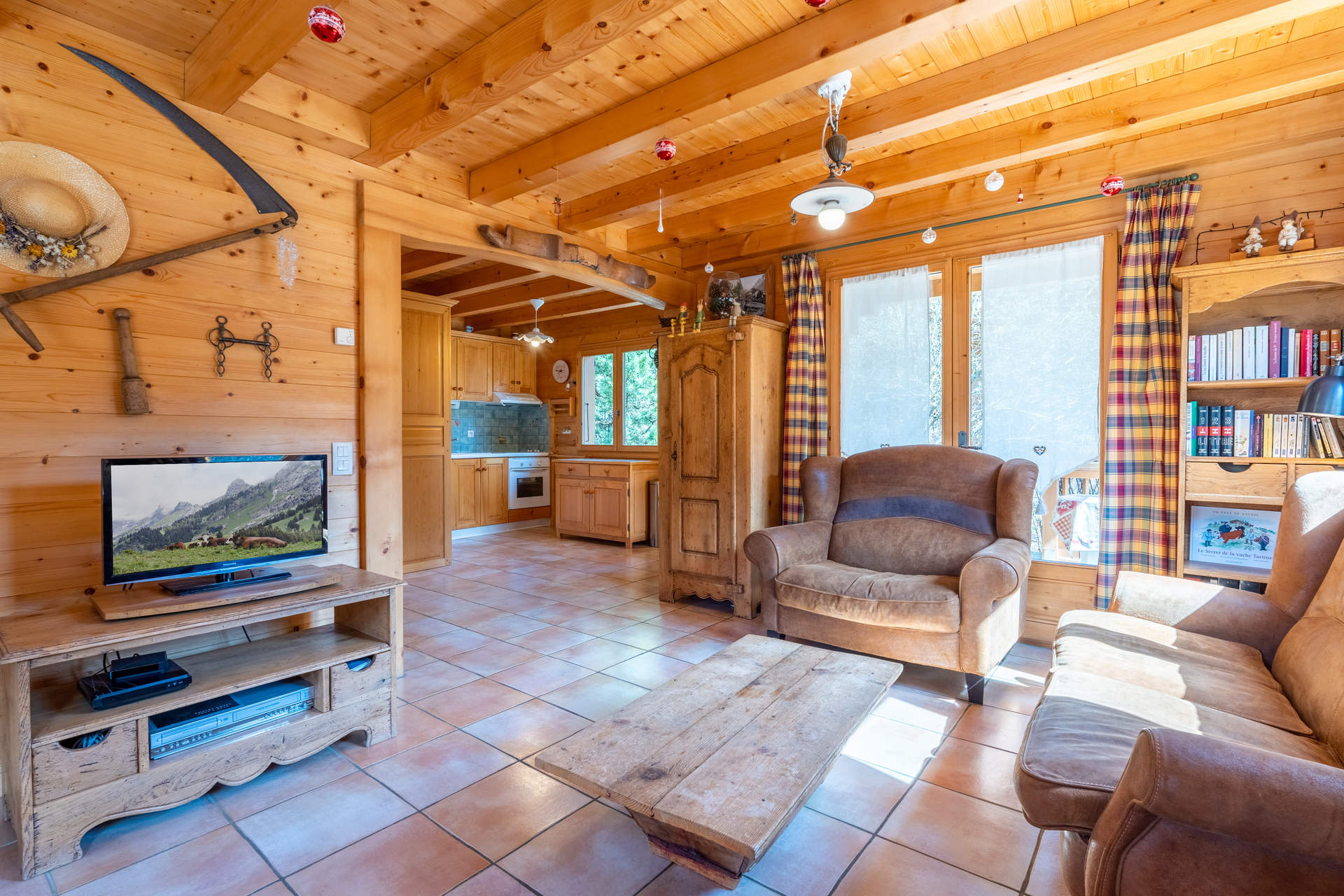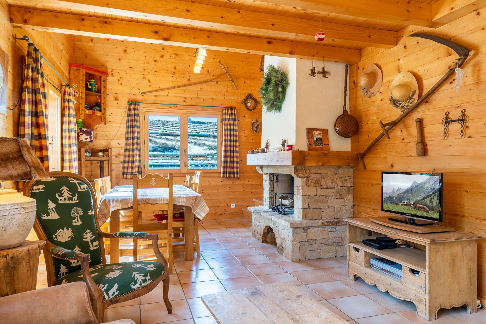 - SEJOUR (25.16 m²) : coin repas, coin salon, TV écran plat, CHEMINEE DECORATIVE, porte fenêtre ouest, accès balcon ouest-sud, vue chalets voisins / espaces verts, fenêtres sud, vue chalets voisins / espaces verts / montagne, fenêtre est, vue chalets voisins / chemin du Gotty Joly / montagne