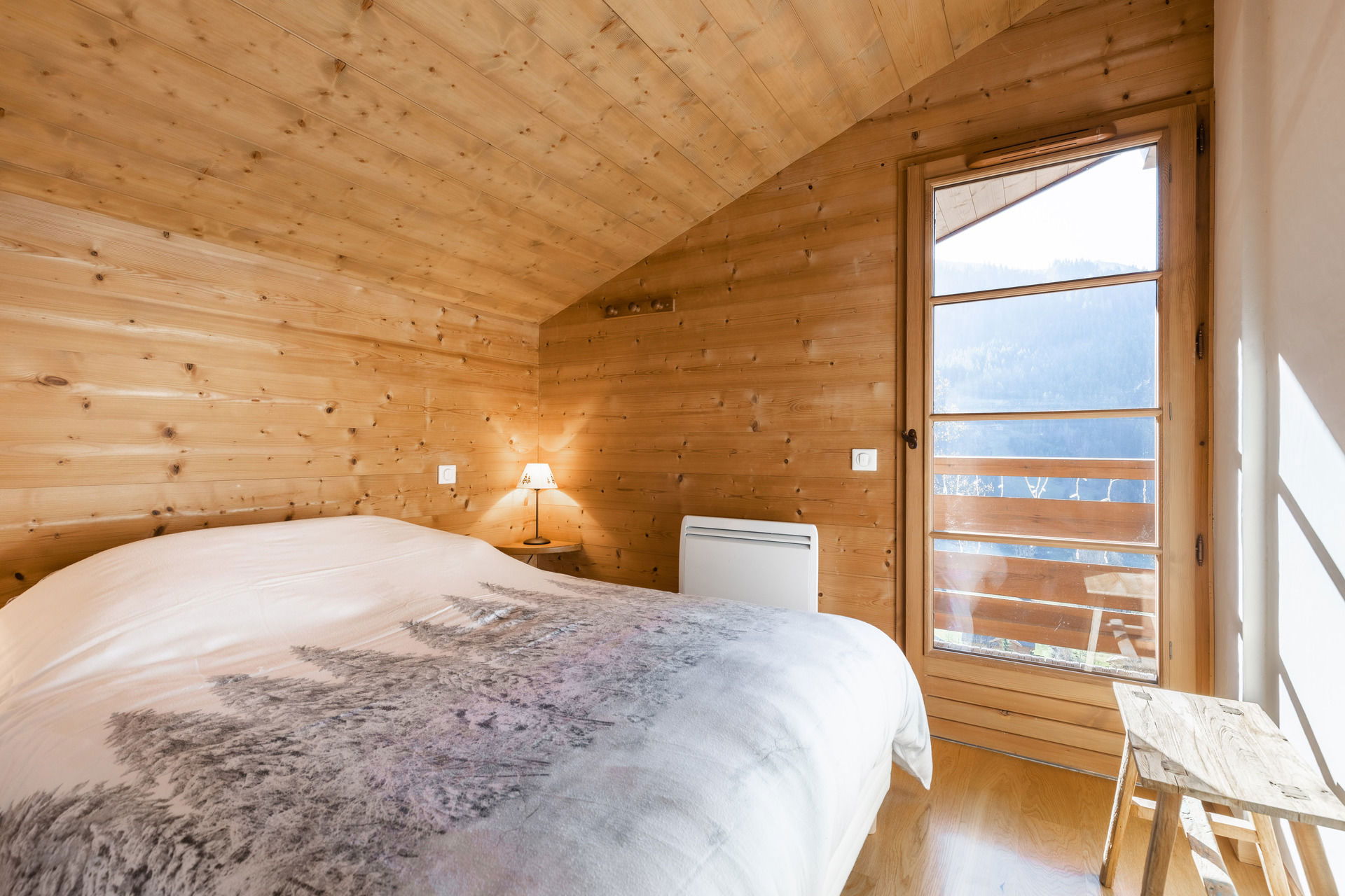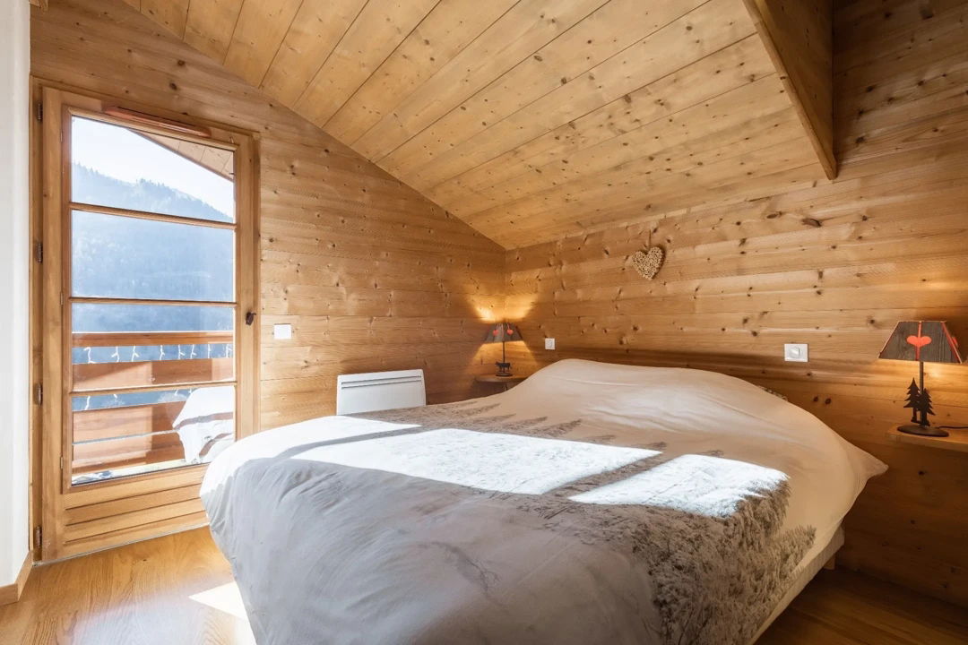 - CHAMBRE (8.51 m²) : 1 LIT 2 PLACES (160), porte-fenêtre, accès balcon sud, vue route des Confins / impasse de la Chavonette / montagne
