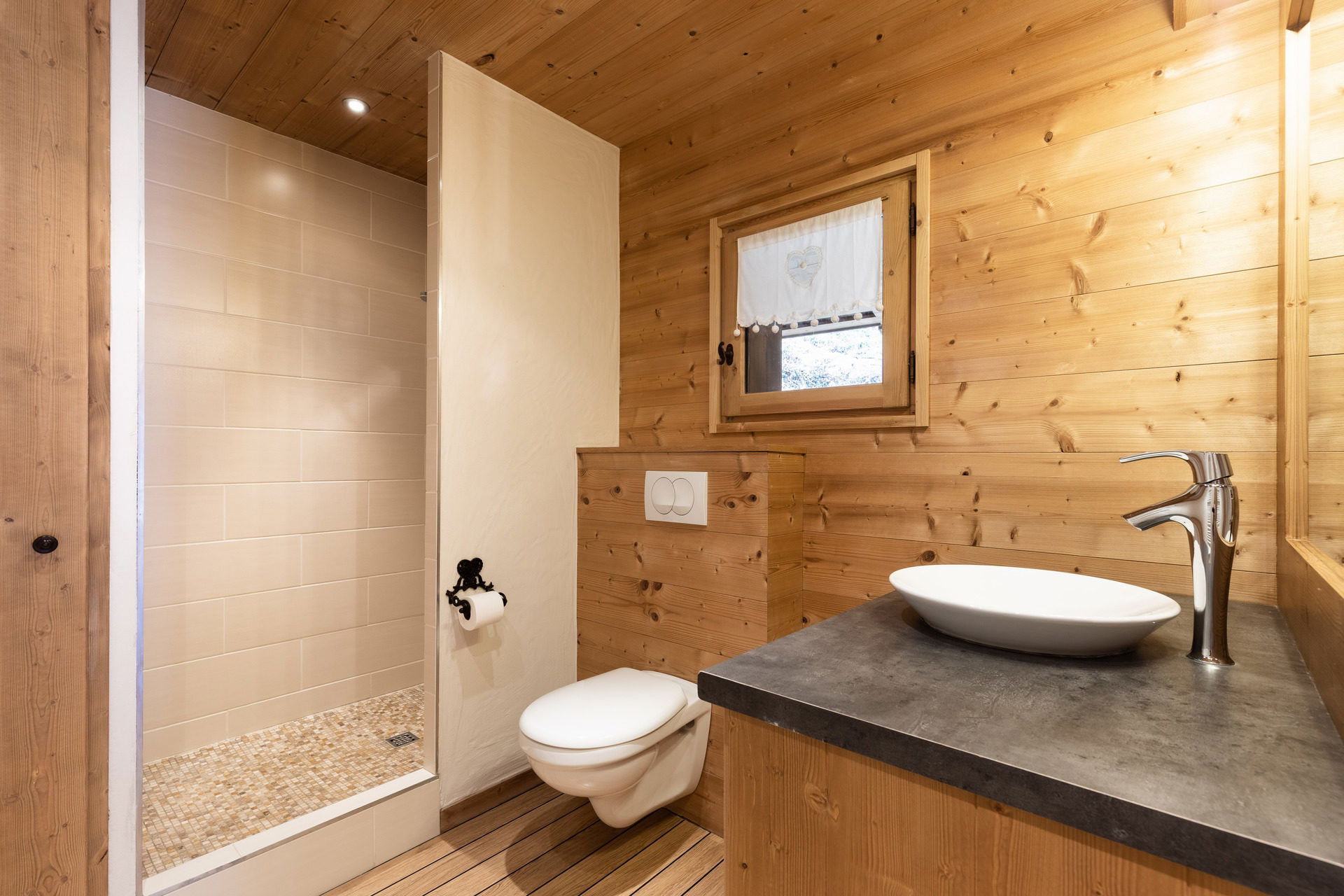 - SALLE D'EAU mansardée (4.95 m²) : douche à l'italienne, vasque, radiateur SECHE-SERVIETTE, WC, fênetre ouest vue toiture, mur végétal