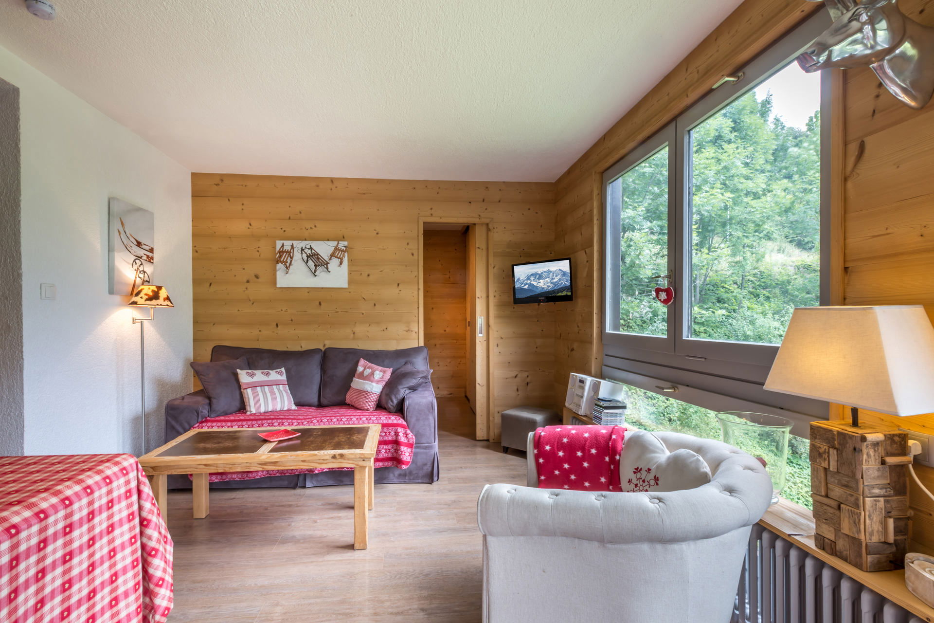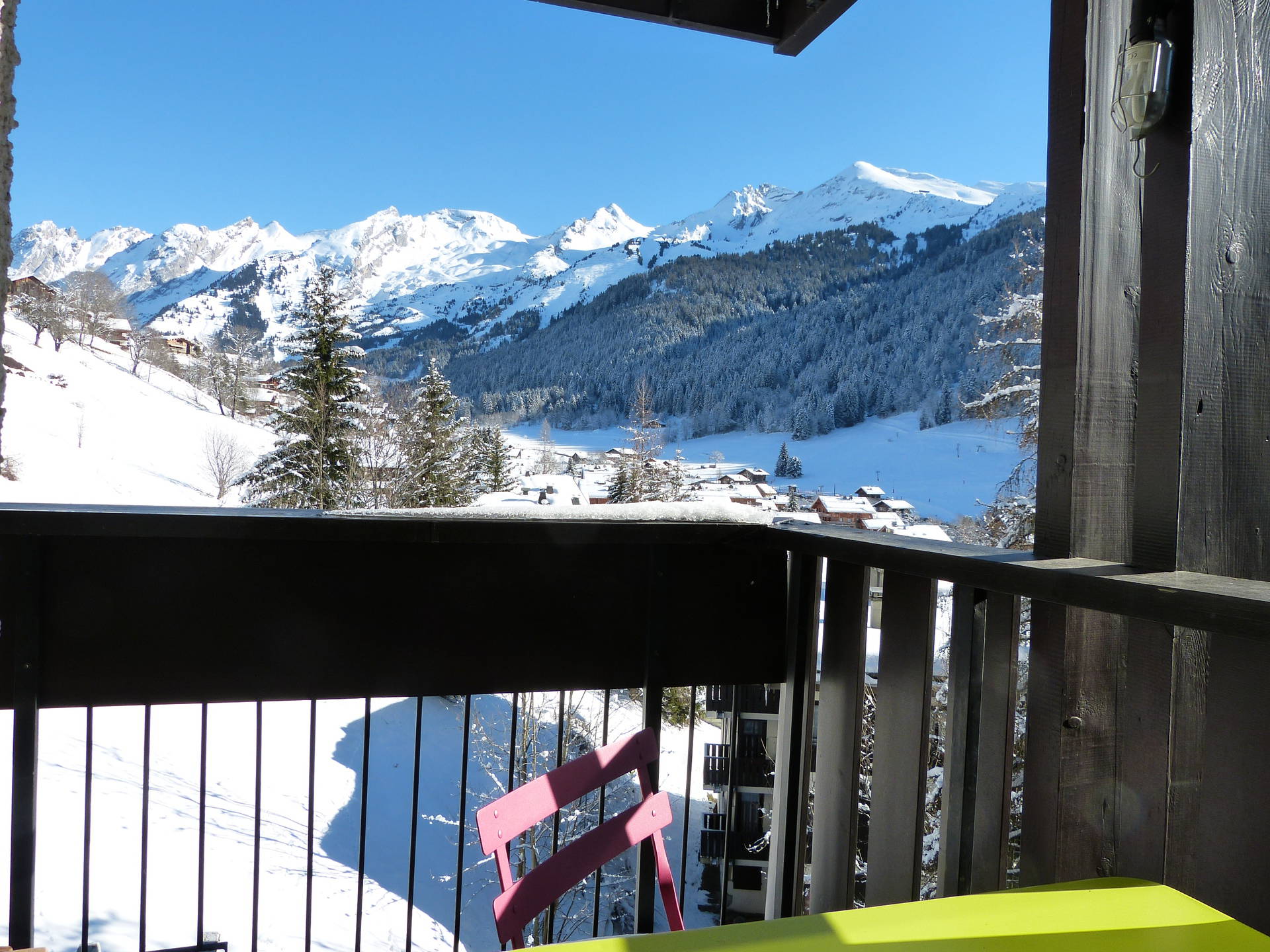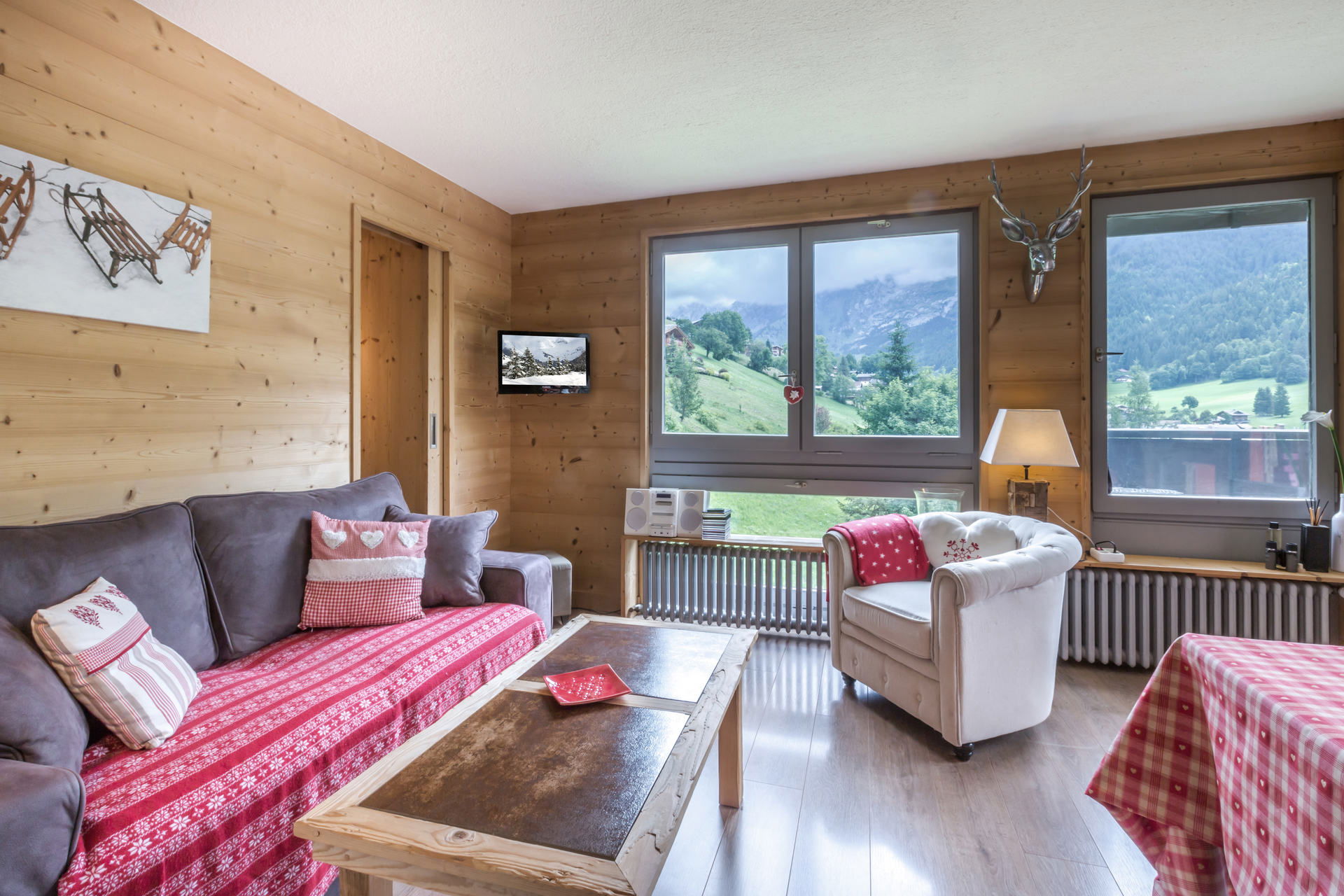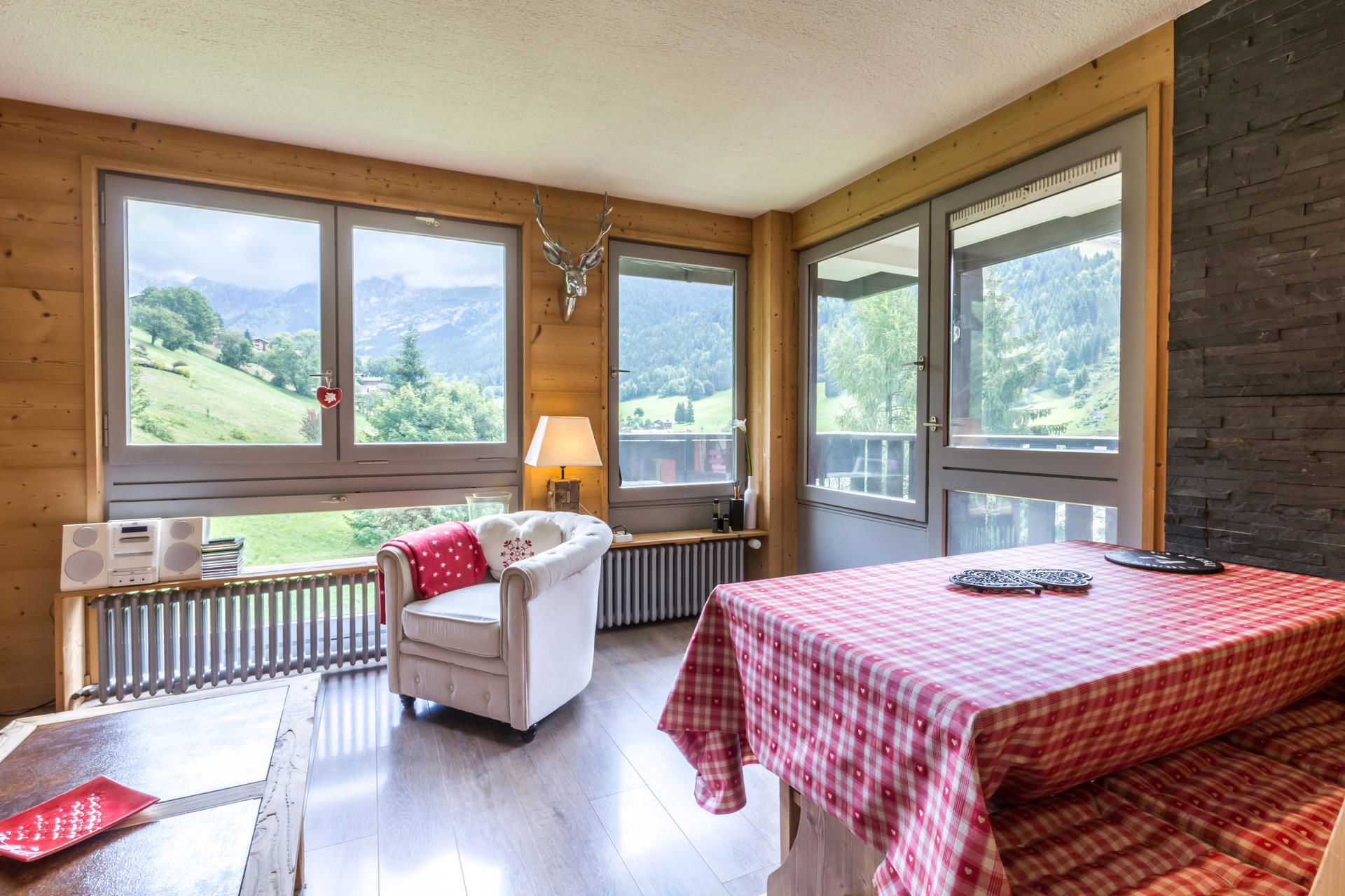 - SEJOUR (13.32 m²) : coin repas, TV écran plat, fenêtres est, porte-fenêtre + balcon sud-est, vue station / montagne