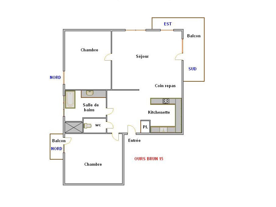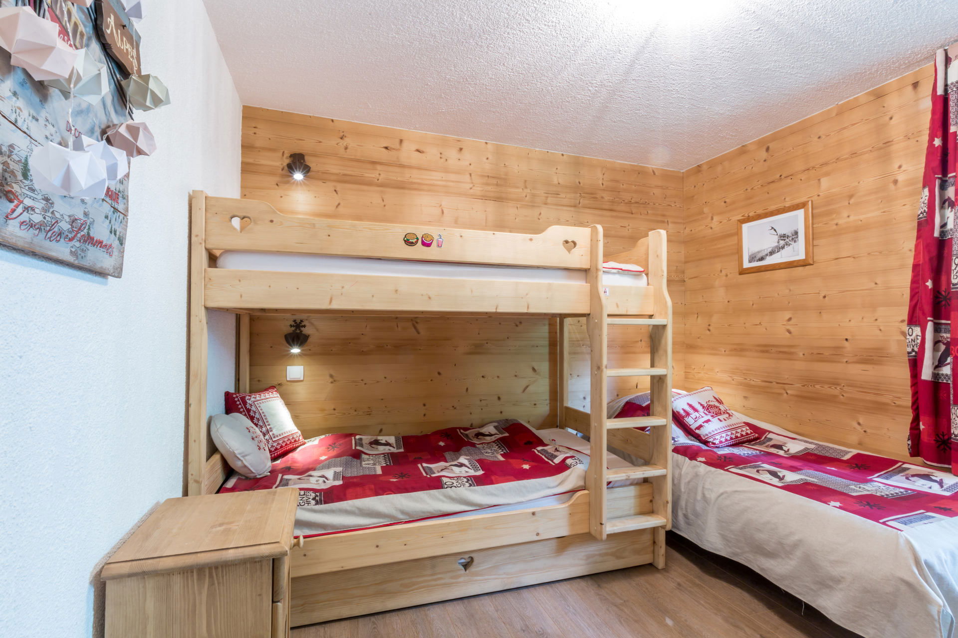 - CHAMBRE (9.70 m²) : 2 LITS SUPERPOSES (90) -> lit supérieur interdit -6 ans + 1 LIT TIROIR 1 PLACE + 1 LIT 1 PLACE (80), porte-fenêtre, petit balcon nord, vue sur arrière résidence / route de la Piscine