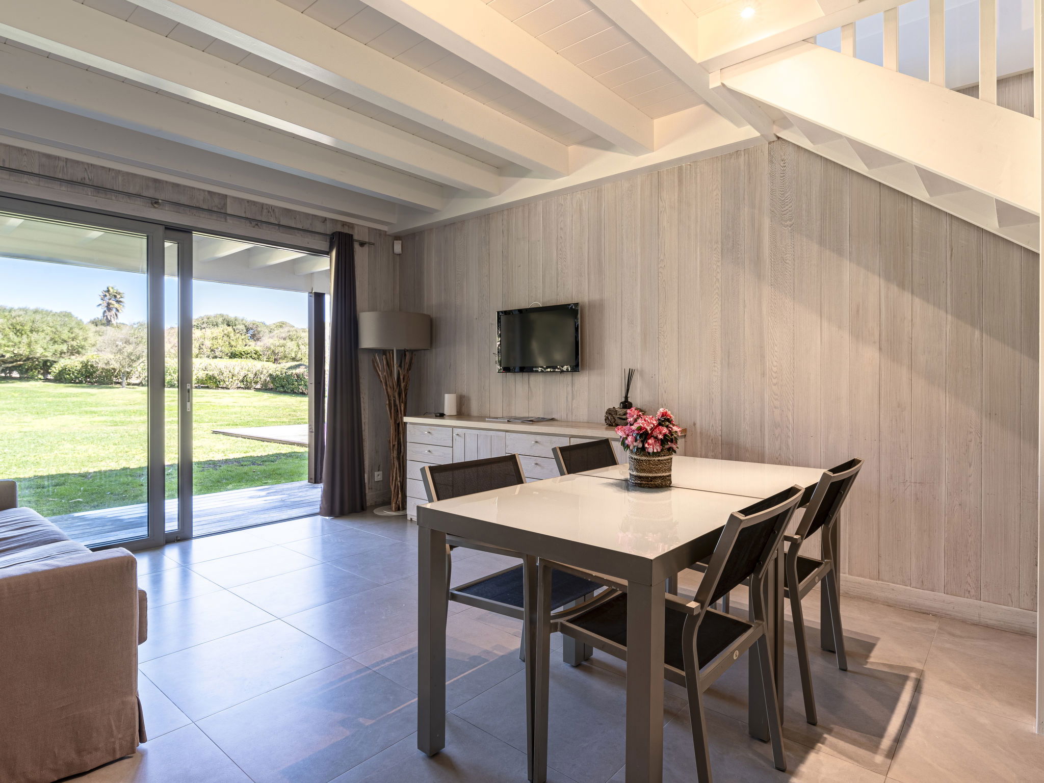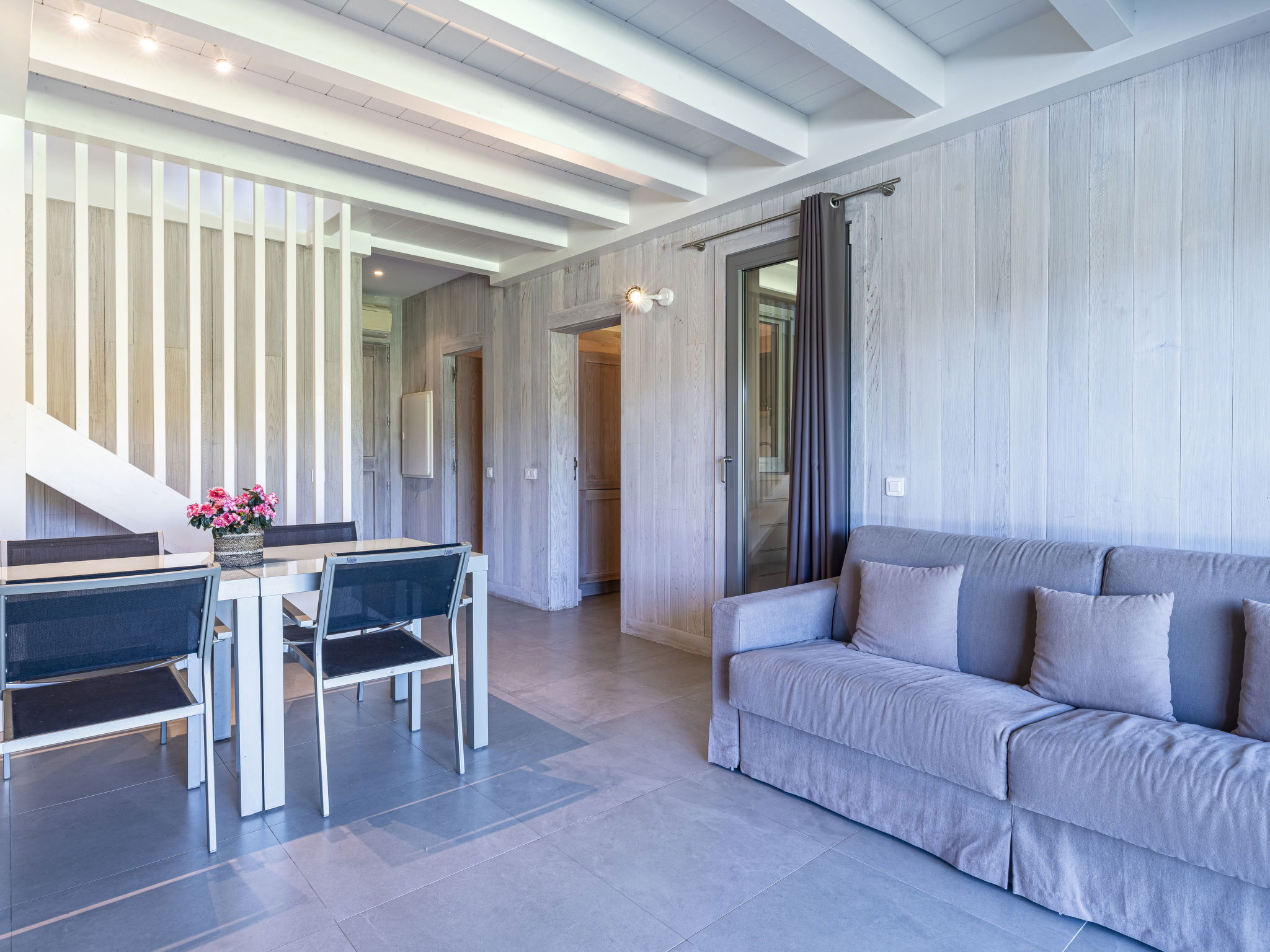 Sortie sur le jardin, sur la terrasse, sur la piscine. 1 chambre avec 1 x 2 lits superposés (90 cm, longueur 190 cm). Cuisine ouverte (four, lave-vaisselle, 4 plaques à induction). Douche/WC. Air-conditionné. Petite terrasse 4 m2. Meubles de terrasse, chaises longues (2).