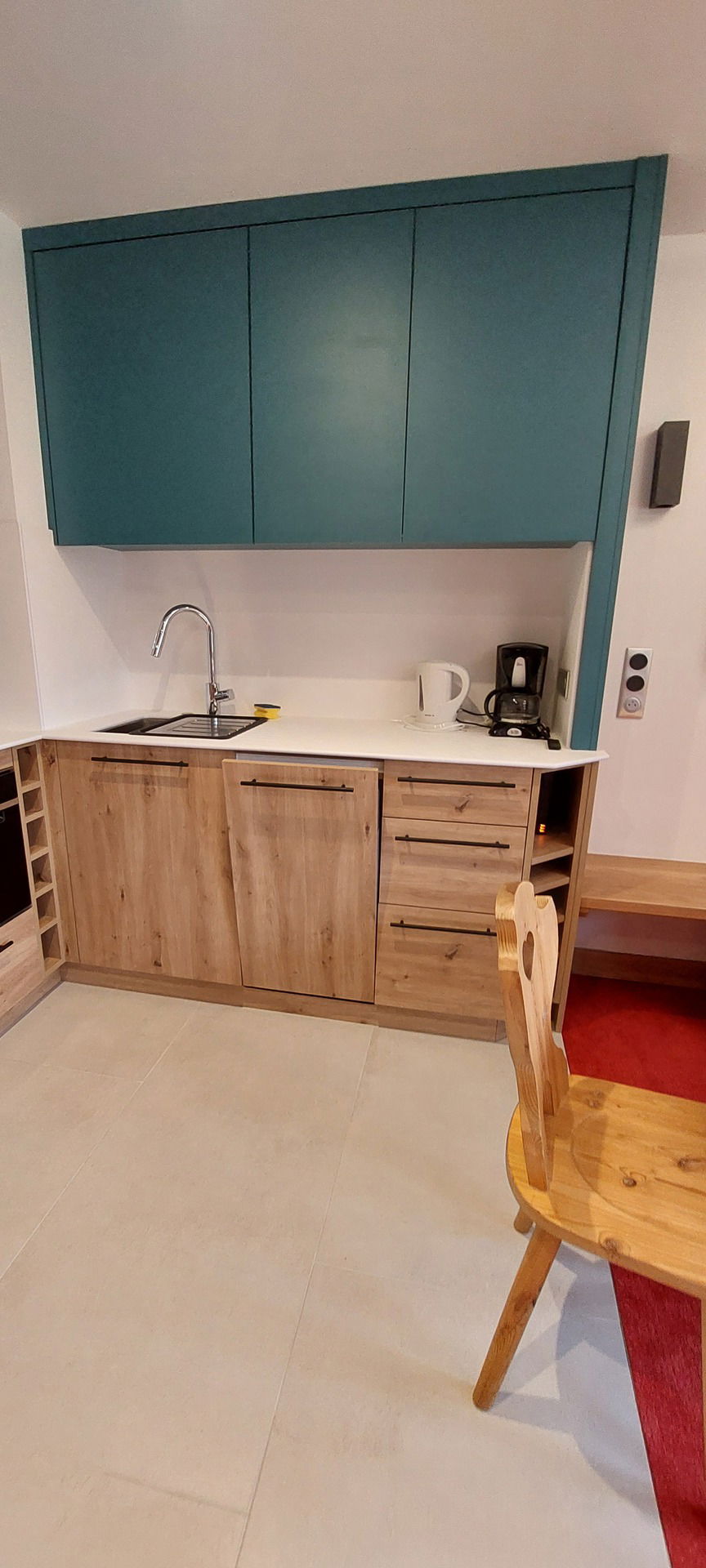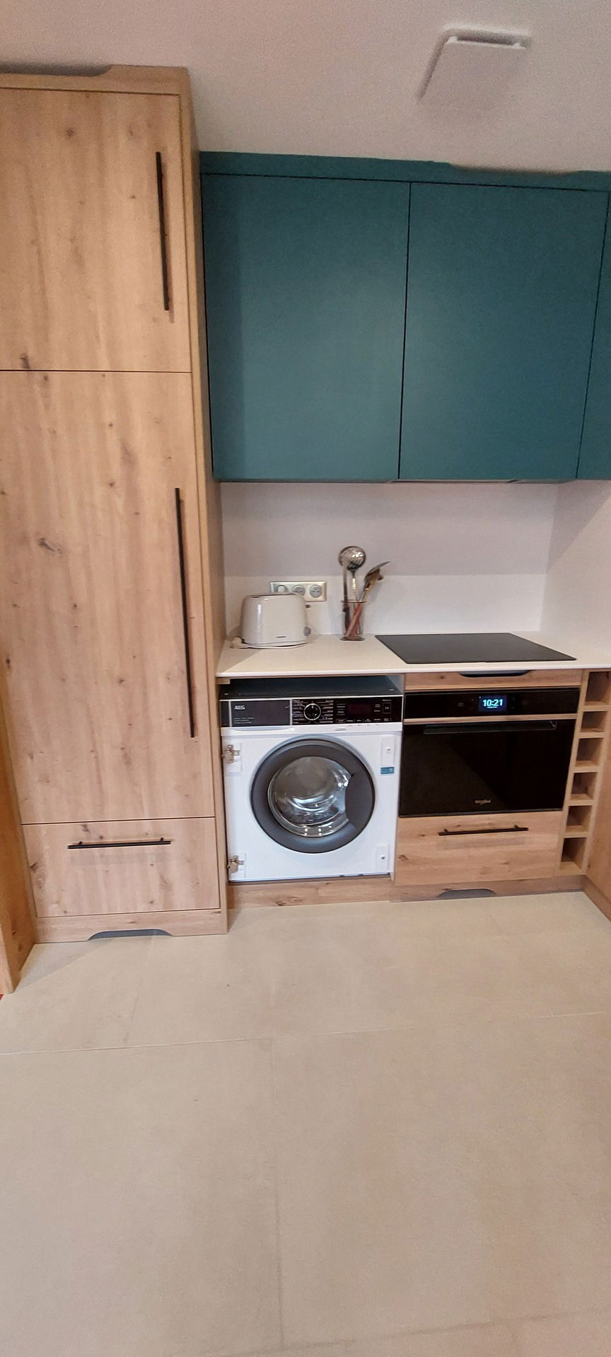 Equipée d'un micro-ondes avec grill, lave-vaisselle, réfrigérateur avec freezer, plaque induction, hotte aspirante et lave linge séchant