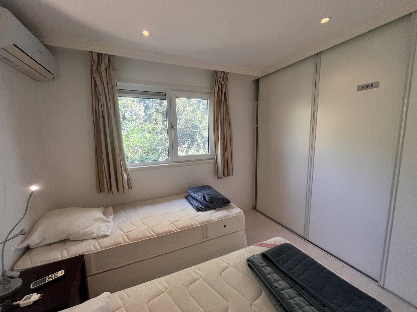 Chambre 2- clim : 2 lits en 90 pouvant se rapprocher, armoire de rangement avec penderie.