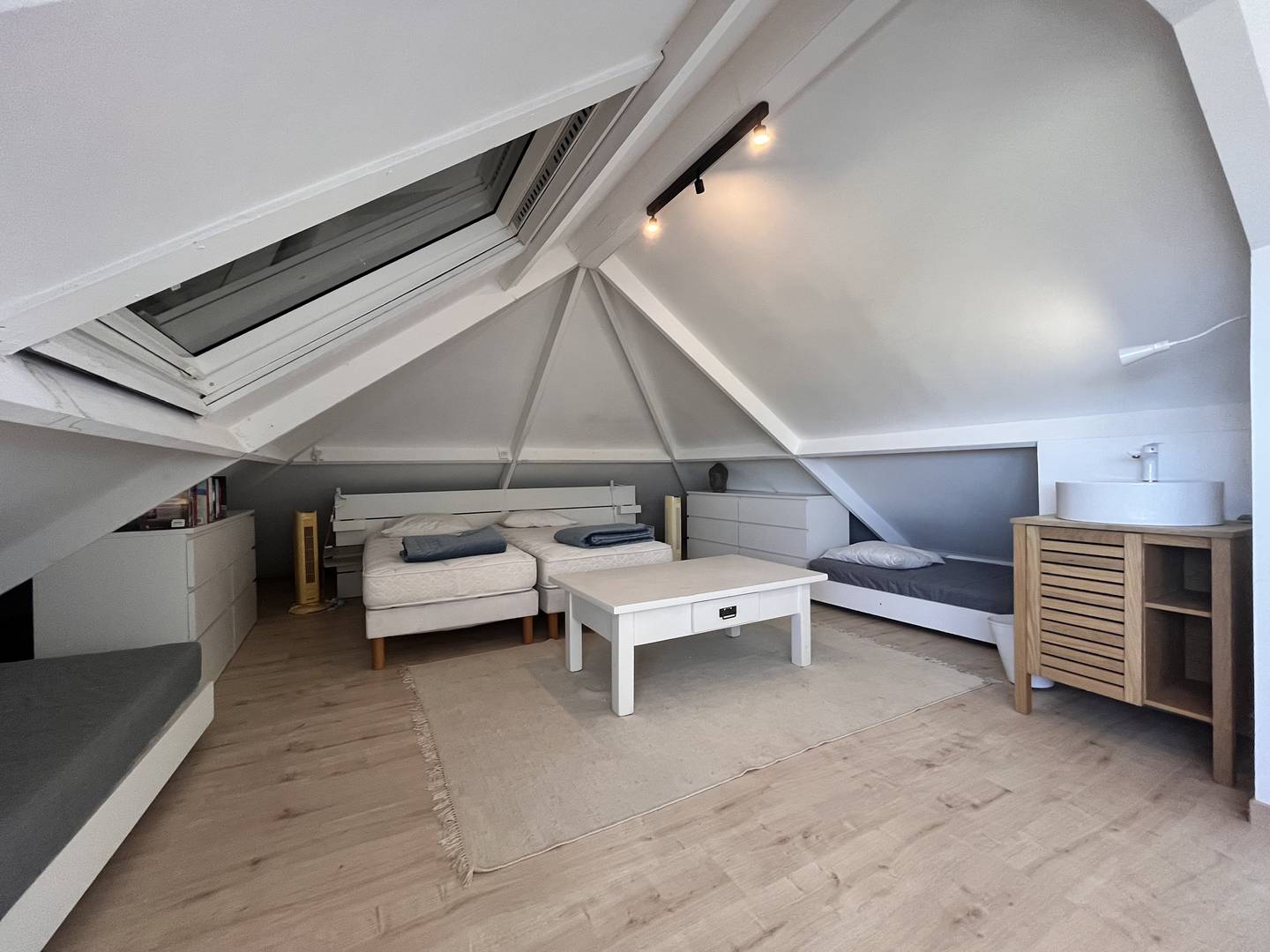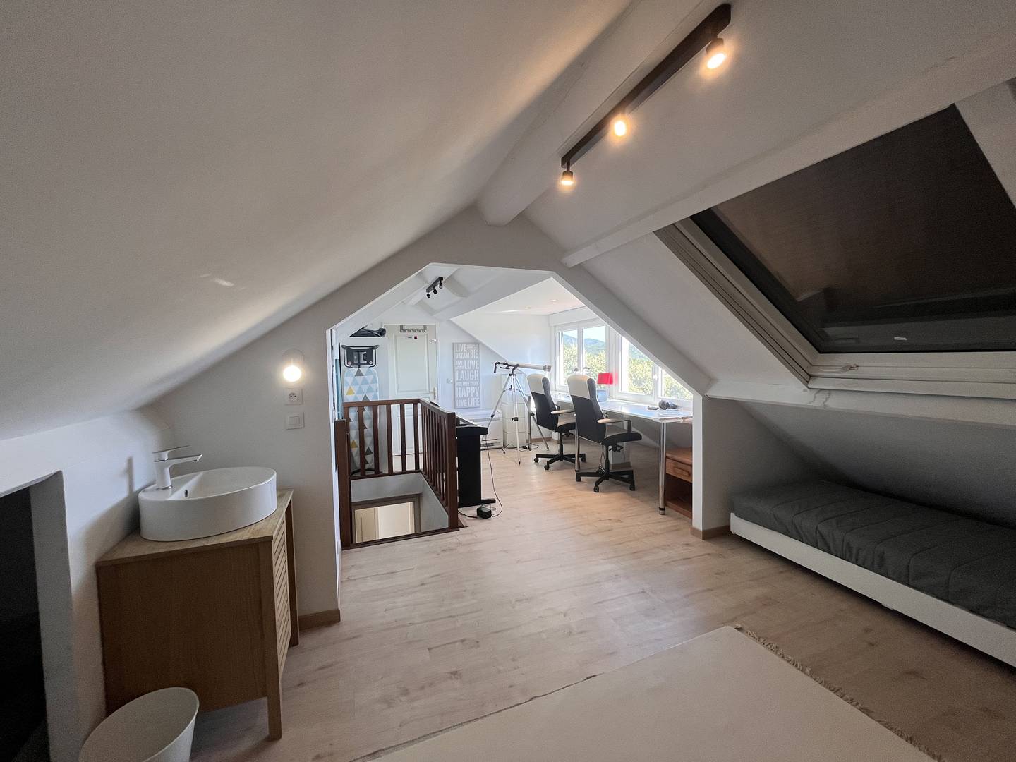 A l'étage : en mezzanine sous les toits (clim) : chambre avec 2 lits en 90 pouvant se rapprocher, + 2 lits en 90, commode et armoire de rangement.