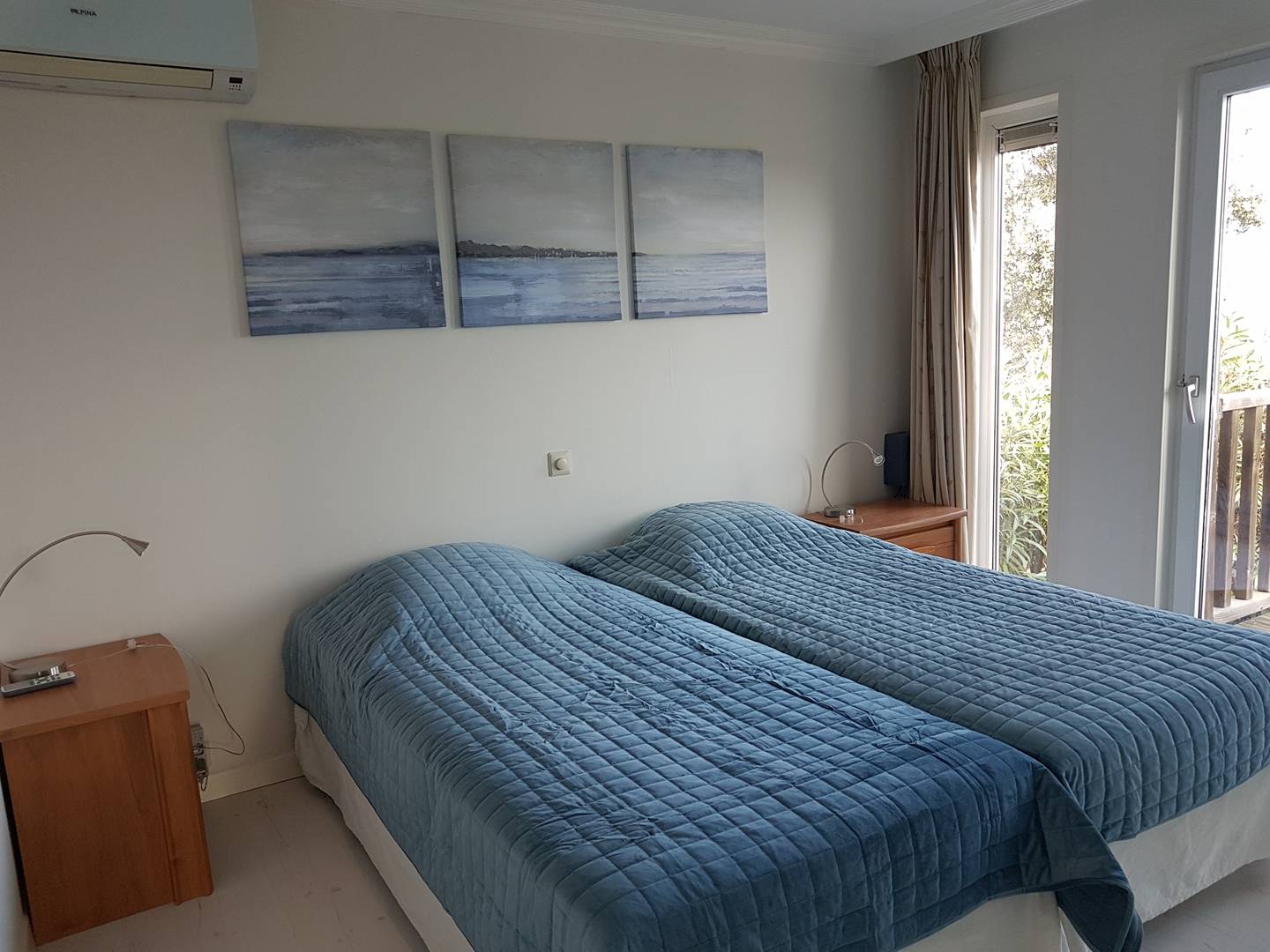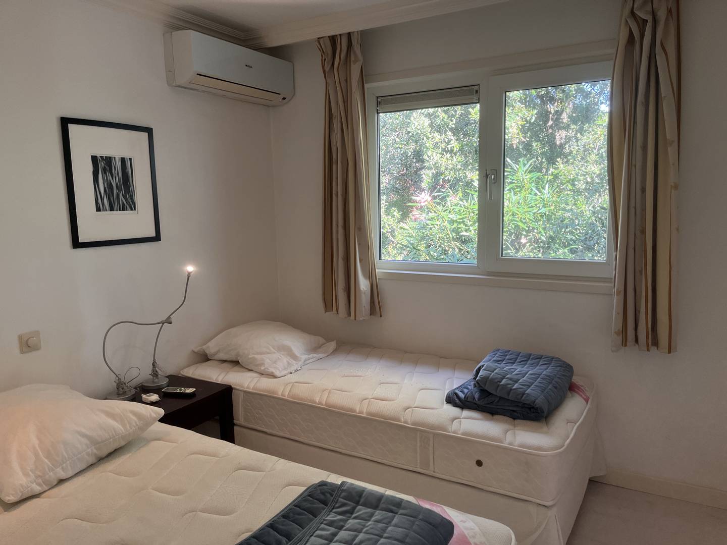 Chambre 1- clim : 2 lits en 90 pouvant se rapprocher, armoire de rangement avec penderie.