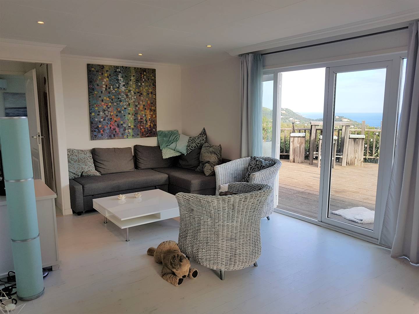 Baie vitrée donnant sur grande terrasse aménagée avec vue imprenable sur la baie : salon de jardin en teck, chaise longue, parasol ... (barrières de sécurité amovibles)