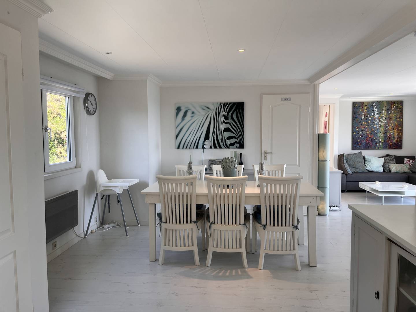 Entrée sur séjour avec cuisine ouverte, entièrement équipée : plaque vitrocéramique, combiné frigo-congélateur, lave-vaisselle, lave-linge, combiné four électrique-micro-onde, bouilloire, hotte, grille-pain, cafetière dolce gusto et cafetière classique...