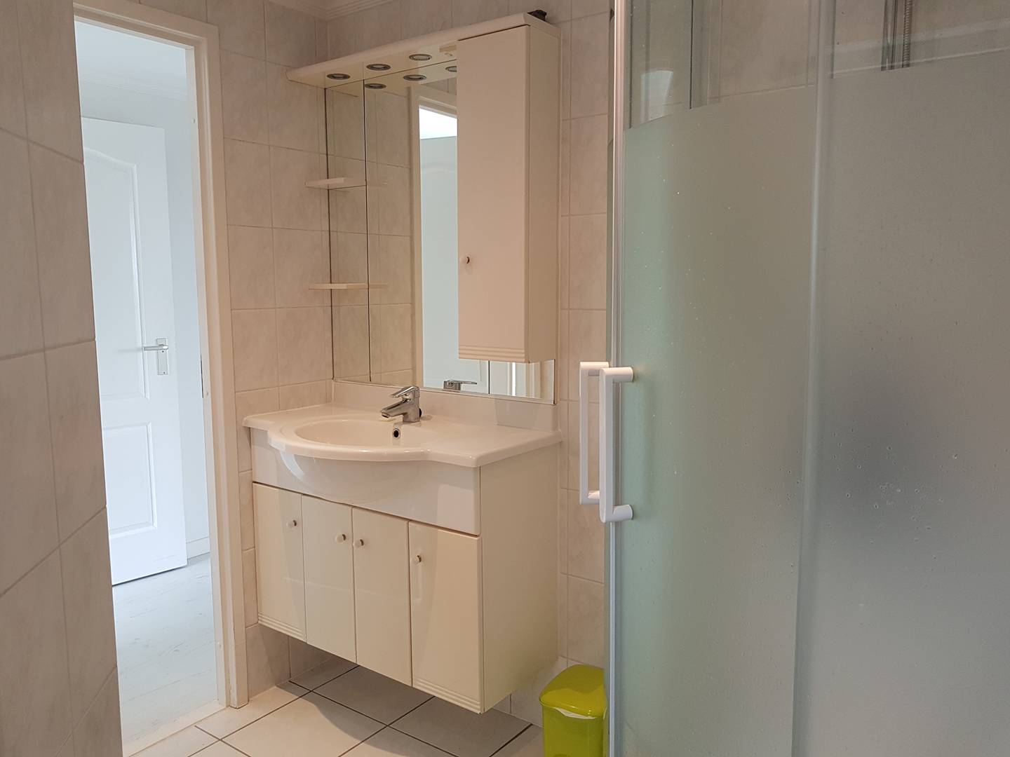 salle d'eau : douche, vasque, Wc, sèche-serviettes.