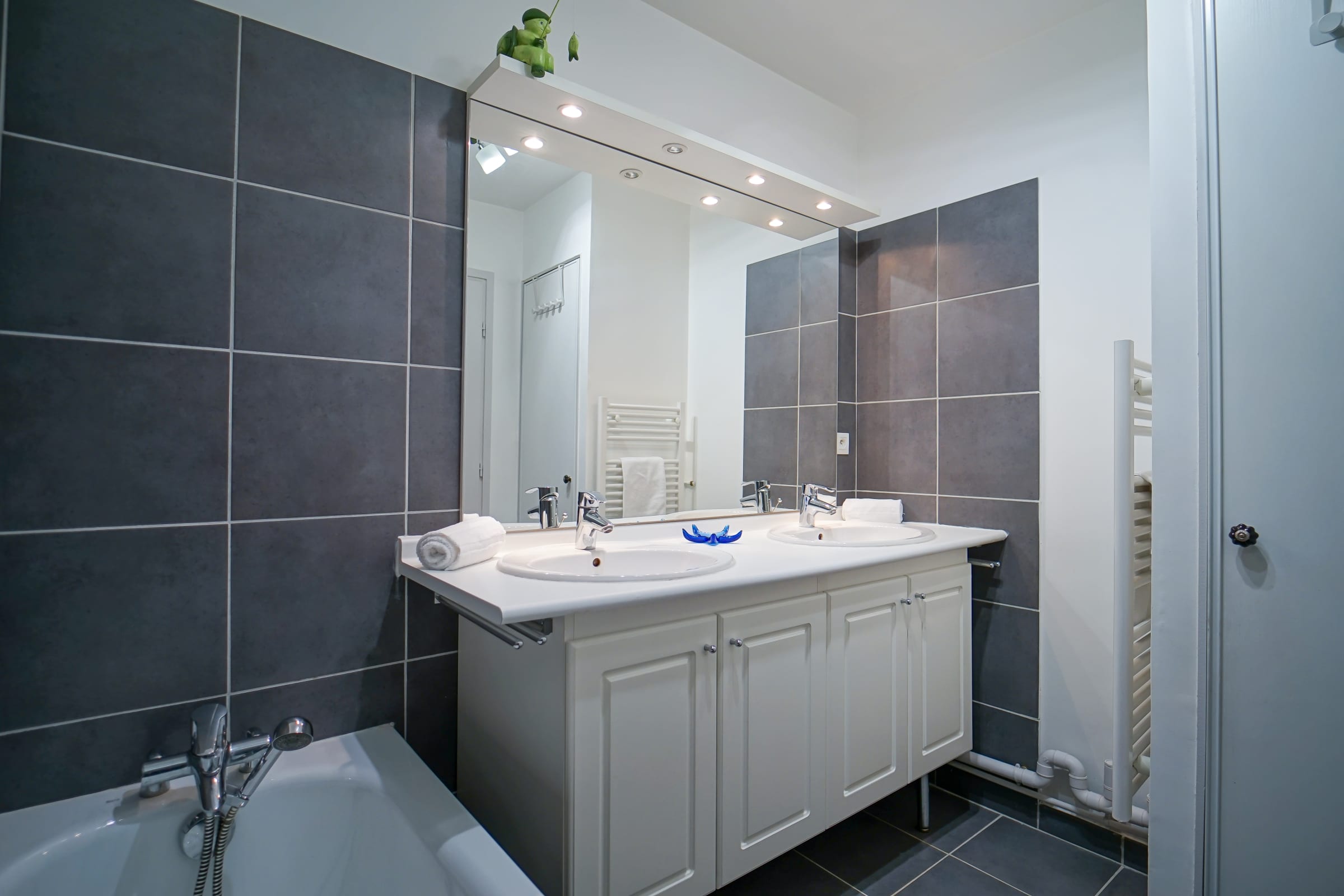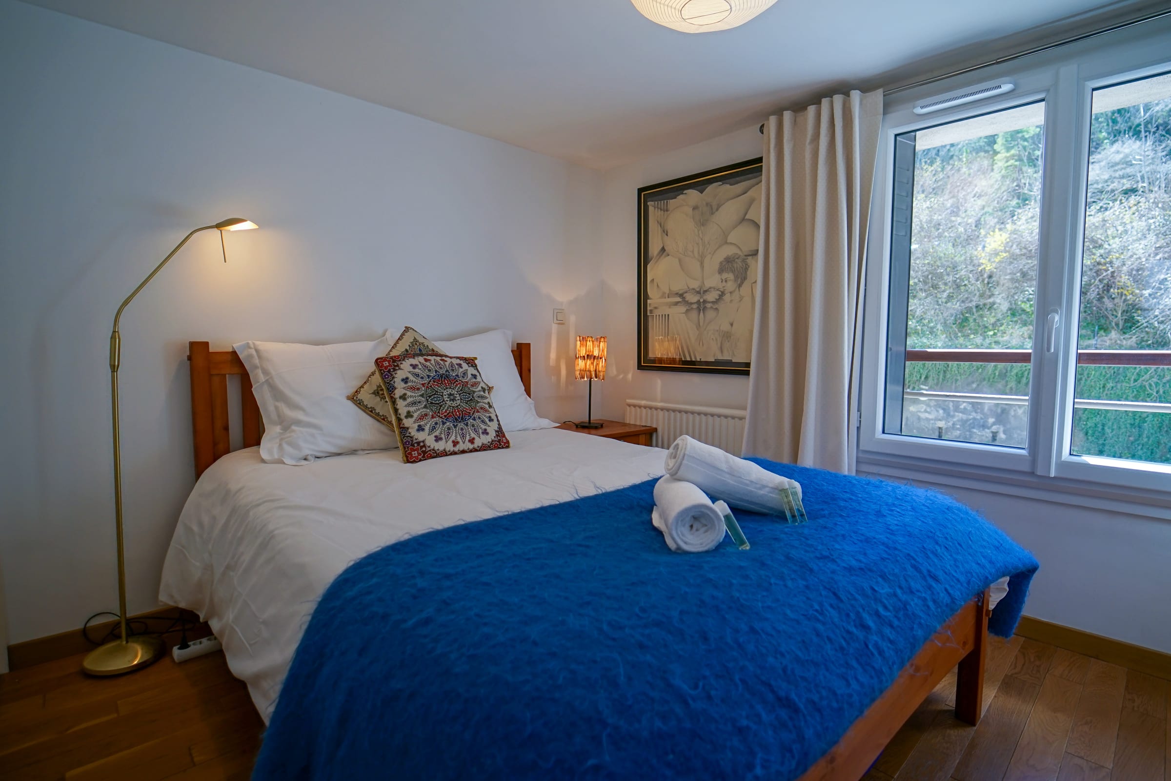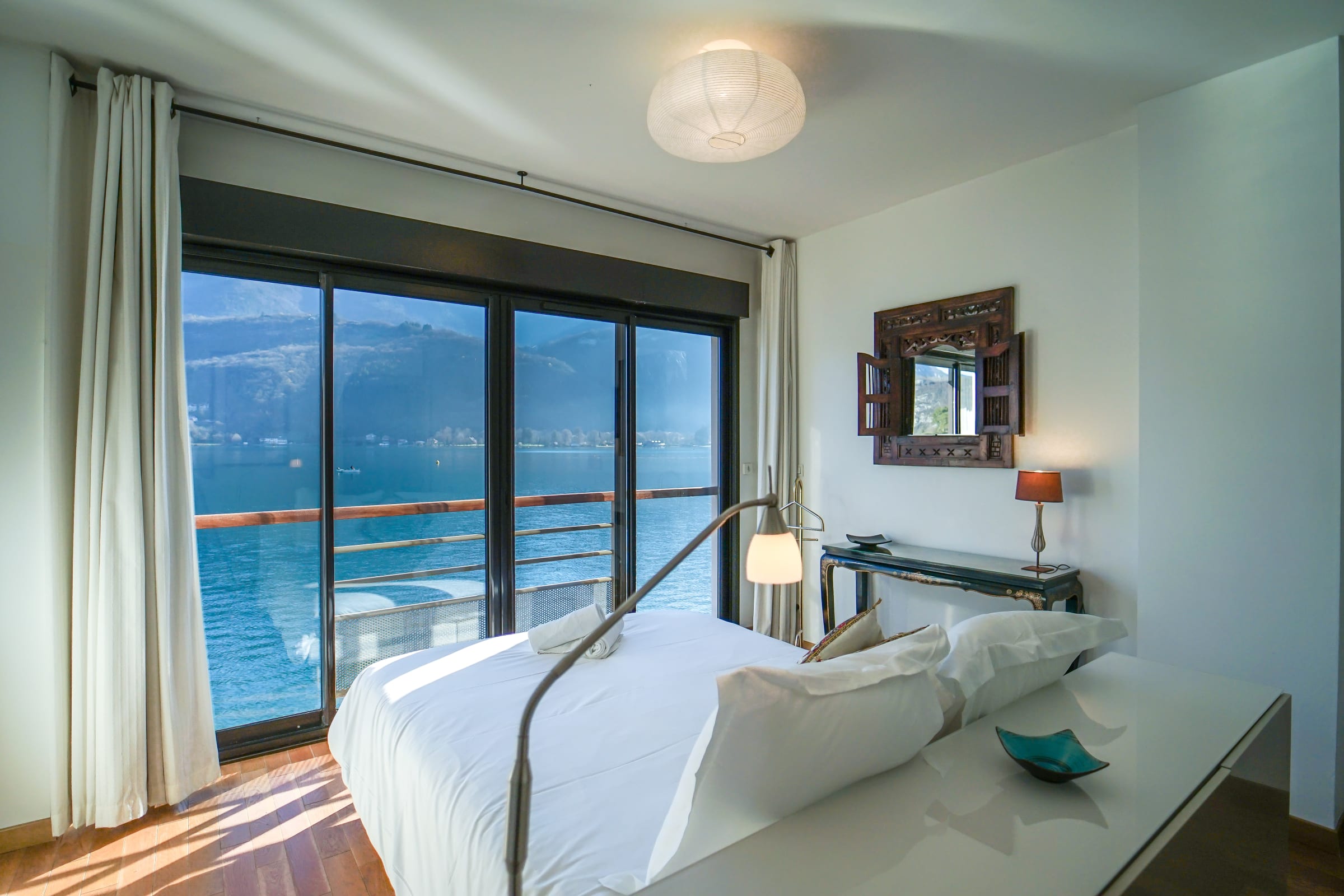 La première chambre est équipée d’un lit double 160x200cm, avec une baie vitrée donnant sur le lac et les montagnes, profitez d’une vue spectaculaire dès le réveil ! La deuxième chambre est équipée d’un lit double 140x200cm, la troisième possède 2 lits simples 80x200cm, idéal pour les enfants. Toutes les chambres sont équipées de rangements pour vos effets personnels.