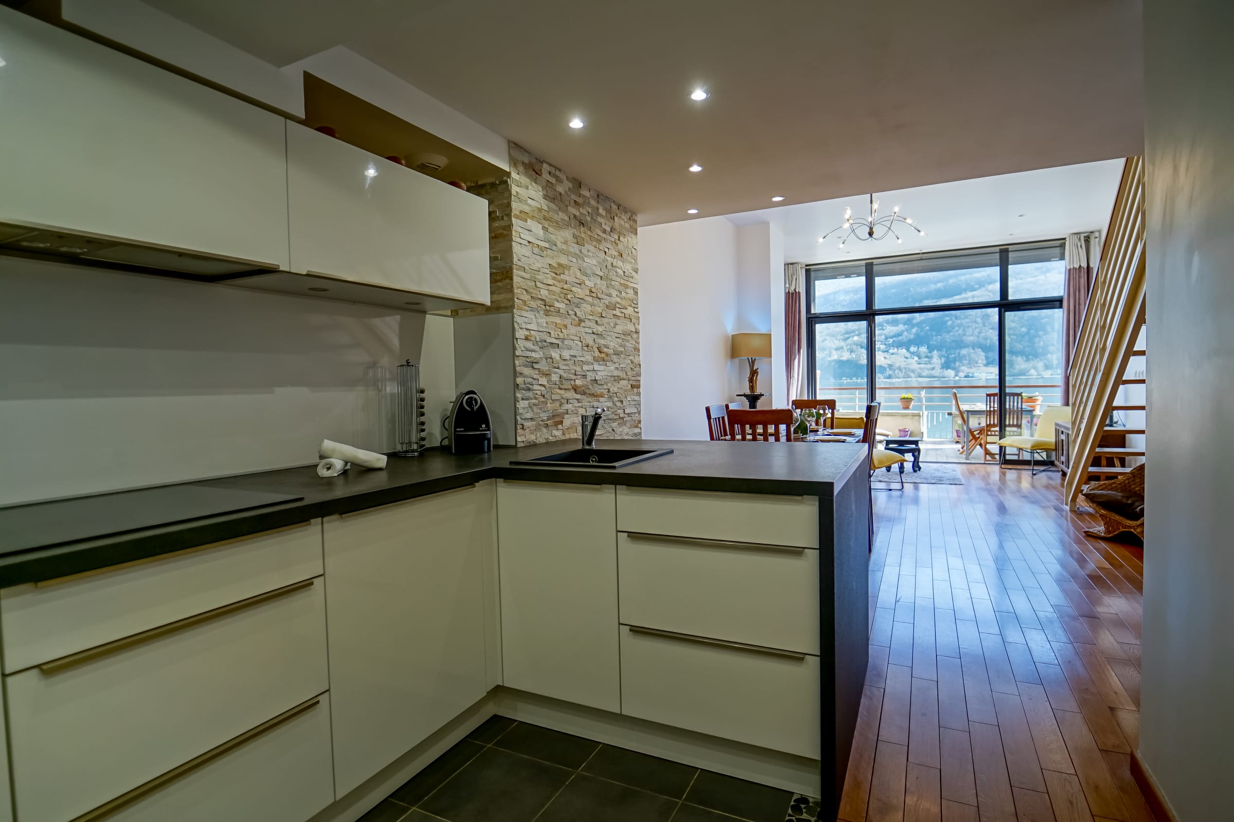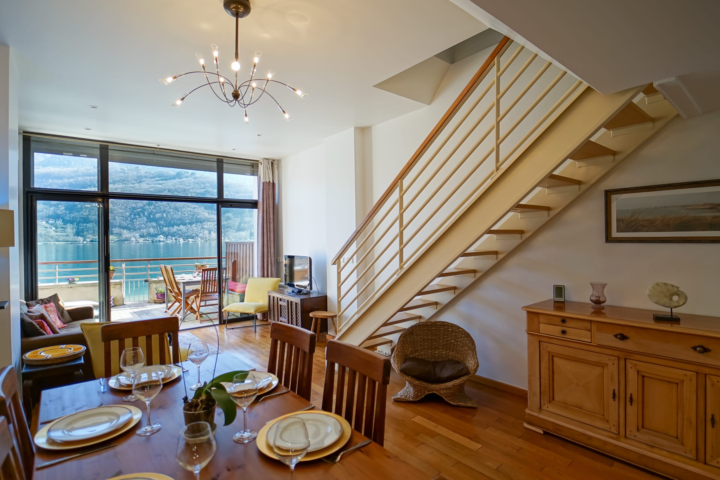 Découvrez un appartement atypique en duplex avec vue sur lac et montagnes dans une résidence avec plage privée !