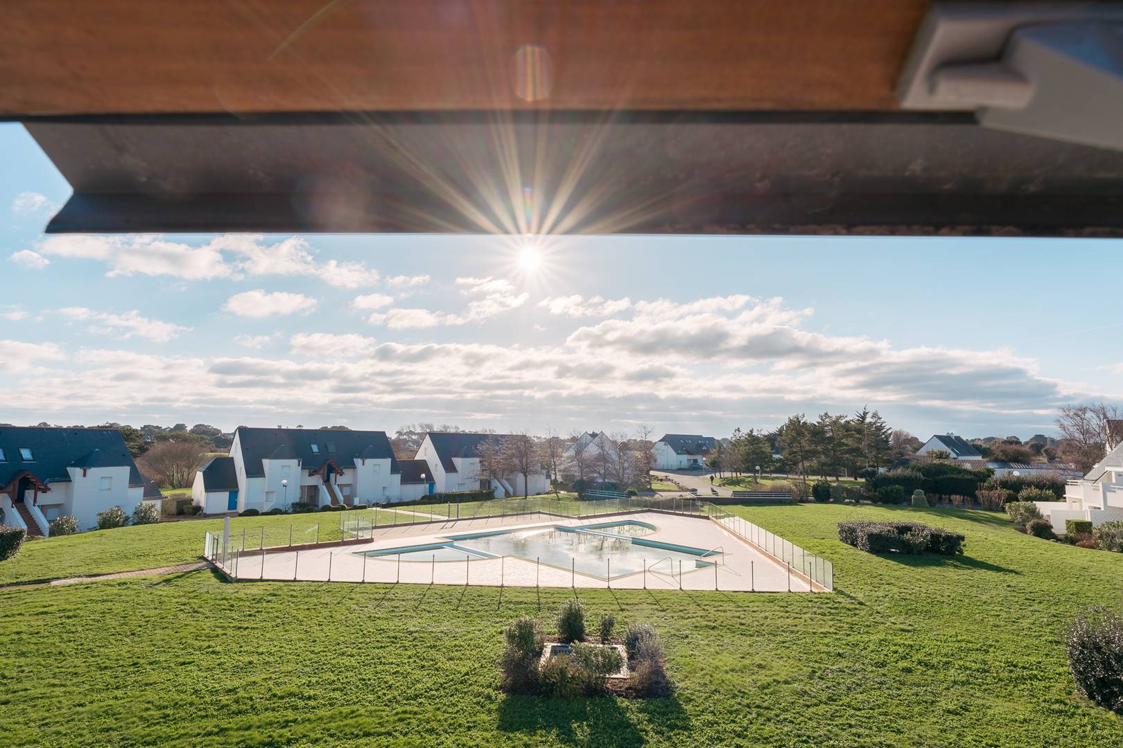 - Séjour avec partie repas (table et chaises) et partie salon (TV, canapé convertible clic-clac: couchage 2 personnes, couverture) donnant sur balcon exposé Sud(meubles de jardin) et avec vue sur le jardin et sur la piscine de la résidence