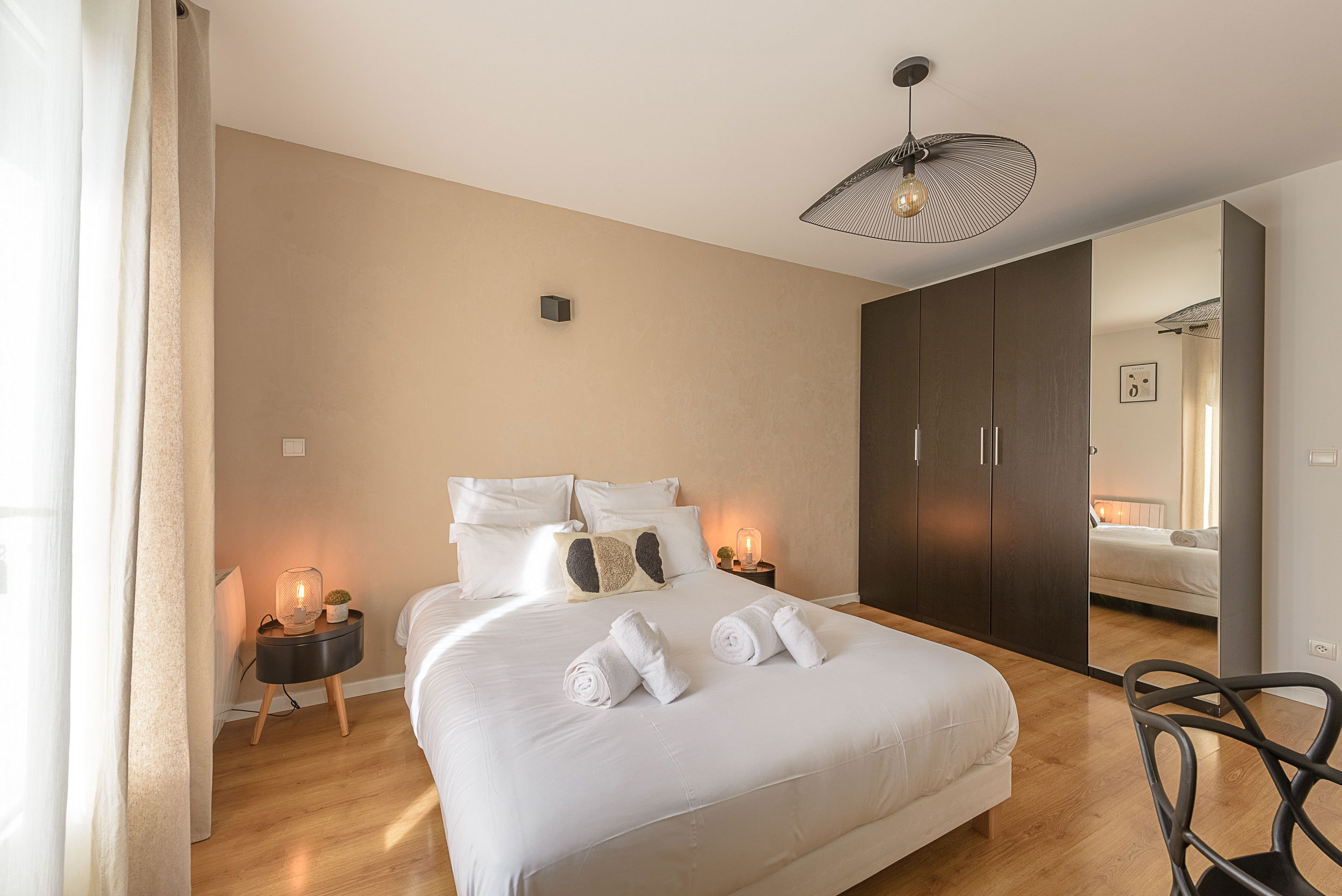 - Chambre n°1 : lit double, armoire de rangement, bureau, accès à la terrasse ensoleillée