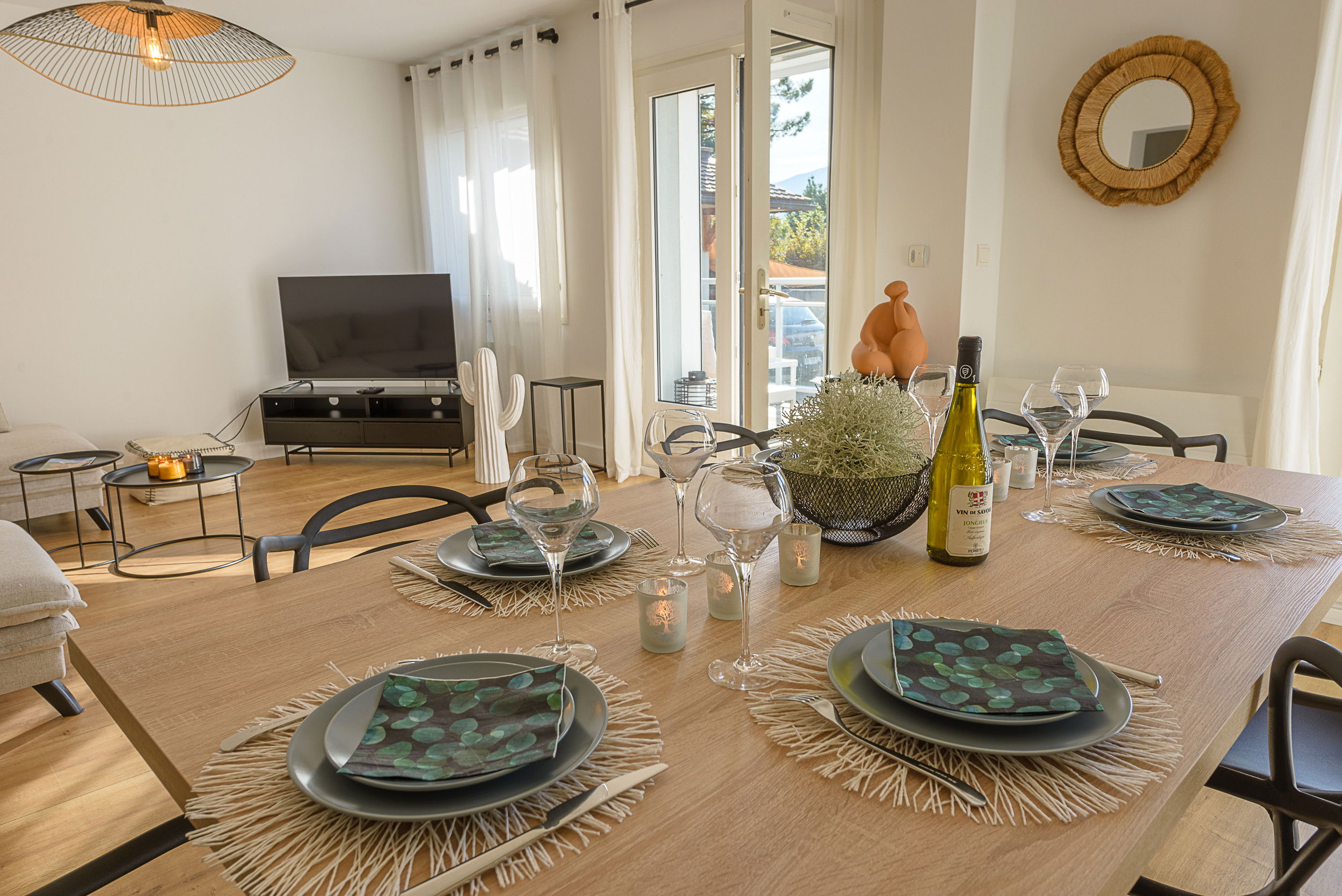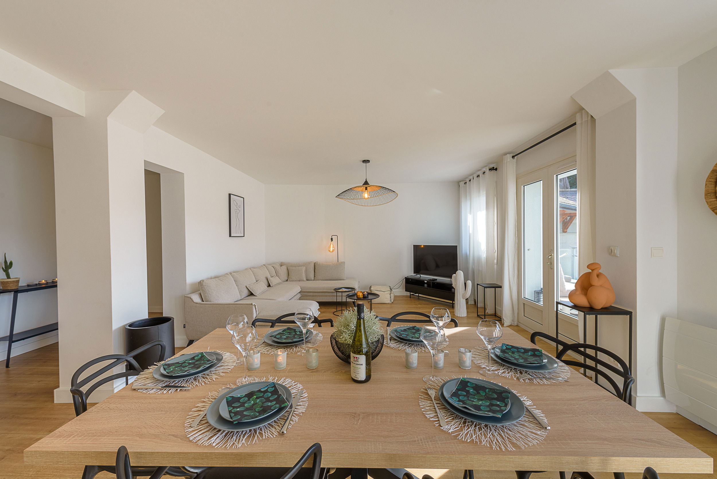 - Belle et spacieuse pièce à vivre lumineuse, coin salon TV, coin salle à manger, et une cuisine entièrement équipée, ouverte sur le séjour, le tout ayant un accès à la terrasse avec vue sur le lac et sur la piscine