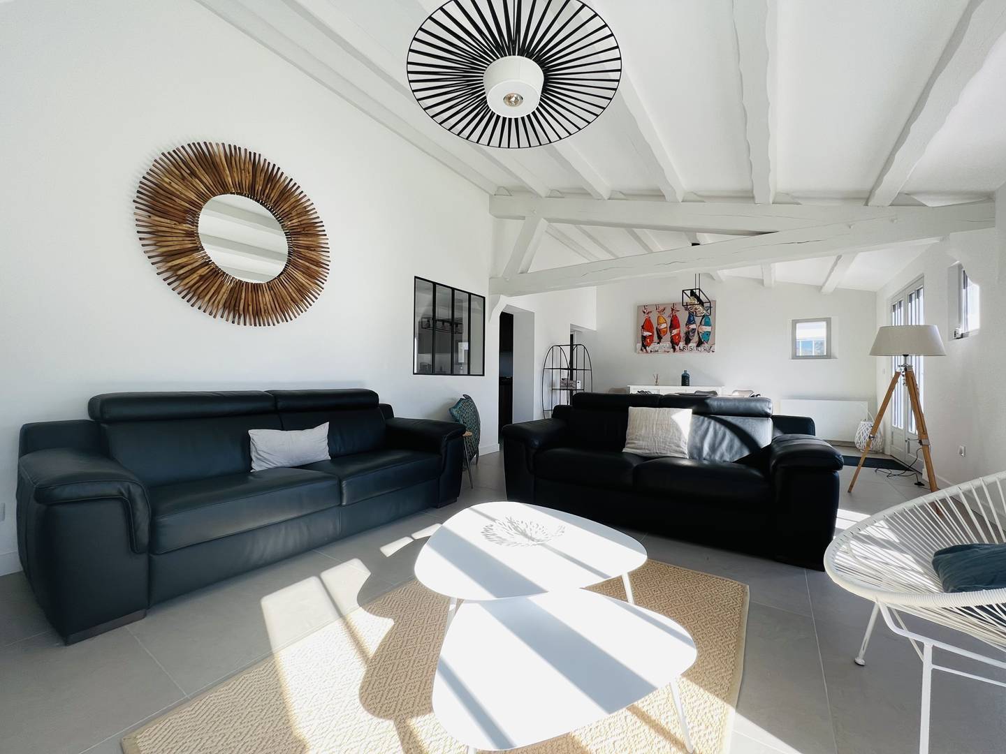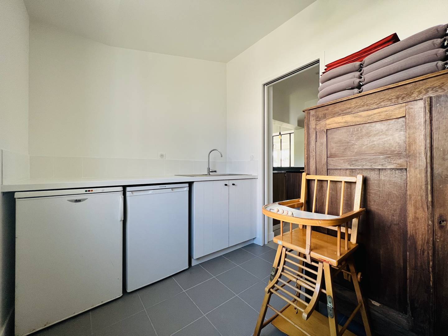 Cette villa d'architecte saura vous séduire avec son espace salon invitant à la convivialité et la cuisine aménagée parfaitement équipée. La villa présente de nombreux rangements et une buanderie avec lave-linge et sèche-linge.