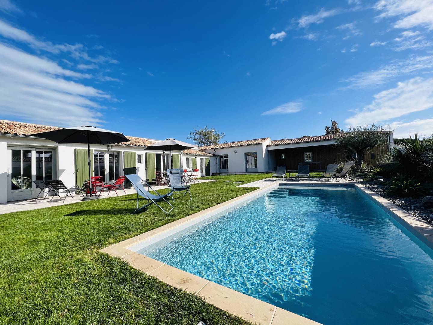 Vous apprécierez les volumes des espaces de vie ouverts sur le jardin avec terrasse, salon de jardin, préau d'été avec plancha permettant de déjeuner/dîner dehors, et espace piscine avec transats. La piscine est chauffée (d'avril à octobre selon la météo) et sécurisée par un volet électrique.