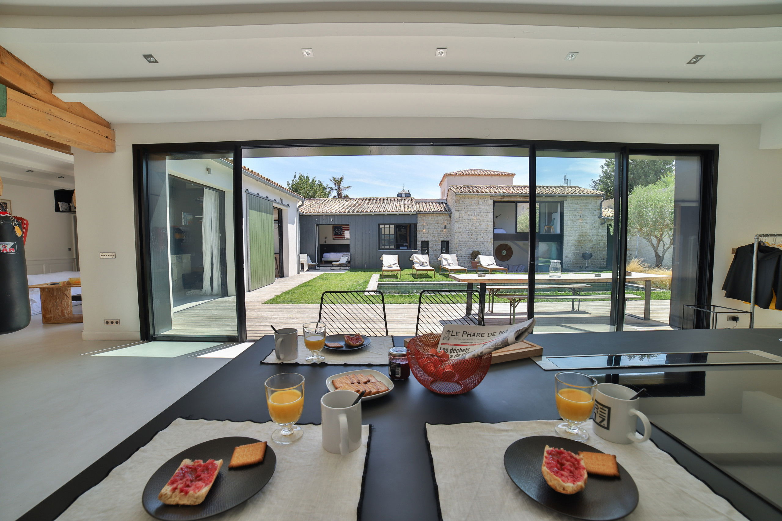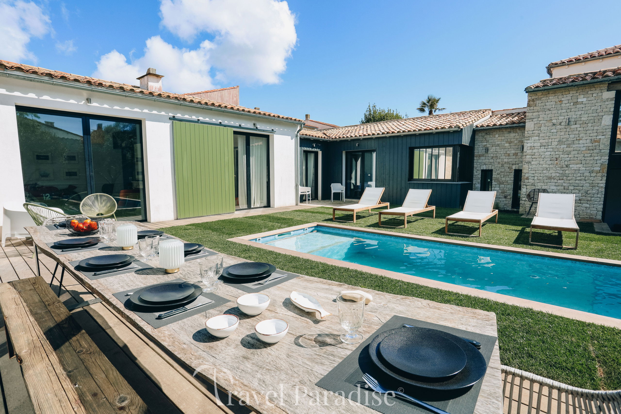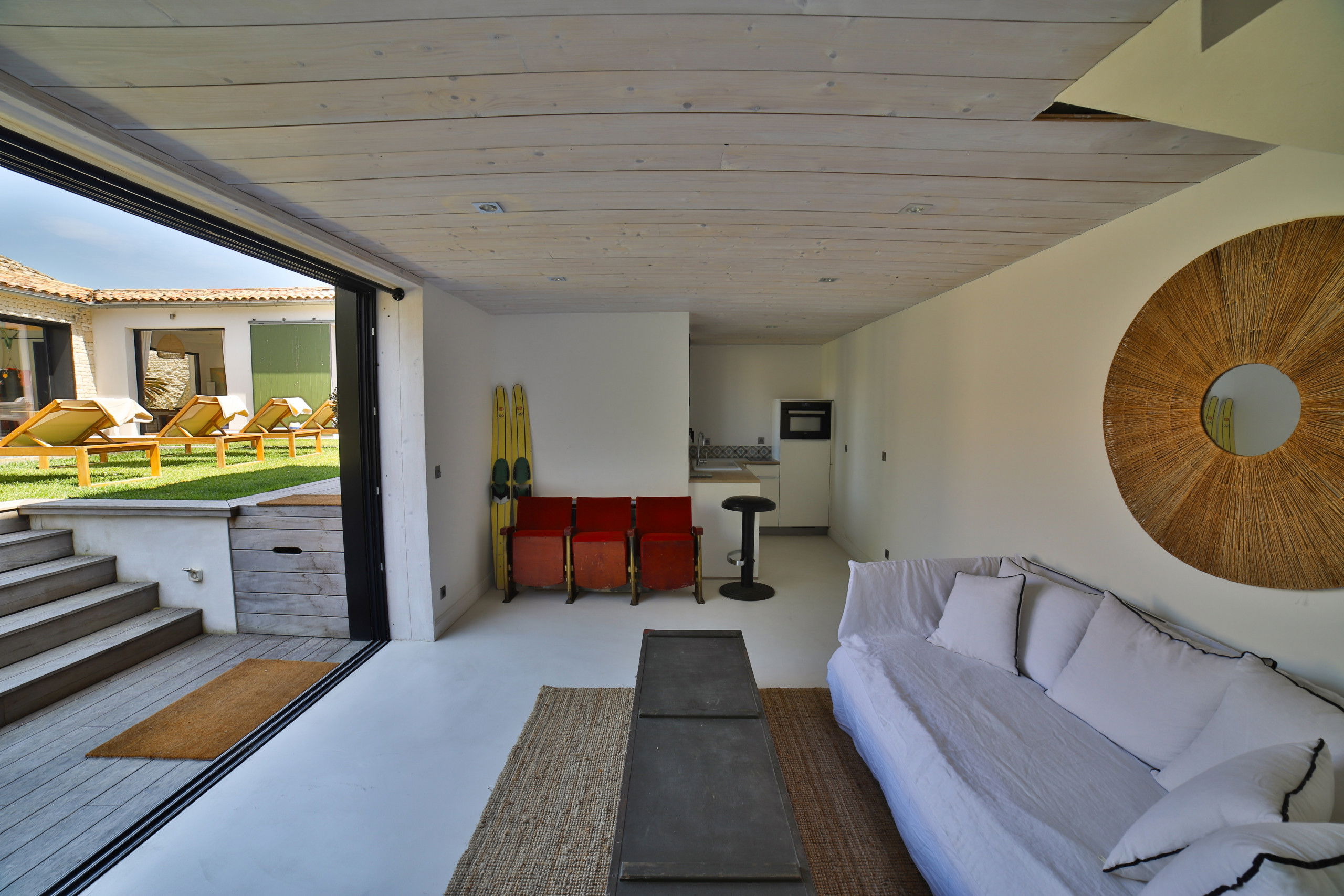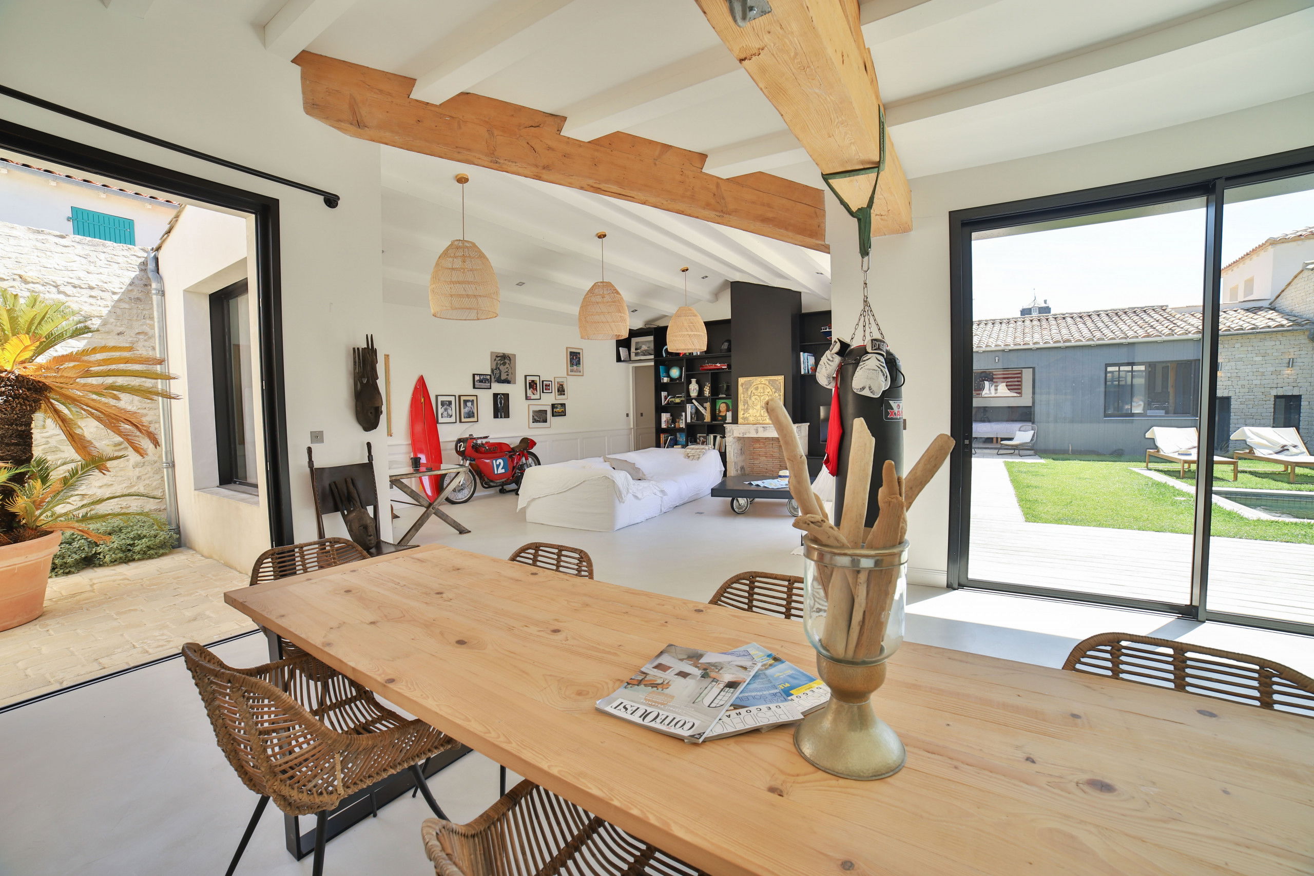 La villa situé sur l'île de Ré à Saint Martin vous séduira pour passer des vacances entre amis ou en famille. Sa grande piscine chauffée en mosaïque et ses espaces de vie entièrement ouverts sur l'extérieur fond de cette demeure un lieu atypique.