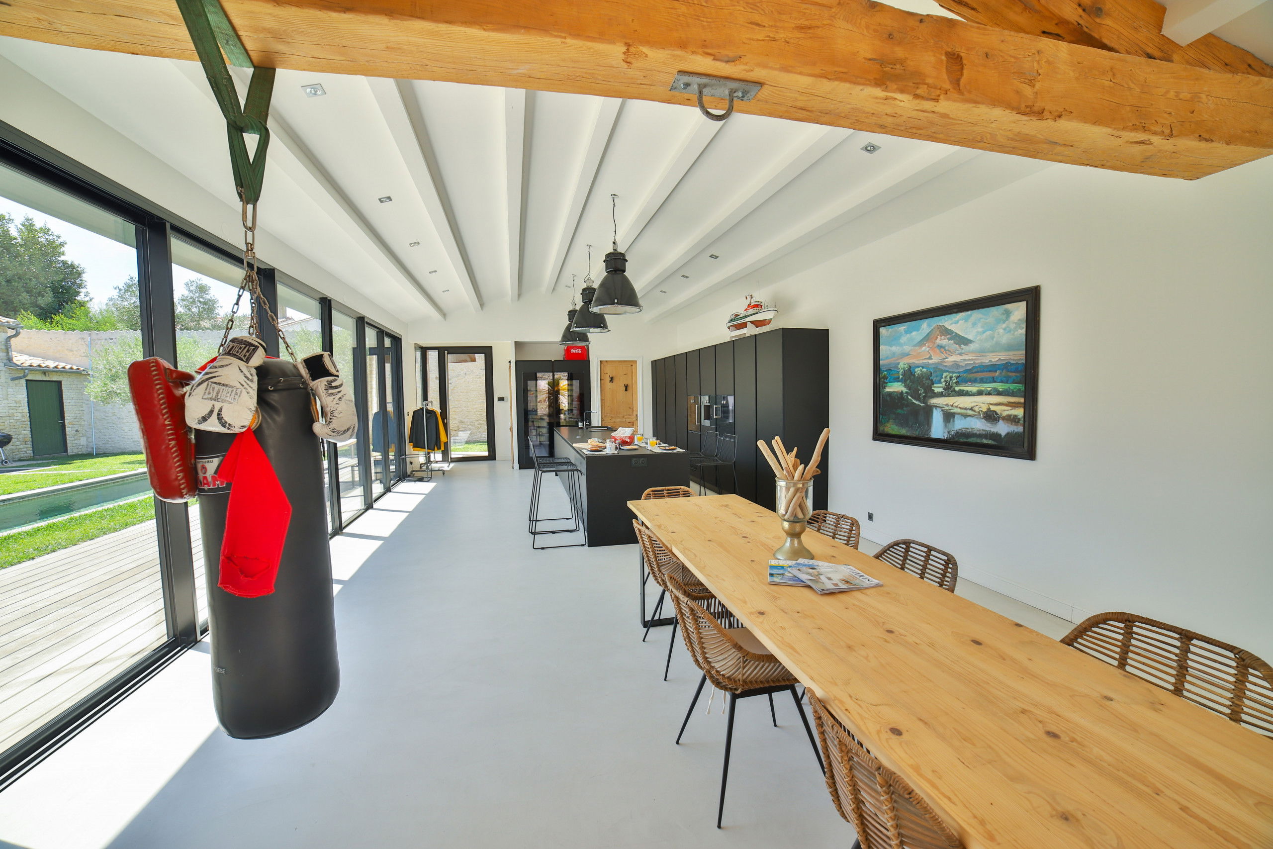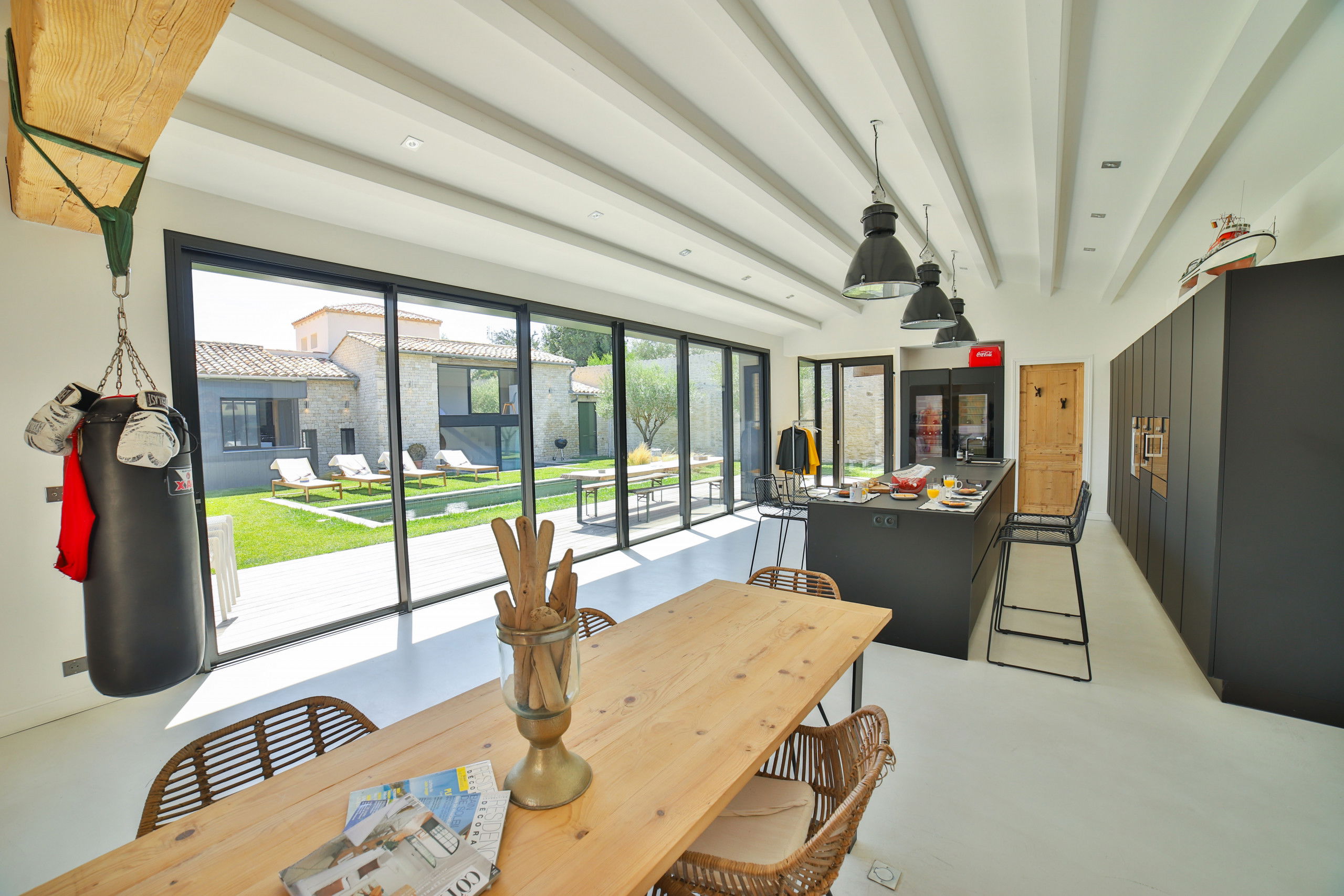 - Une grande cuisine professionnelle ouverte entièrement équipée (double cave à vin, chauffe assiette, four, cafetière Nespresso, etc...)