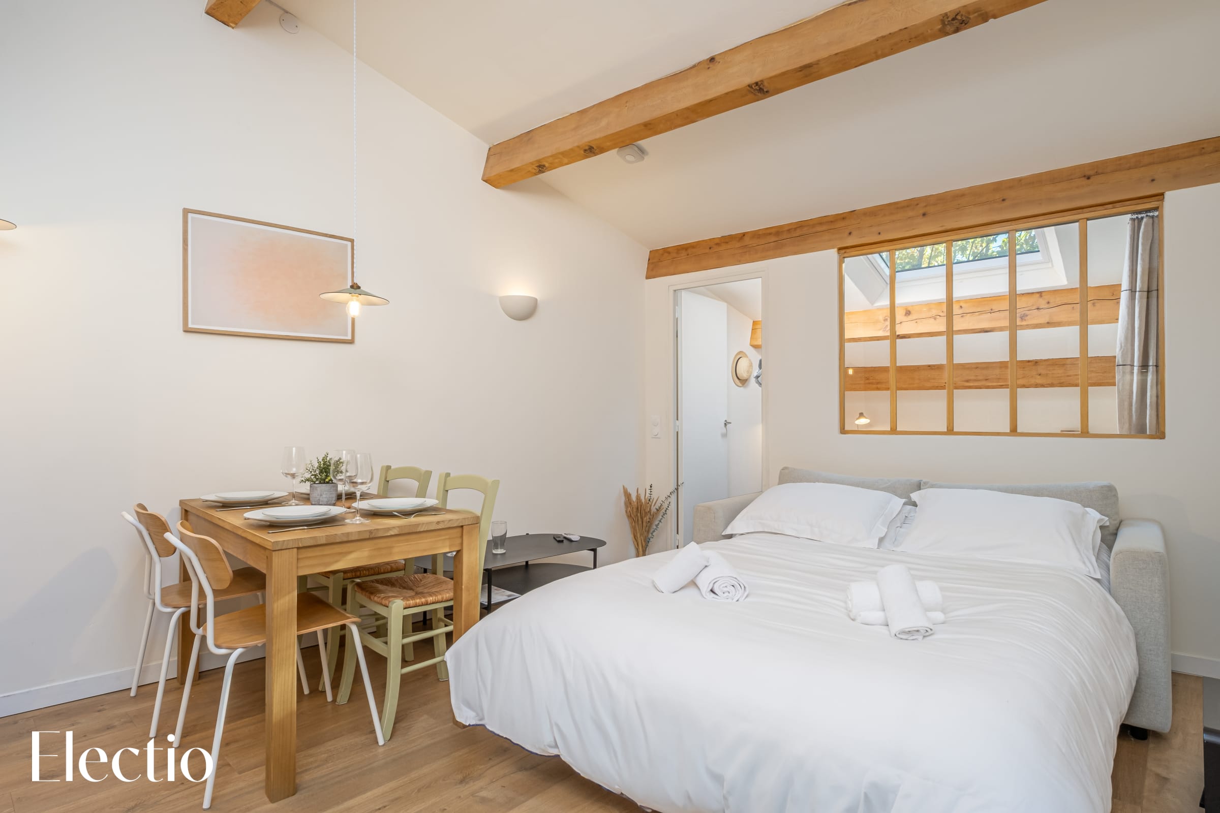 Dans 30m², l’appartement Tourterelle vous offre tout le confort nécessaire avec une décoration naturelle et apaisante. Entièrement meublé et équipé, il peut accueillir jusqu’à 4 personnes avec un salon spacieux s’ouvrant sur la chambre avec une verrière. L’appartement est aussi sensible à l’environnement. Il est économe en énergie et en eau avec son isolation renforcée, sa pompe à chaleur réversible et sa robinetterie innovante.