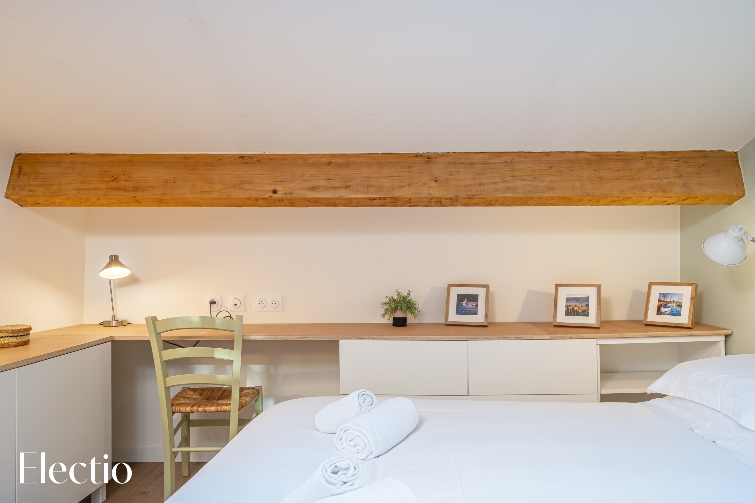 La chambre dispose d’un lit Queen size haut de gamme en 160x200cm pour un sommeil réparateur avec linge de lit et serviettes de bain, ainsi que d’une penderie avec cintres, planche et fer à repasser. Vous pouvez recharger votre smartphone directement en USB ou UBS-C à coté des interrupteurs sur la table de chevet.