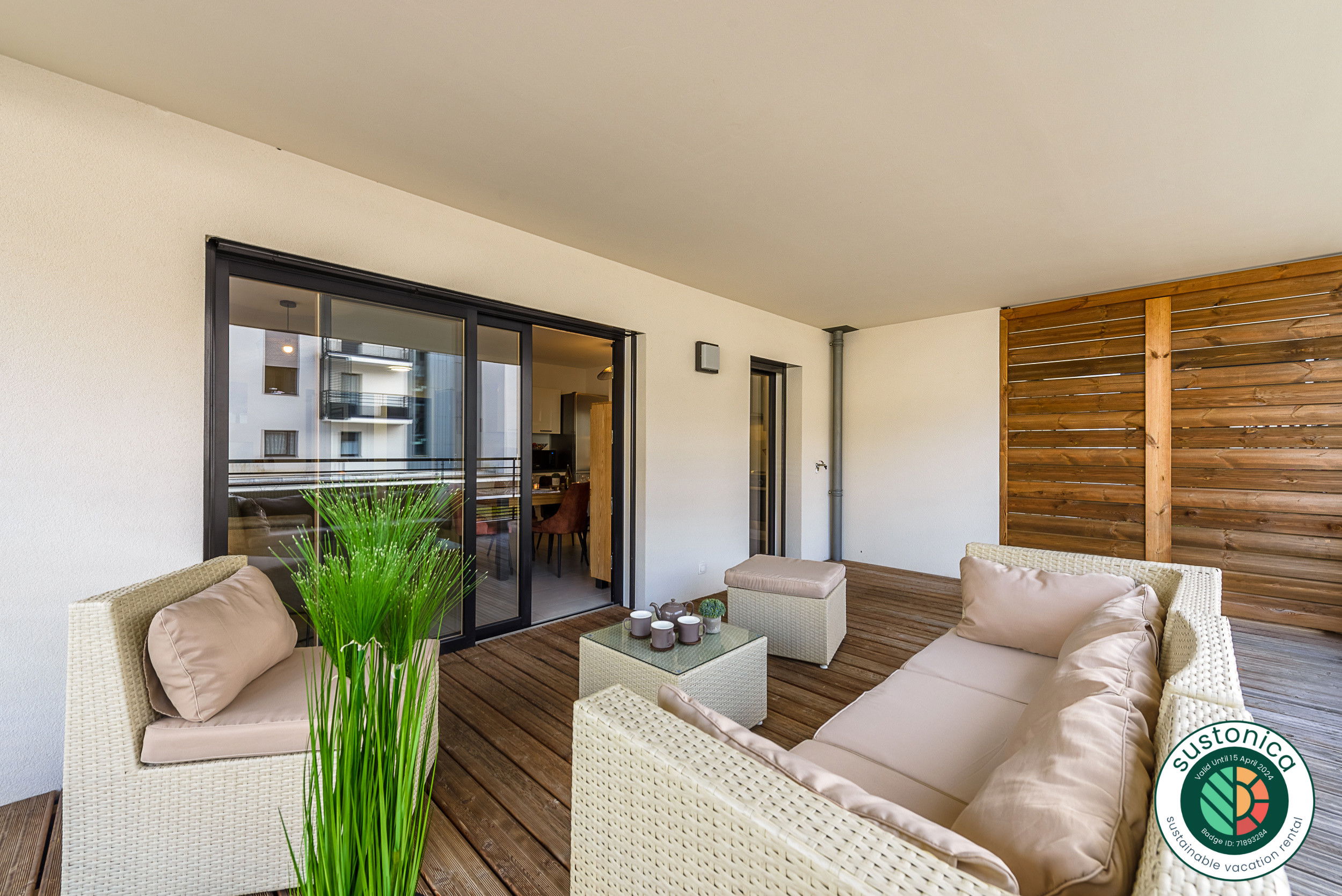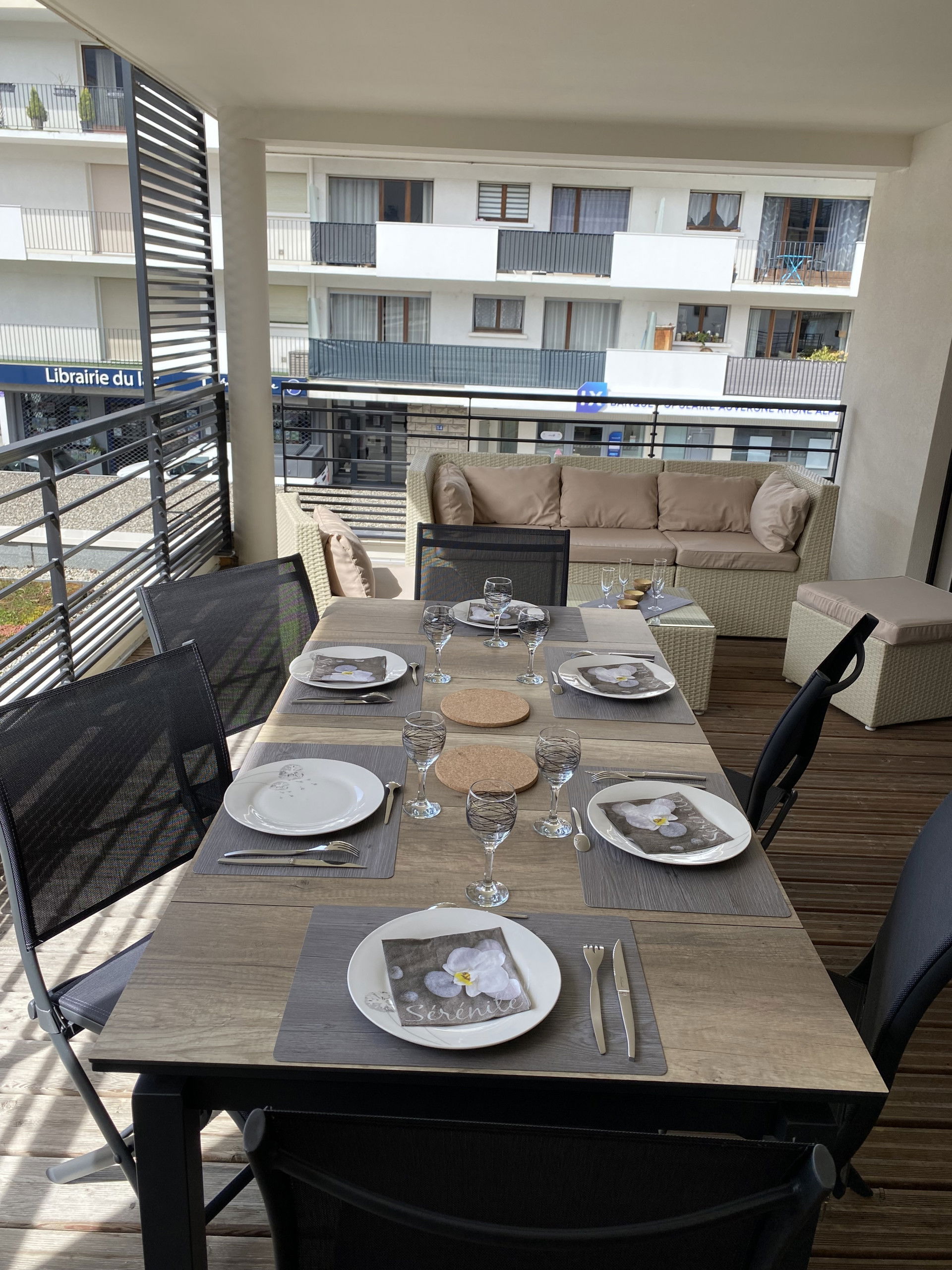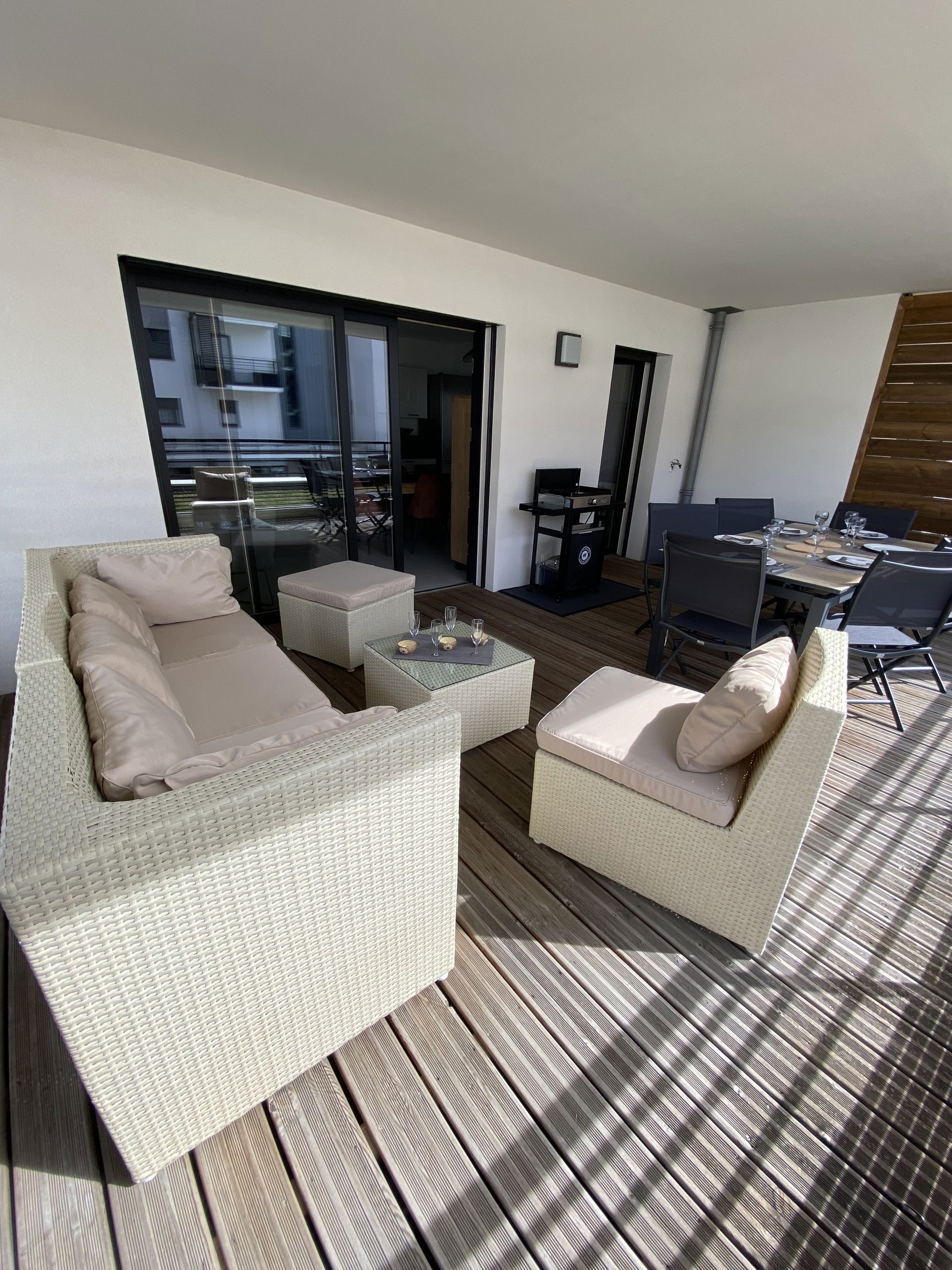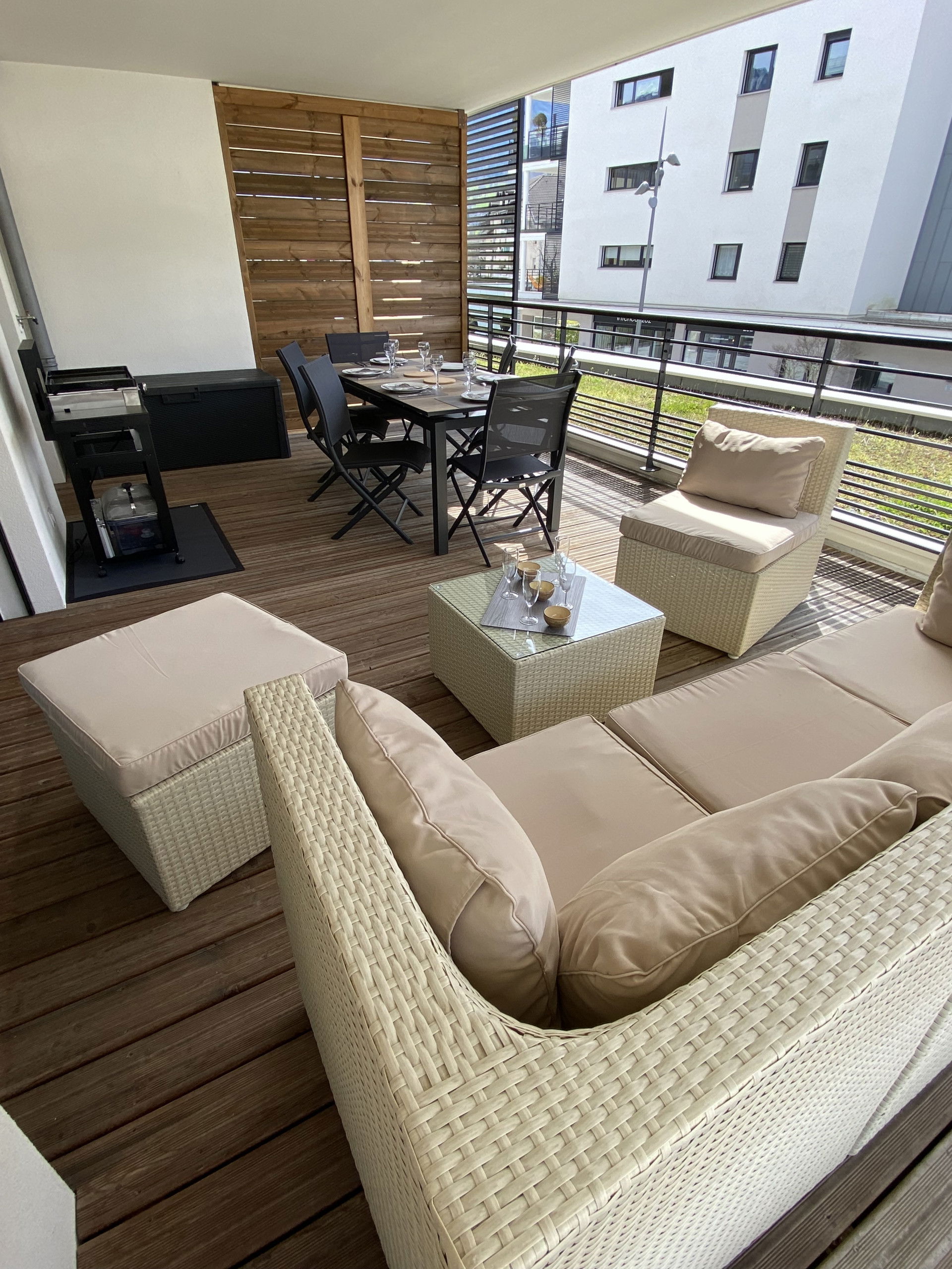 - Terrasse agréable et lumineuse accessible depuis le séjour, équipée d'un salon de jardin, tables et chaises