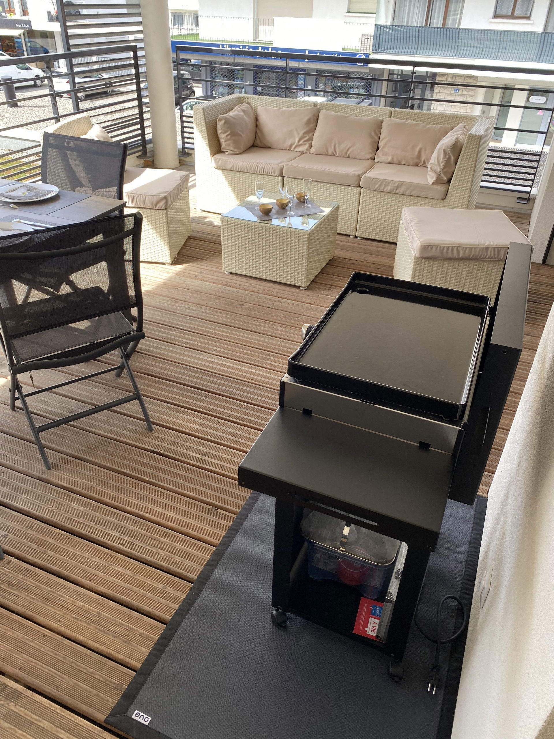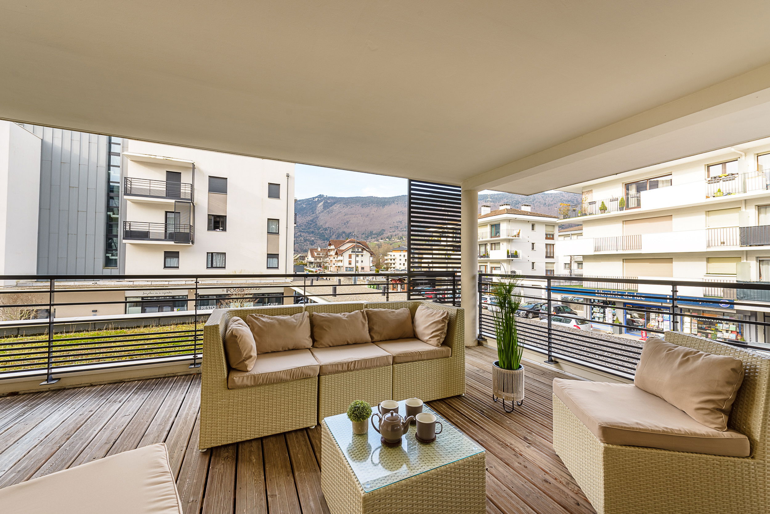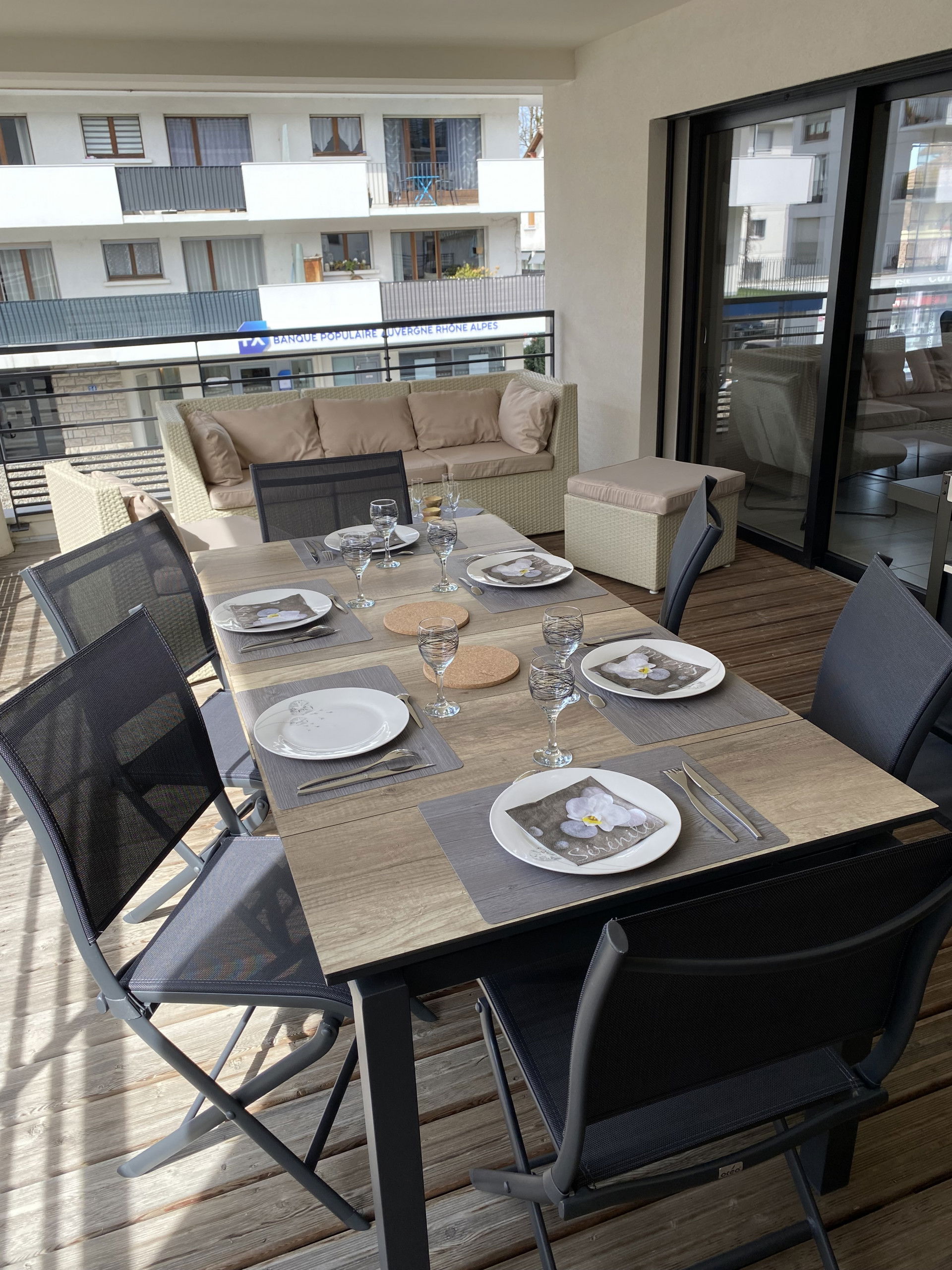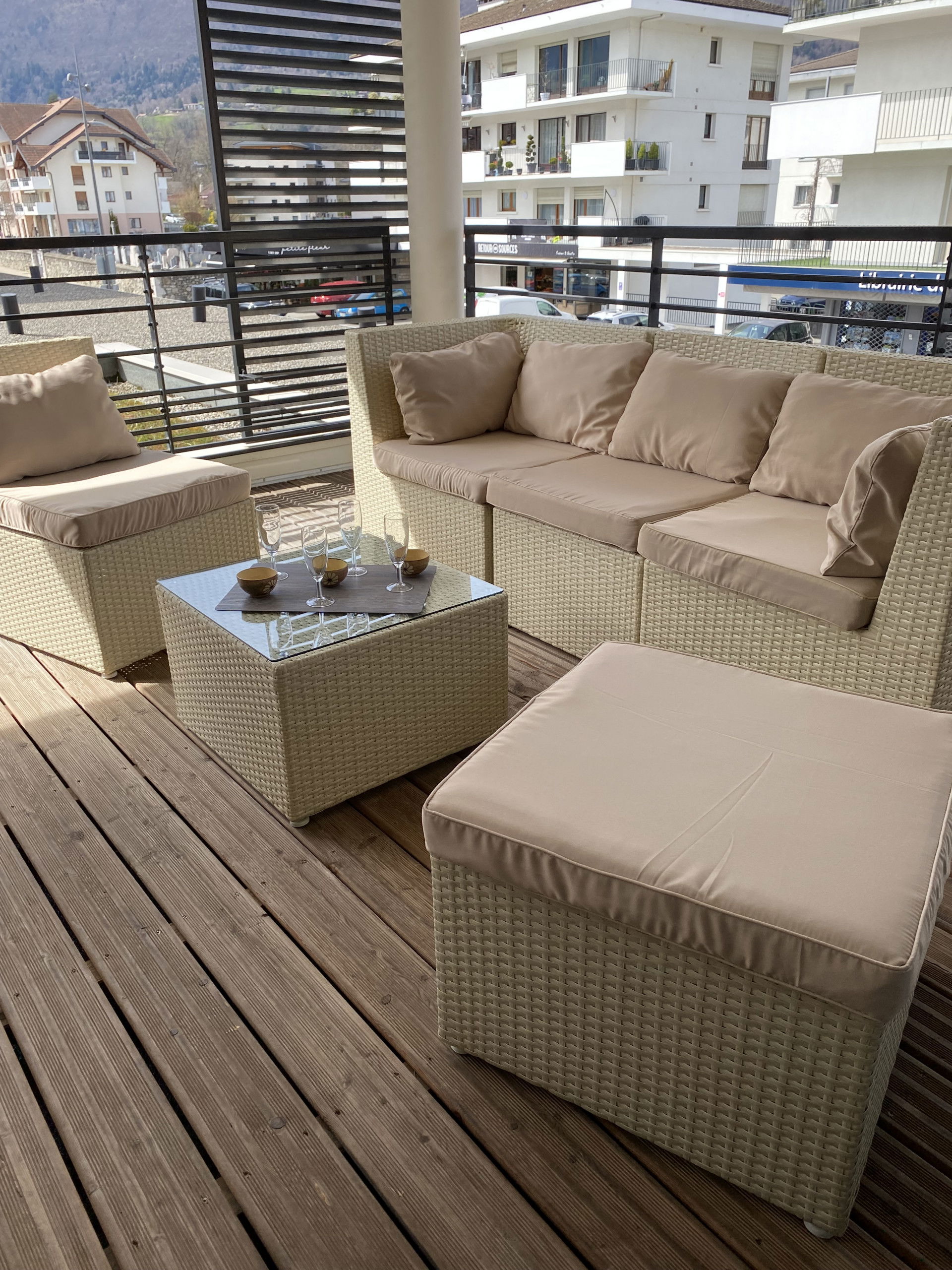 - Terrasse agréable et lumineuse accessible depuis le séjour, équipée d'un salon de jardin, tables et chaises