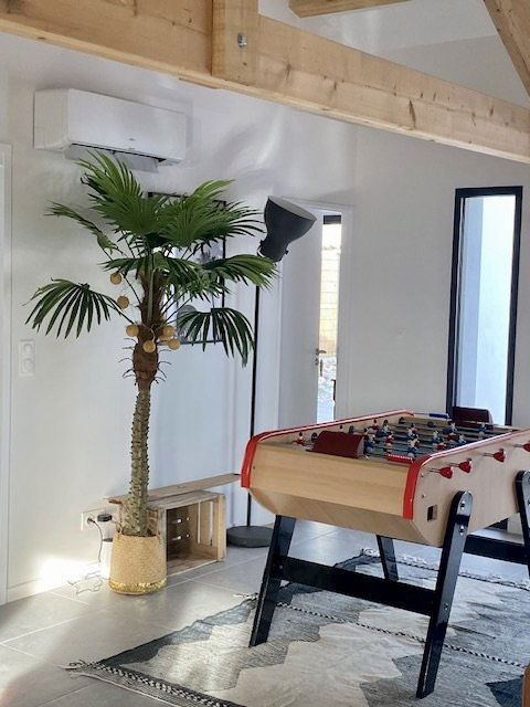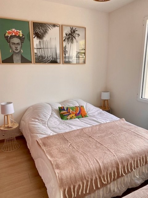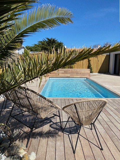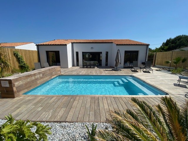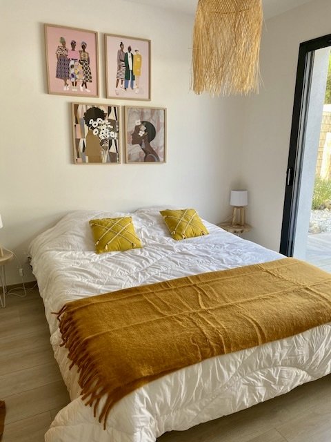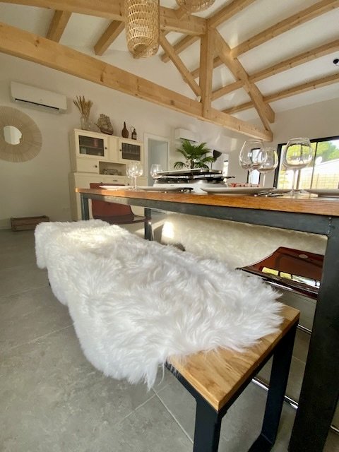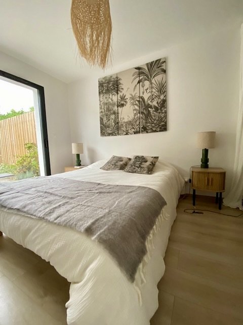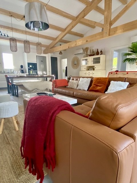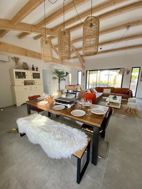 Belle maison contemporaine avec charpente apparente sur un terrain de 500 m² environ avec piscine privée se composant d'une grande pièce de vie avec cuisine ouverte aménagée et équipée, d'une première chambre avec un lit deux couchages (160) et rangements, d'une deuxième chambre avec un lit deux couchages (140), un lit un couchage (90) et rangements, ces deux chambres possèdent une salle d'eau attenante ainsi qu'un WC indépendant, d'une troisième chambre avec un lit deux couchages (160) et rangements, d'un quatrième chambre avec un lit deux couchages (140), un lit un couchage (90) et rangements, ces deux chambres possèdent également une salle d'eau attenante ainsi qu'un WC indépendant, d'un cellier avec rangements. A l'extérieur, une terrasse donnant sur une piscine privée (ouverte et chauffée de mi-juin à mi-septembre) à l'abri des regards ainsi qu'une douche extérieure. Parking sur le terrain.