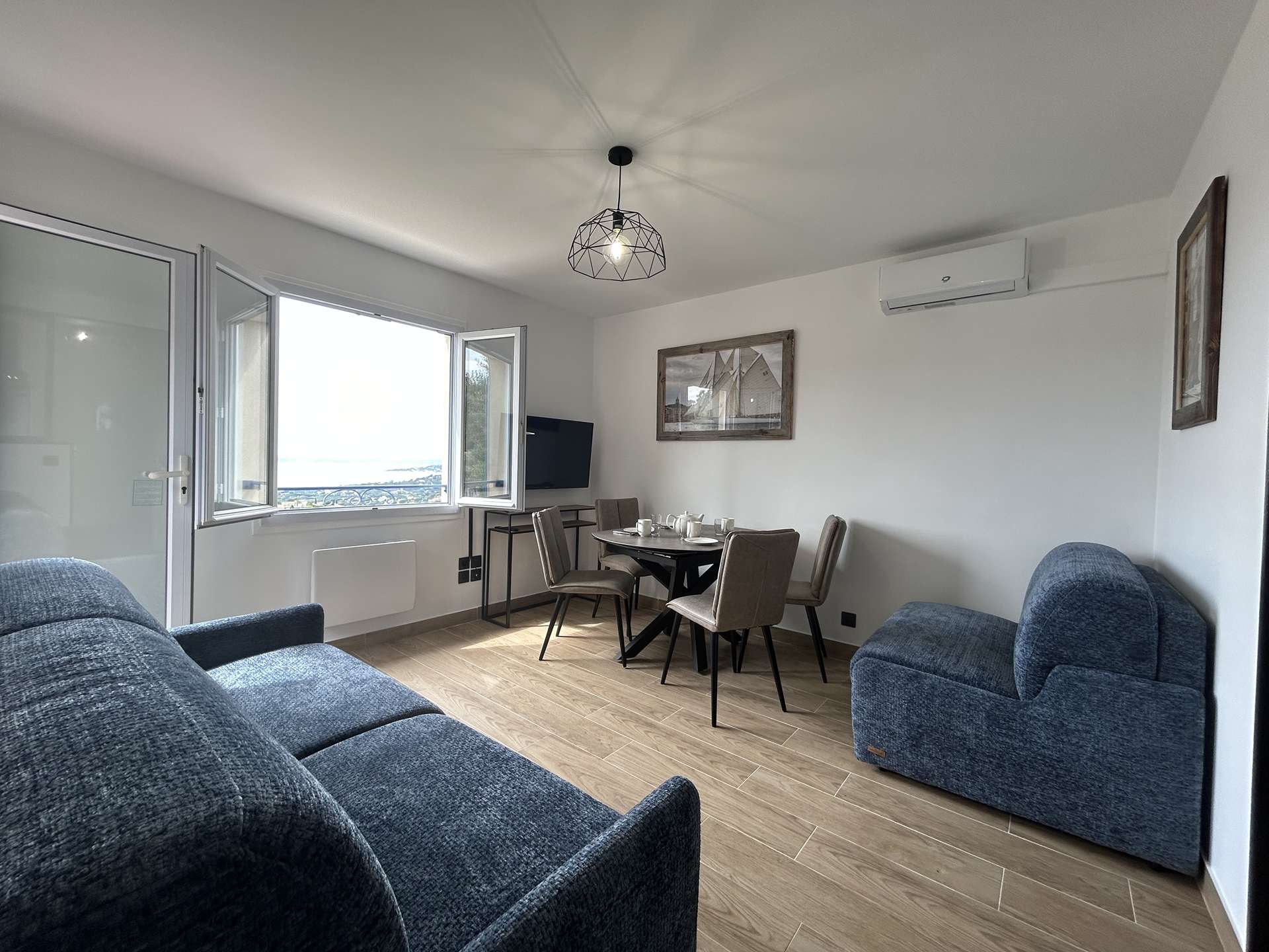 ce logement de vacances est climatisé il se compose d'un séjour avec un convertible BZ 2 places et un canapé BZ 1 place, un coin cuisine équipé, une chambre avec un grand lit, une salle d'eau avec WC.