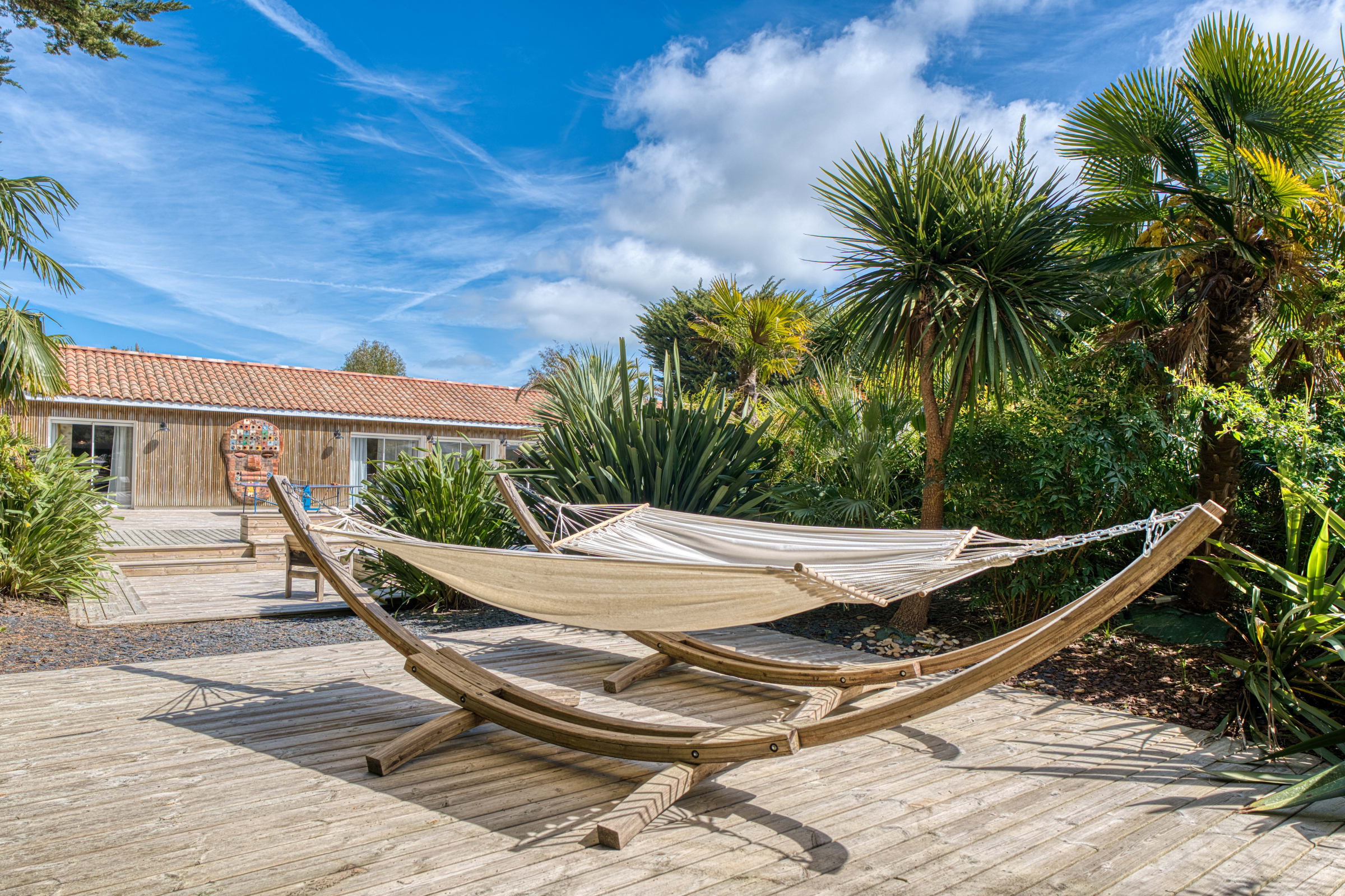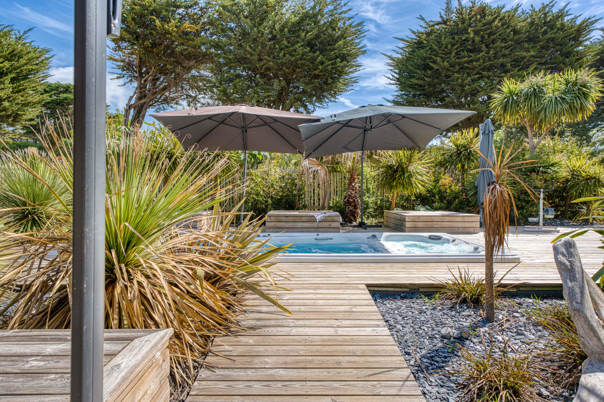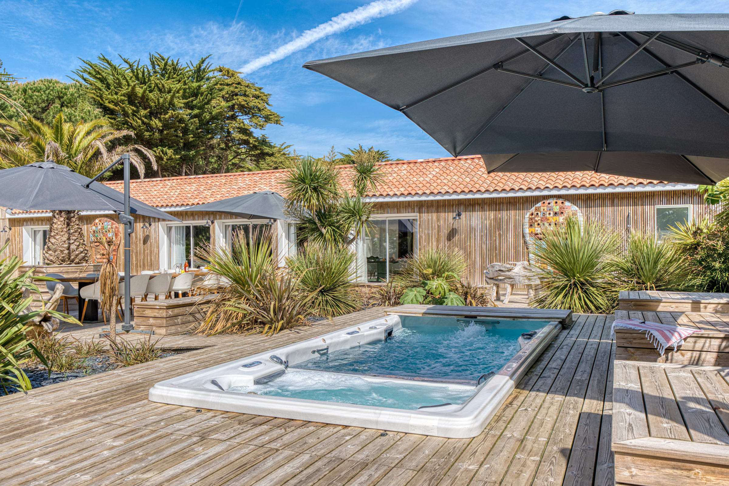 A l’extérieur, vous trouverez une grande terrasse privative avec un beau mobilier de jardin, barbecue et plancha à gaz, hamacs, ainsi qu’un spa de nage (en option). Un aquabike est mis à votre disposition.