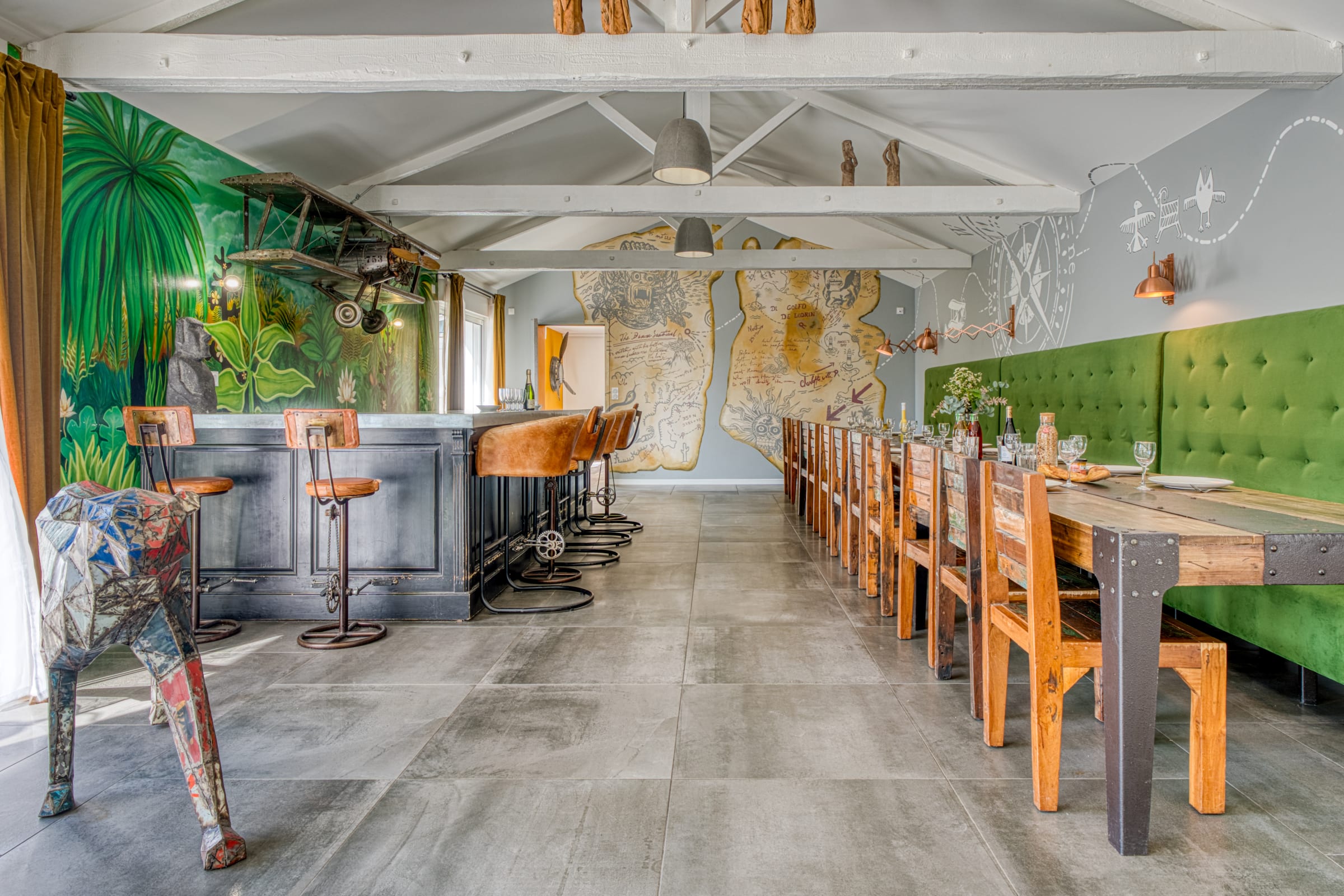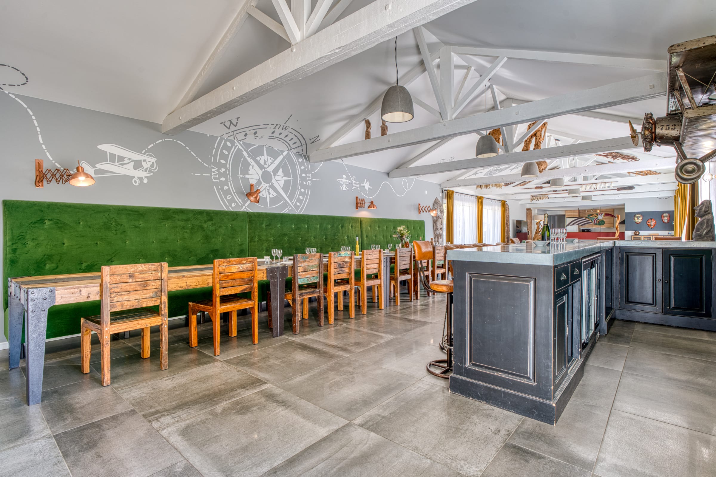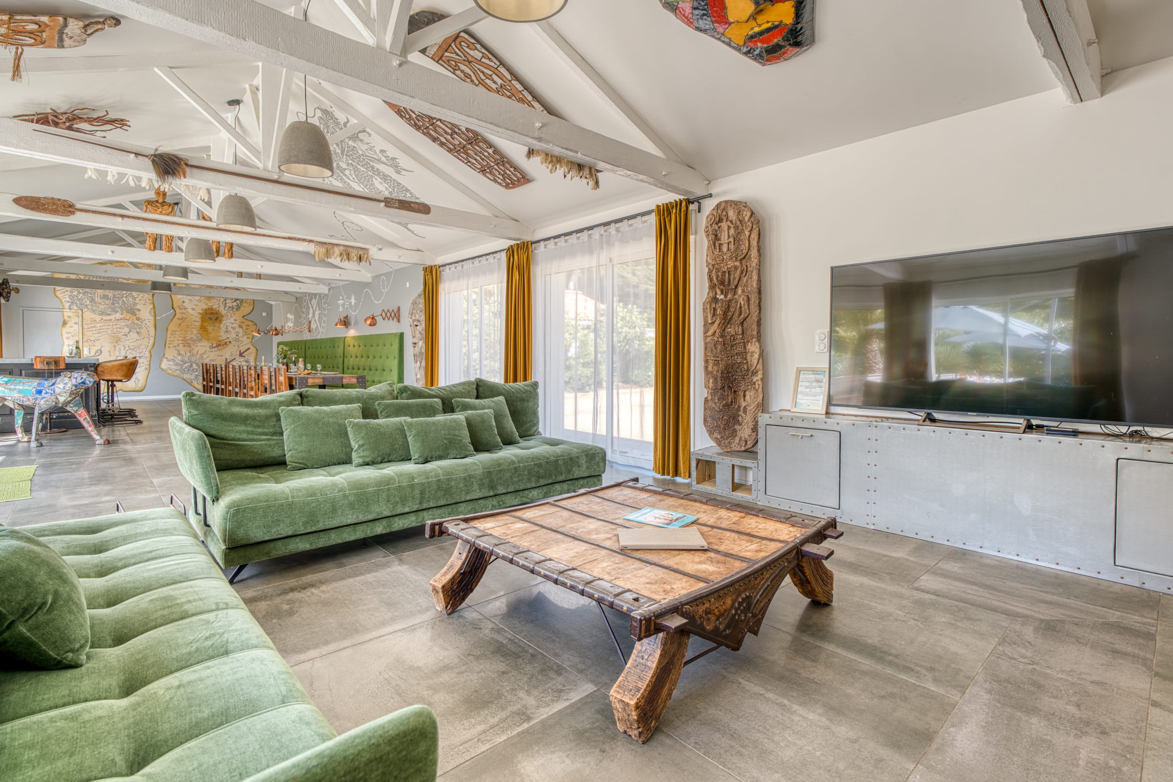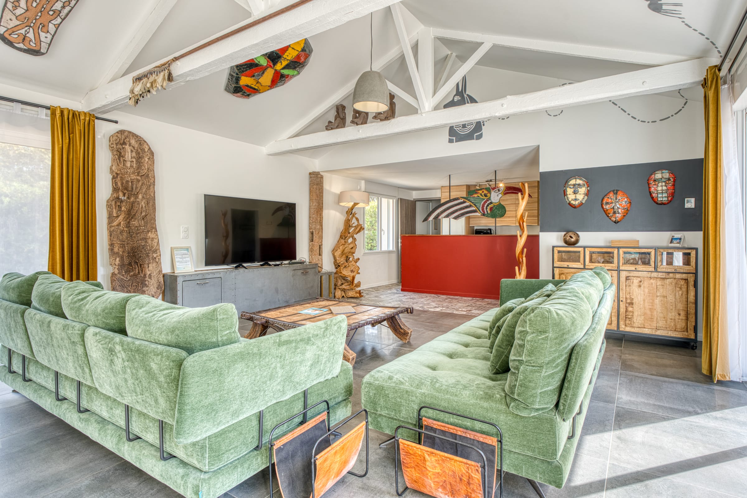 Un grand espace de réception avec un salon, un séjour et un bar. Une cuisine entièrement équipée (four, frigo-congélateur, lave-vaisselle, micro-ondes, four, cafetière Krups à grain, grille-pain, bouilloire, micro-ondes, plaque vitrocéramique, toute la vaisselle nécessaire, une télévision (chaînes TNT), sèche- cheveux, machine à laver, table et fer à repasser).