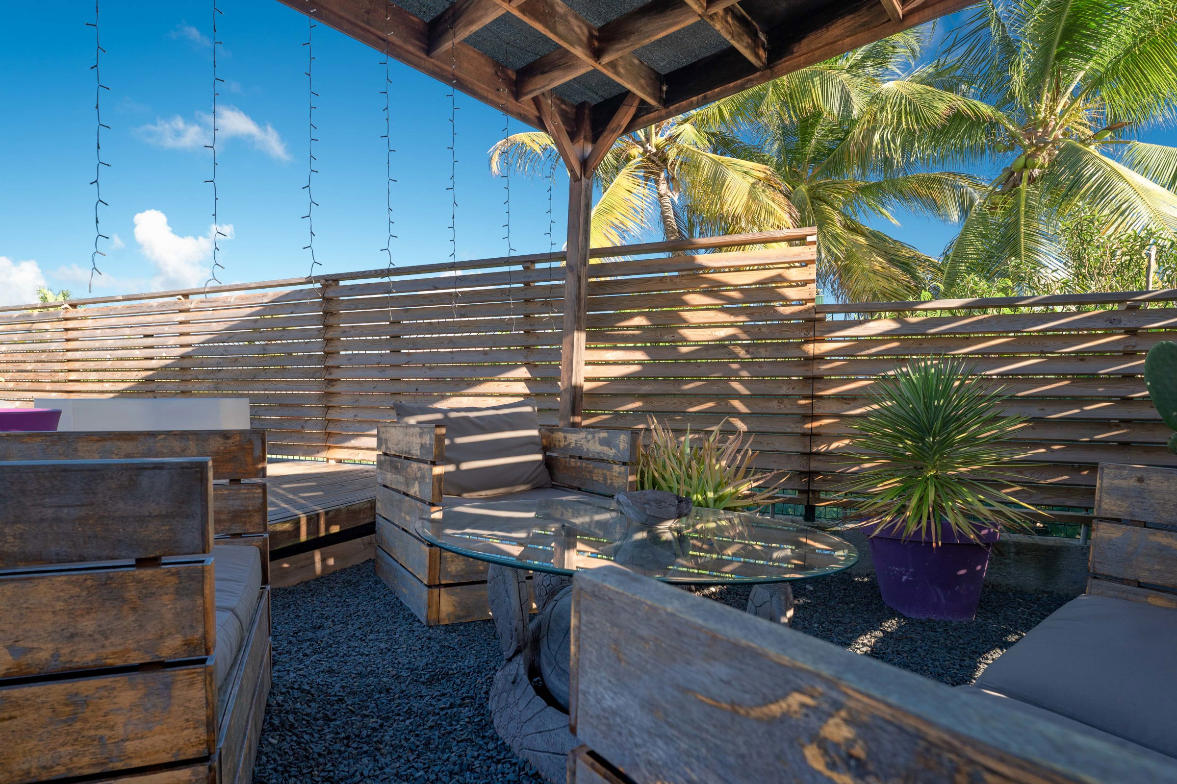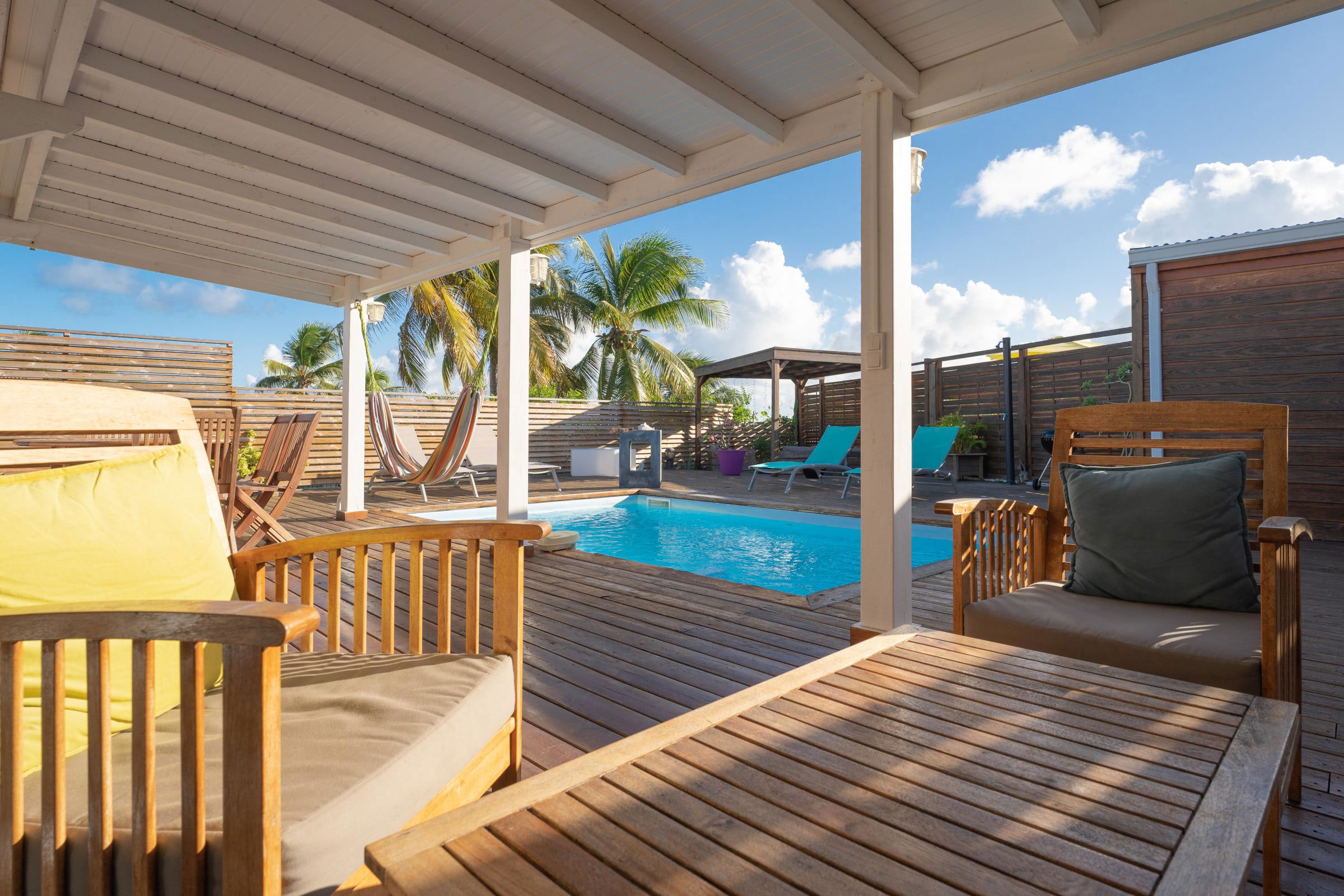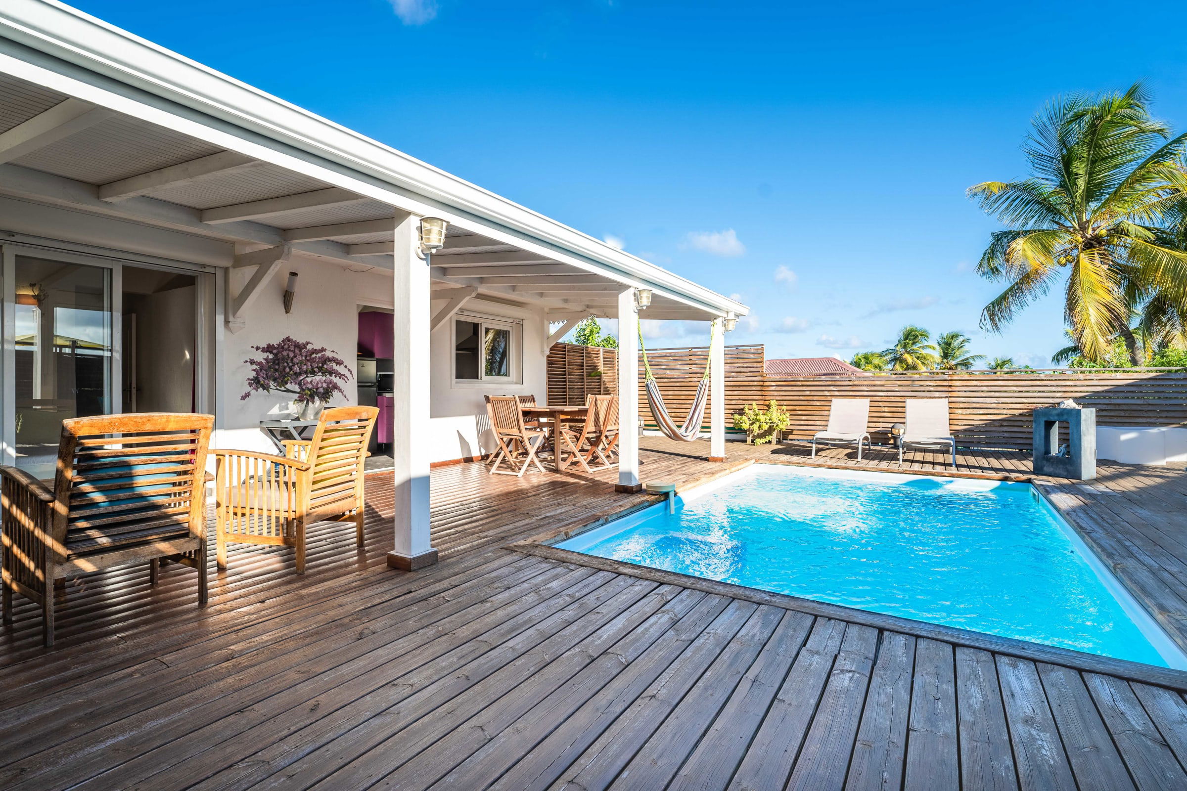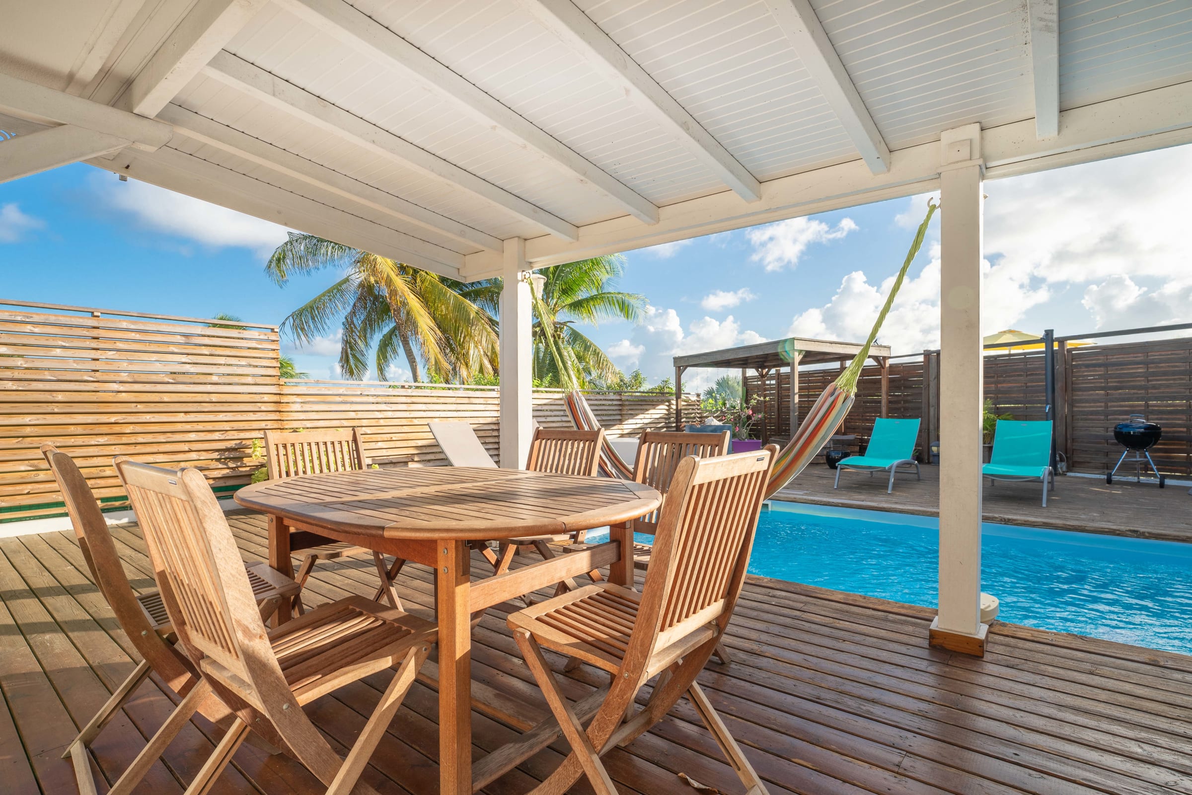L'espace extérieur est un véritable joyau. La piscine, bordée d'un deck en bois, vous invite à des moments de détente et de rafraîchissement. Le carbet extérieur est l'endroit idéal pour vos repas en plein air, avec une table de repas pour profiter de la cuisine équipée. Pour les amateurs de grillades, un barbecue est également à votre disposition.