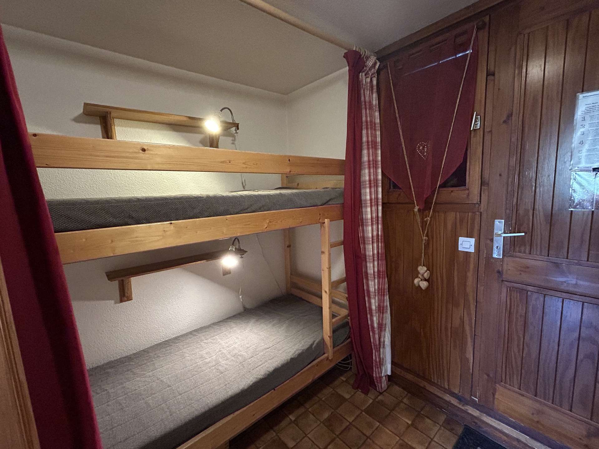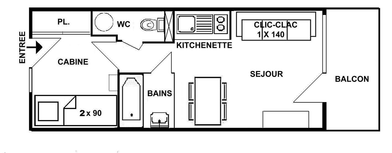 L'appartement se compose d'une kitchenette équipée, d'un séjour avec canapé 140, d'une alcôve avec 2 lits superposés (2x90) (NB: le lit supérieur d'un lit superposé est interdit aux - de 6 ans) d'une salle d'eau et d'un WC séparé.