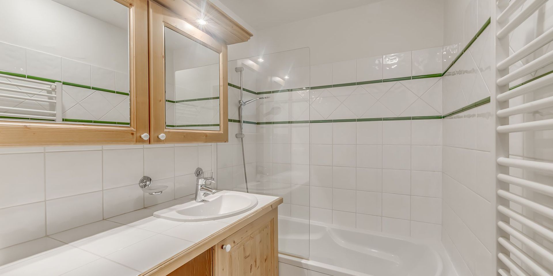 - 1 Salle de bains avec baignoire, meuble vasque et radiateur sèche serviettes, lave-linge