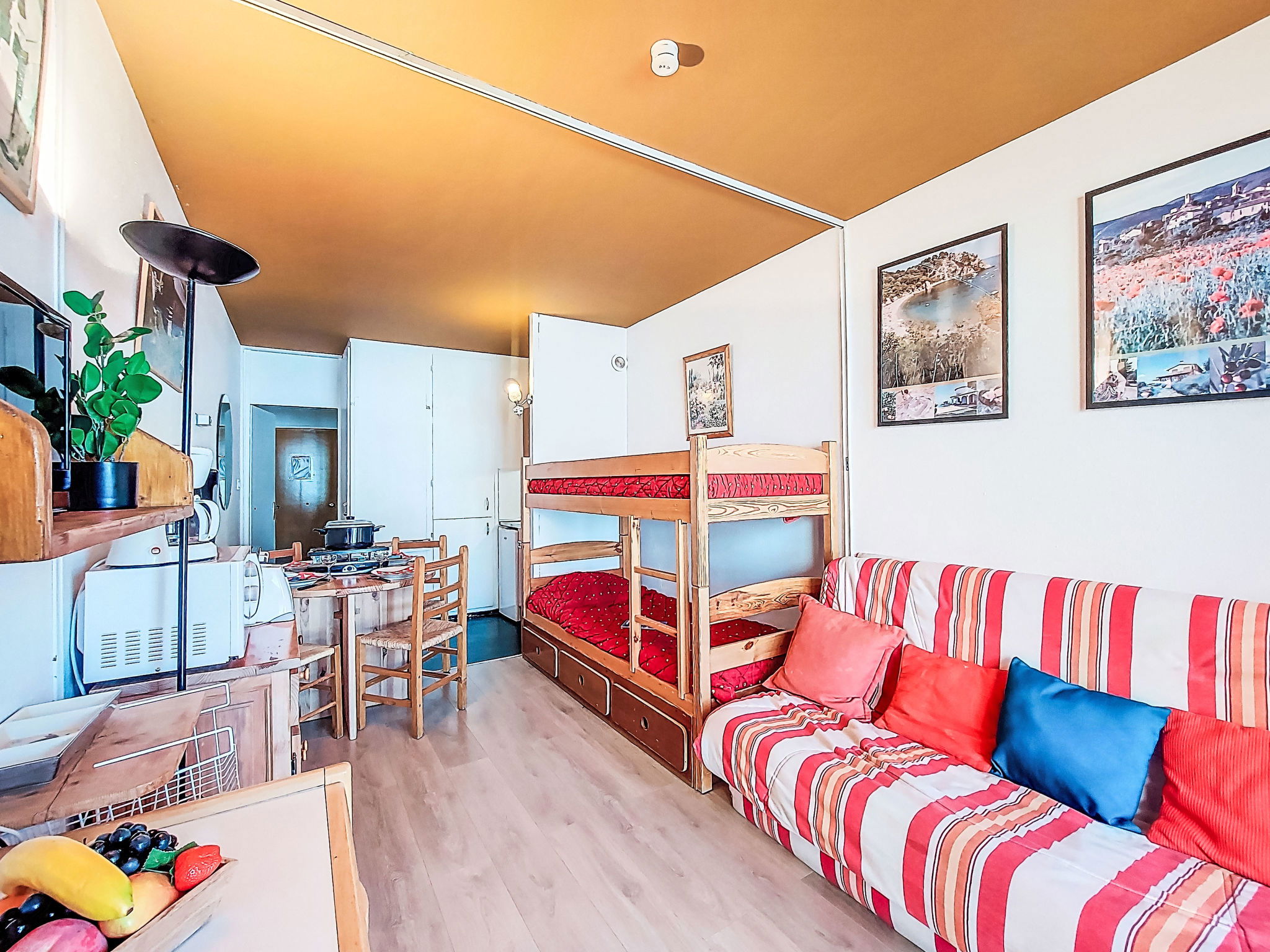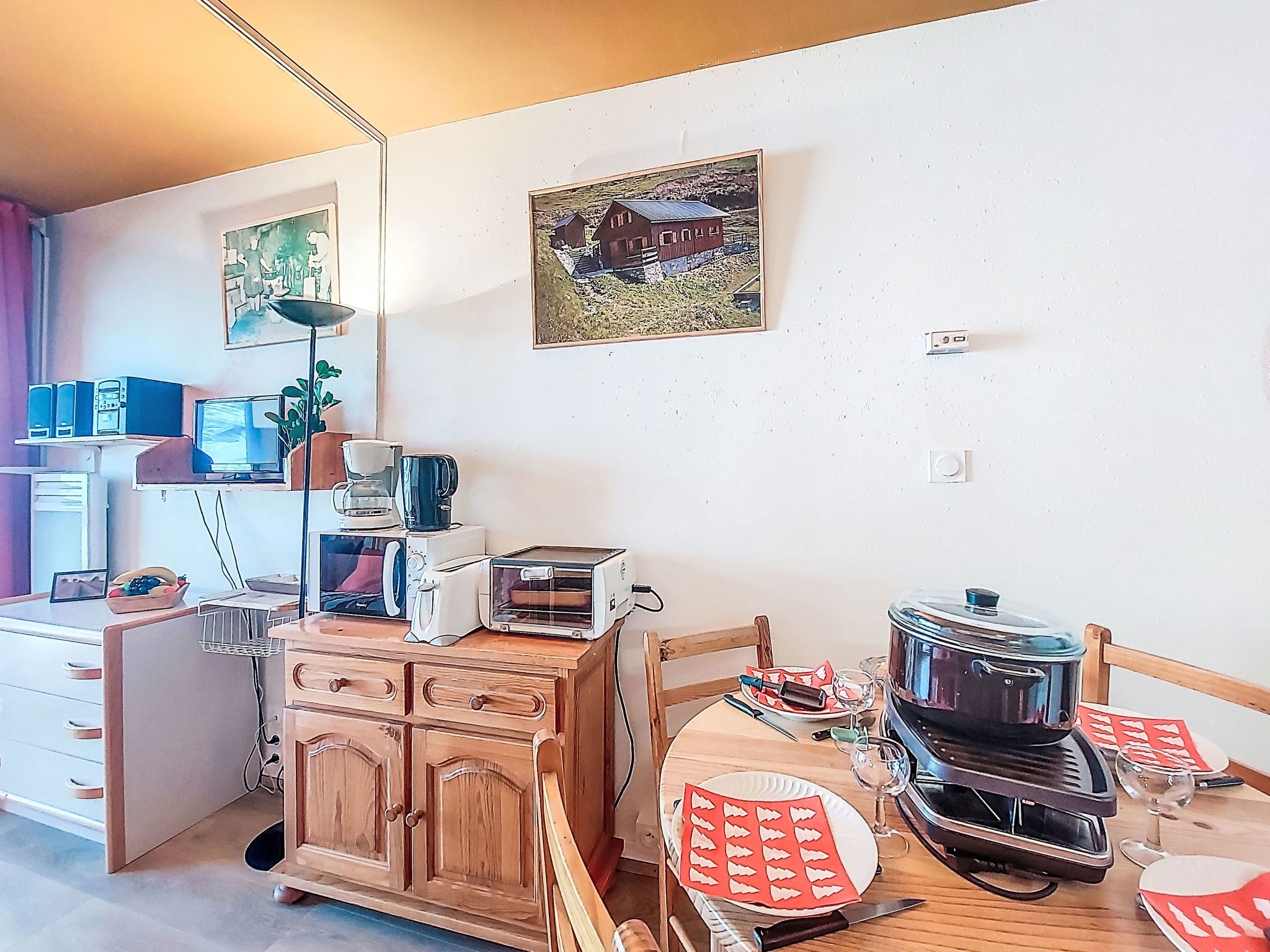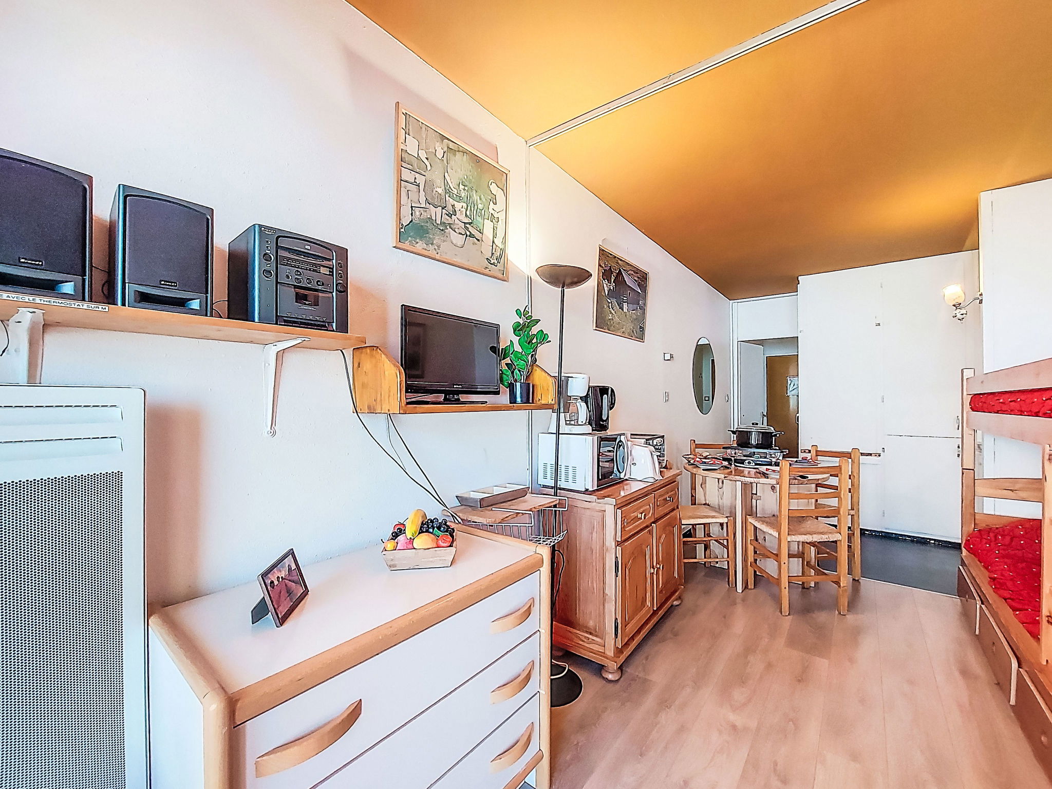 Studio 23 m2 au 5ème étage, situation sud. Aménagement simple: séjour/chambre à coucher avec 1 divan-lit double (130 cm, longueur 190 cm), 1 x 2 lits superposés (80 cm, longueur 190 cm), TV (écran plat), chaîne stéréo. Sortie sur le balcon. Coin cuisine (2 plaques de cuisson, mini-four, grille-pain, bouilloire électrique, micro-ondes, cafetière électrique, appareil à raclette, service à fondue (fondue au fromage)). Bain/WC. Chauffage électrique. Sol en parquet. Balcon 5 m2, situation sud. Mobilier de balcon. Très belle vue sur les montagnes et les pistes de ski. A disposition: fer à repasser, sèche-cheveux. Internet (Connexion WIFI, en sus). Veuillez noter: logement non-fumeur. Détecteur de fumée. Annonce d'un particulier (art 155, IV du CGI).