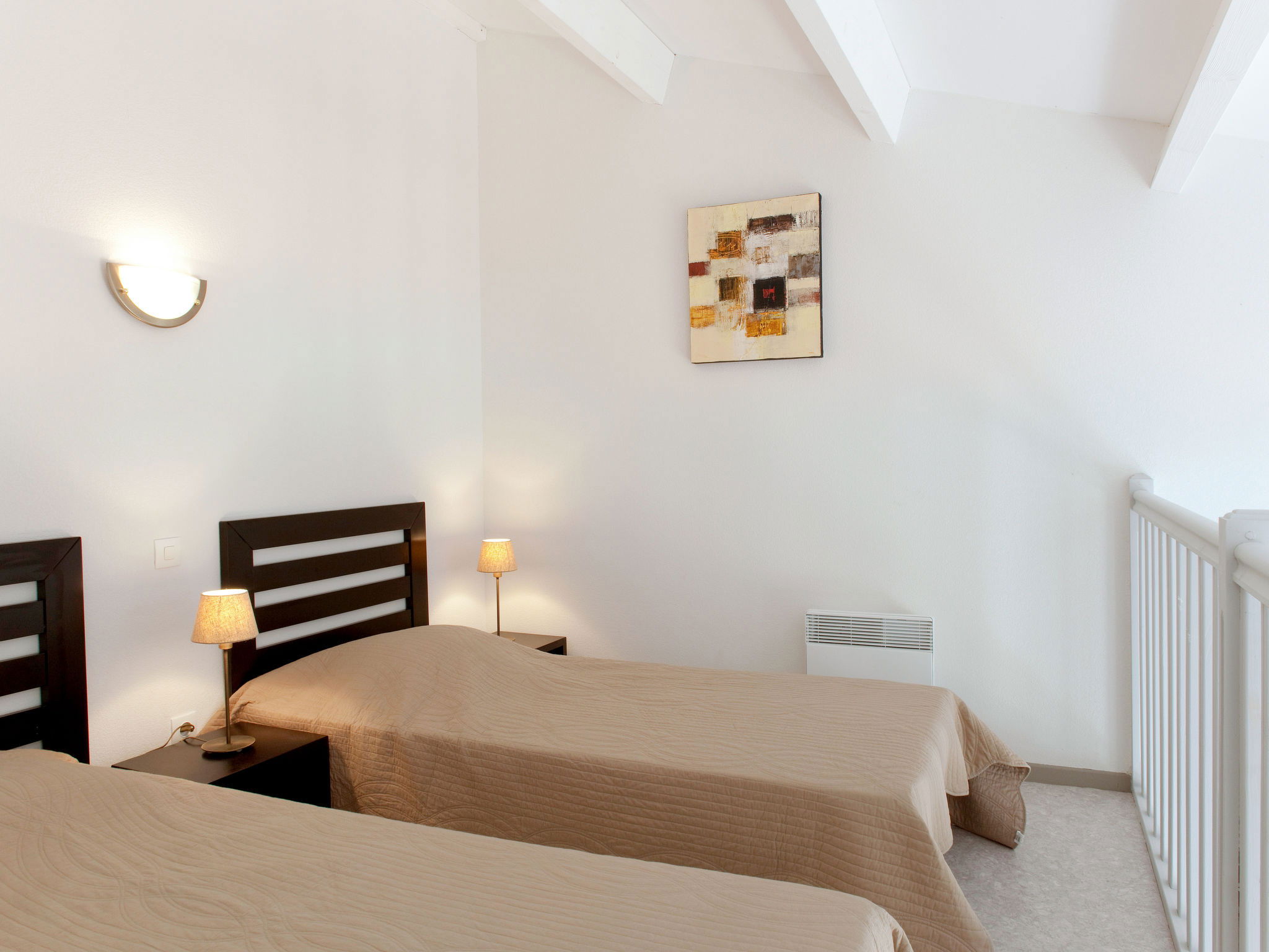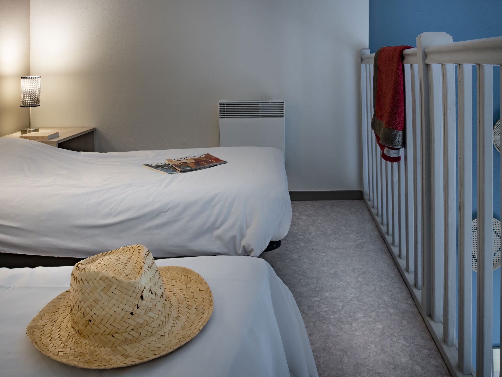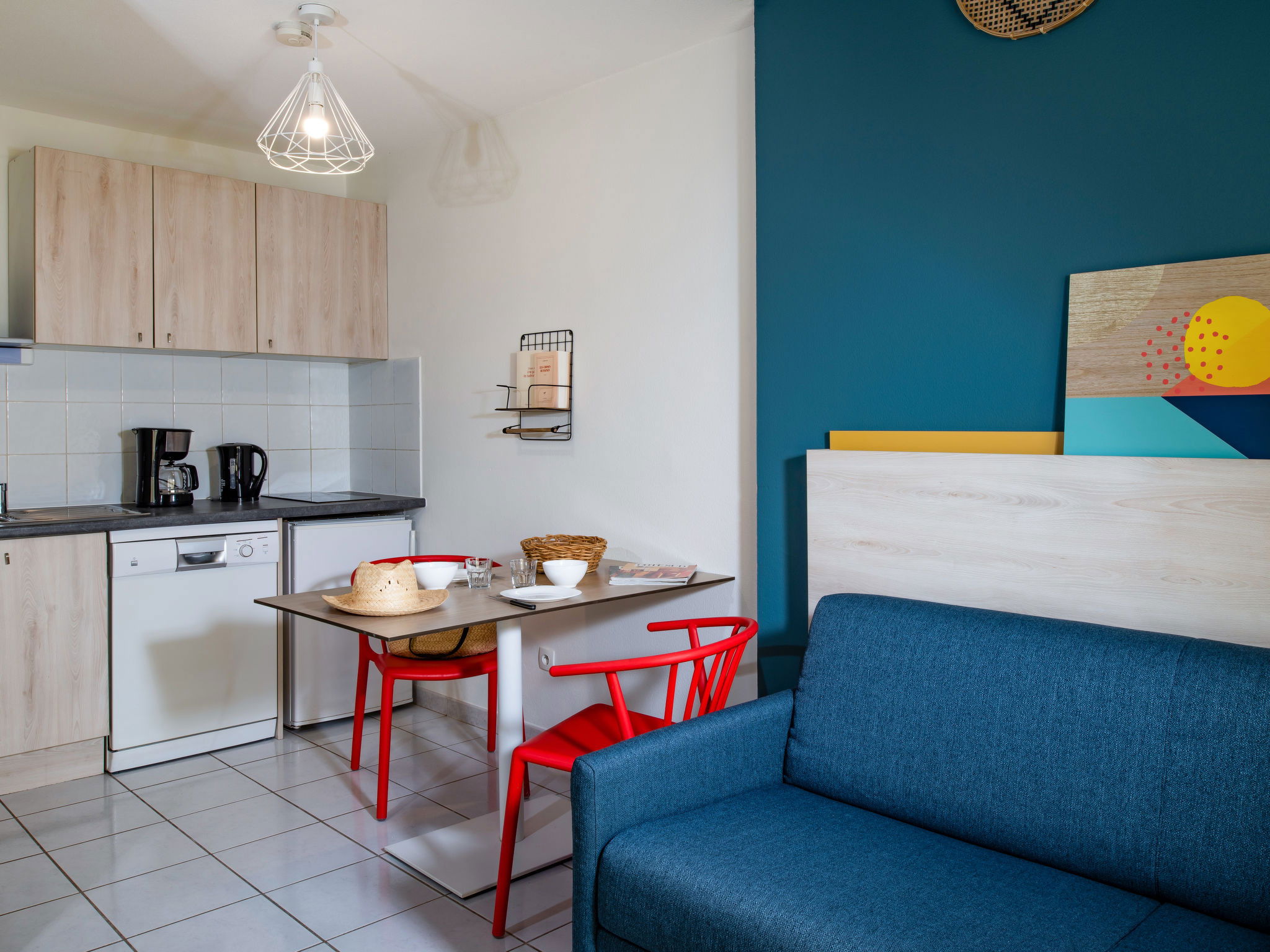 "Domaine du Golf", maison mitoyenne studio 32 m2 sur 2 niveaux. Logement idéal pour 2 adultes + 2 enfants. Clair, rénovée en 2019, aménagement moderne et de style: séjour/chambre à coucher avec 1 divan-lit double (140 cm, longueur 190 cm), table pour les repas, TV et air-conditionné. Sortie sur la terrasse. Coin cuisine (2 plaques de cuisson, lave-vaisselle, micro-ondes, cafetière électrique). Douche/WC. À l'étage supérieur: galerie ouverte avec 2 lits. Chauffage électrique. Terrasse. Meubles de terrasse. A disposition: Internet (Connexion WIFI, gratuit). Veuillez noter: maximum 1 animal/ chien autorisé. Détecteur de fumée. L'ouverture de la piscine peut varier en fonction de la météo. Service de Boulangerie en juillet et août uniquement. Au lieu d'une chambre fermée, des espaces de couchage sont situés dans une zone ouverte (galerie, alcôve...).