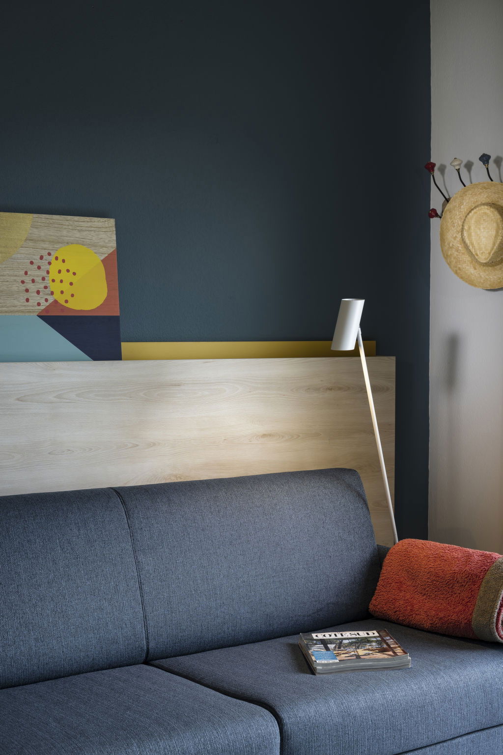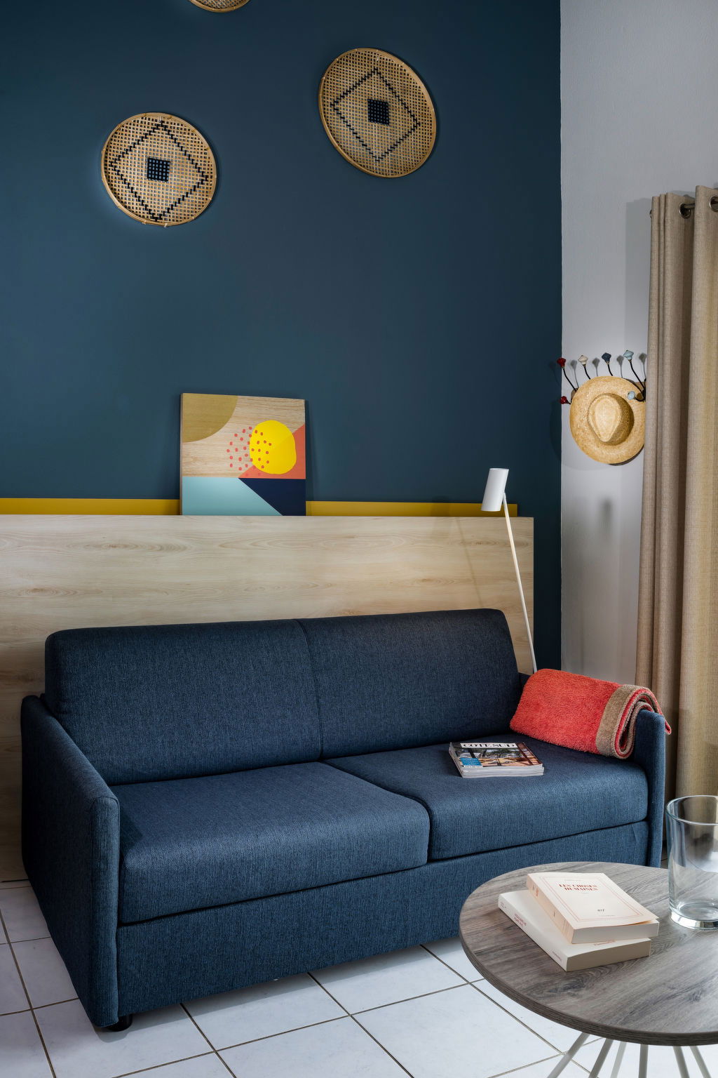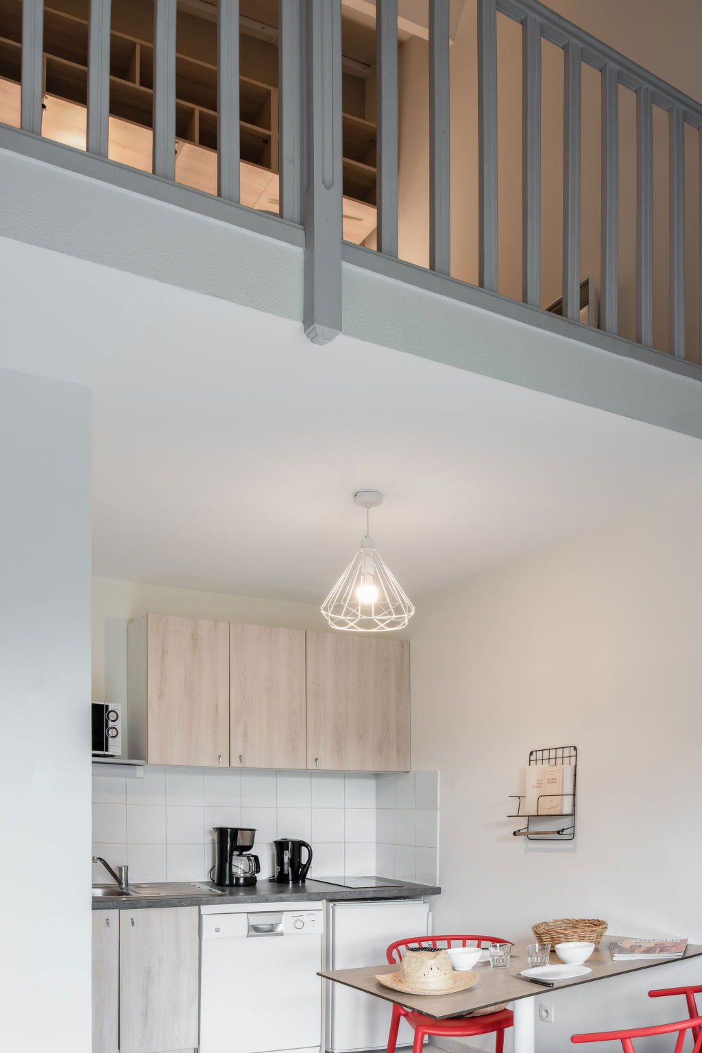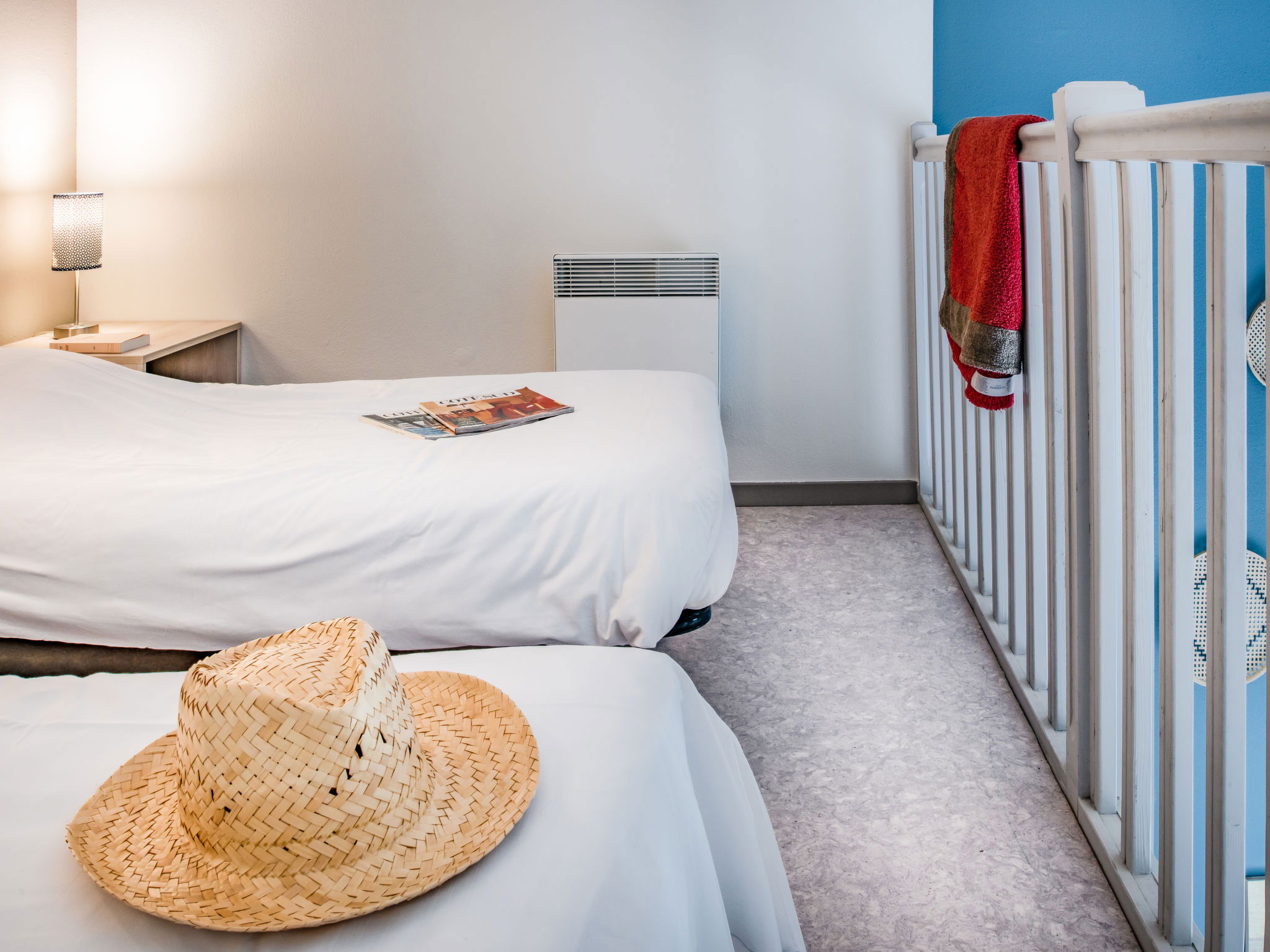 "Domaine du Golf", maison mitoyenne studio 32 m2 sur 2 niveaux. Logement idéal pour 2 adultes + 2 enfants. Clair, rénovée en 2019, aménagement moderne et de style: séjour/chambre à coucher avec 1 divan-lit double (140 cm, longueur 190 cm), table pour les repas, TV et air-conditionné. Sortie sur la terrasse. Coin cuisine (2 plaques de cuisson, lave-vaisselle, micro-ondes, cafetière électrique). Douche/WC. À l'étage supérieur: galerie ouverte avec 2 lits. Chauffage électrique. Terrasse. Meubles de terrasse. A disposition: Internet (Connexion WIFI, gratuit). Veuillez noter: maximum 1 animal/ chien autorisé. Détecteur de fumée. L'ouverture de la piscine peut varier en fonction de la météo. Service de Boulangerie en juillet et août uniquement. Au lieu d'une chambre fermée, des espaces de couchage sont situés dans une zone ouverte (galerie, alcôve...).