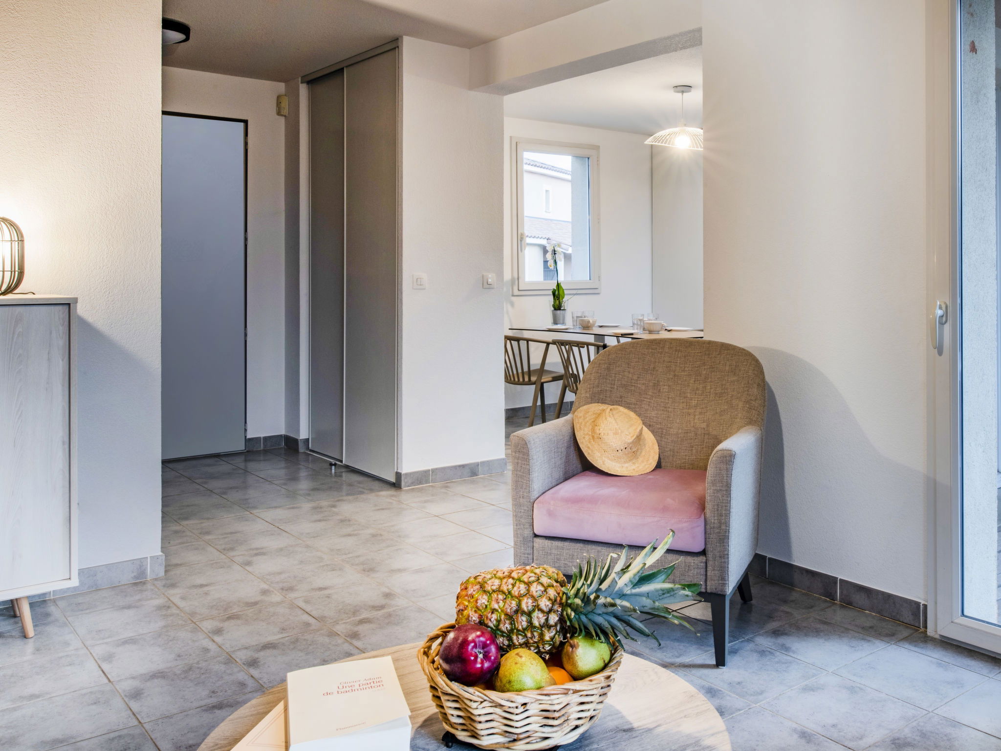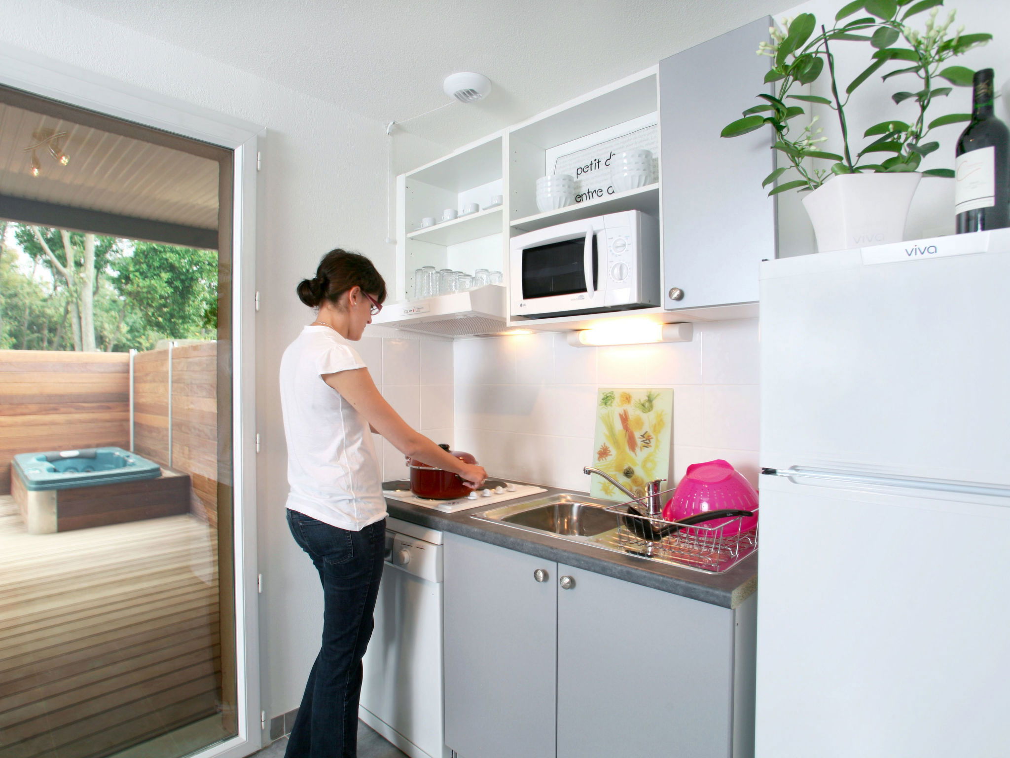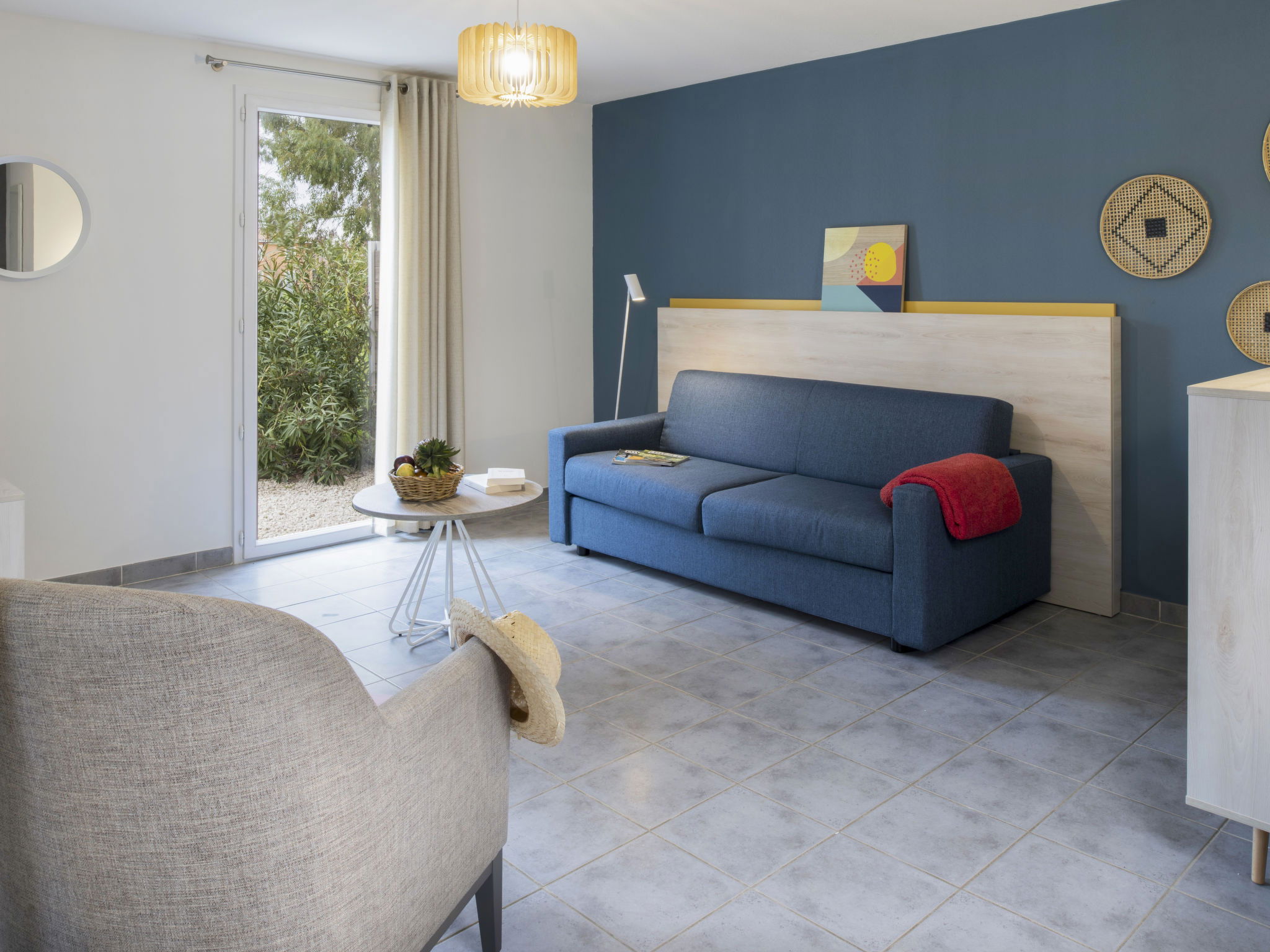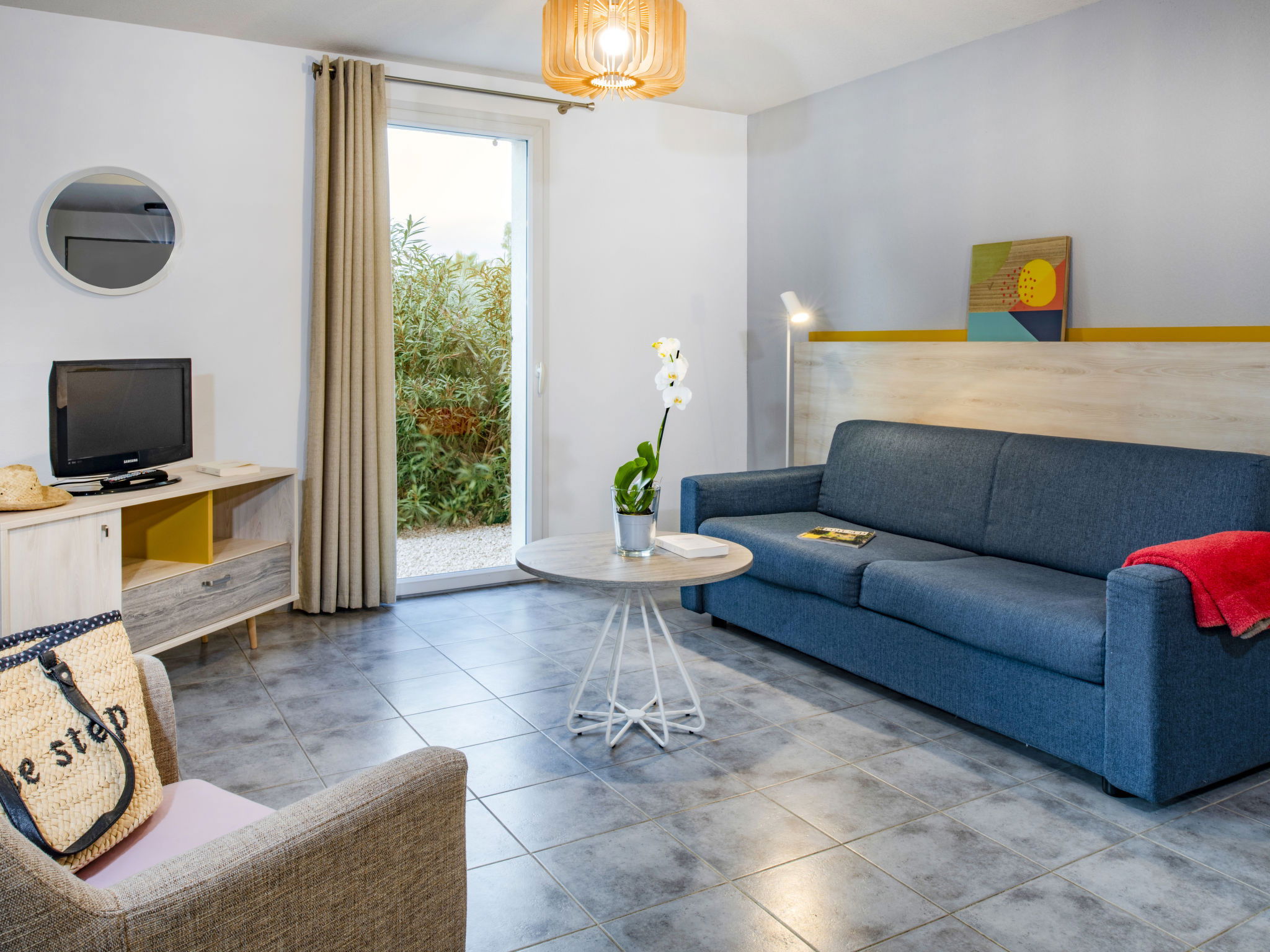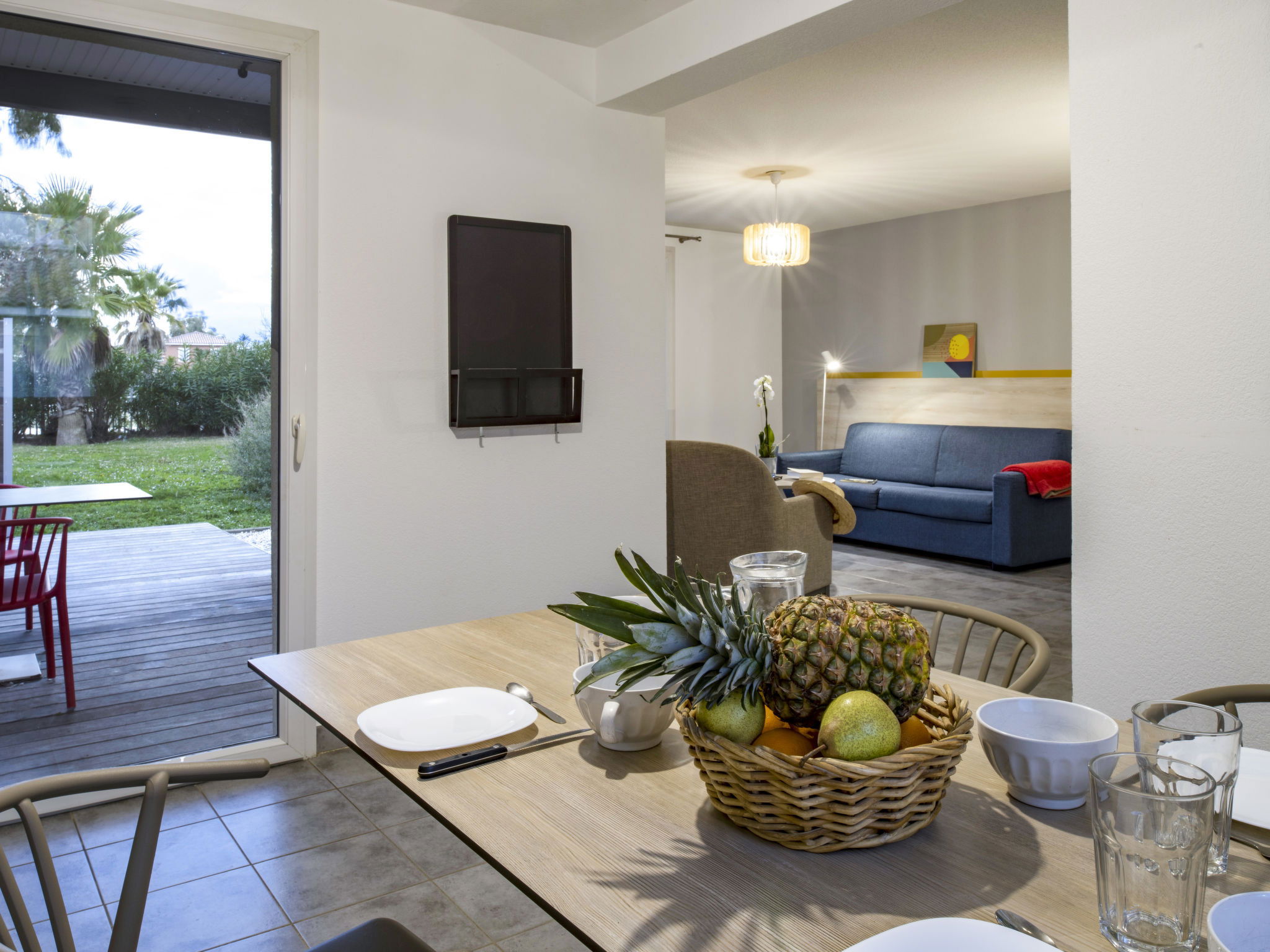 "Domaine du Golf", maison mitoyenne 3 pièces 65 m2 sur 2 niveaux. Clair, rénovée en 2019, aménagement moderne et de style: séjour/salle à manger avec 1 divan-lit, table pour les repas, TV et air-conditionné. Sortie sur la terrasse. Coin cuisine (4 plaques de cuisson, lave-vaisselle, micro-ondes, cafetière électrique). WC séparé. À l'étage supérieur: 1 chambre avec 1 grand-lit. 1 chambre avec 2 lits. Bain/WC. Chauffage électrique. Terrasse. Meubles de terrasse. A disposition: Internet (Connexion WIFI, gratuit). Veuillez noter: maximum 1 animal/ chien autorisé. Détecteur de fumée. Certains appartements de ce type disposent d'un bain à remous privé pour 2 personnes sur la terrasse (140 €/semaine, sur demande, commande ferme, avril-novembre).
