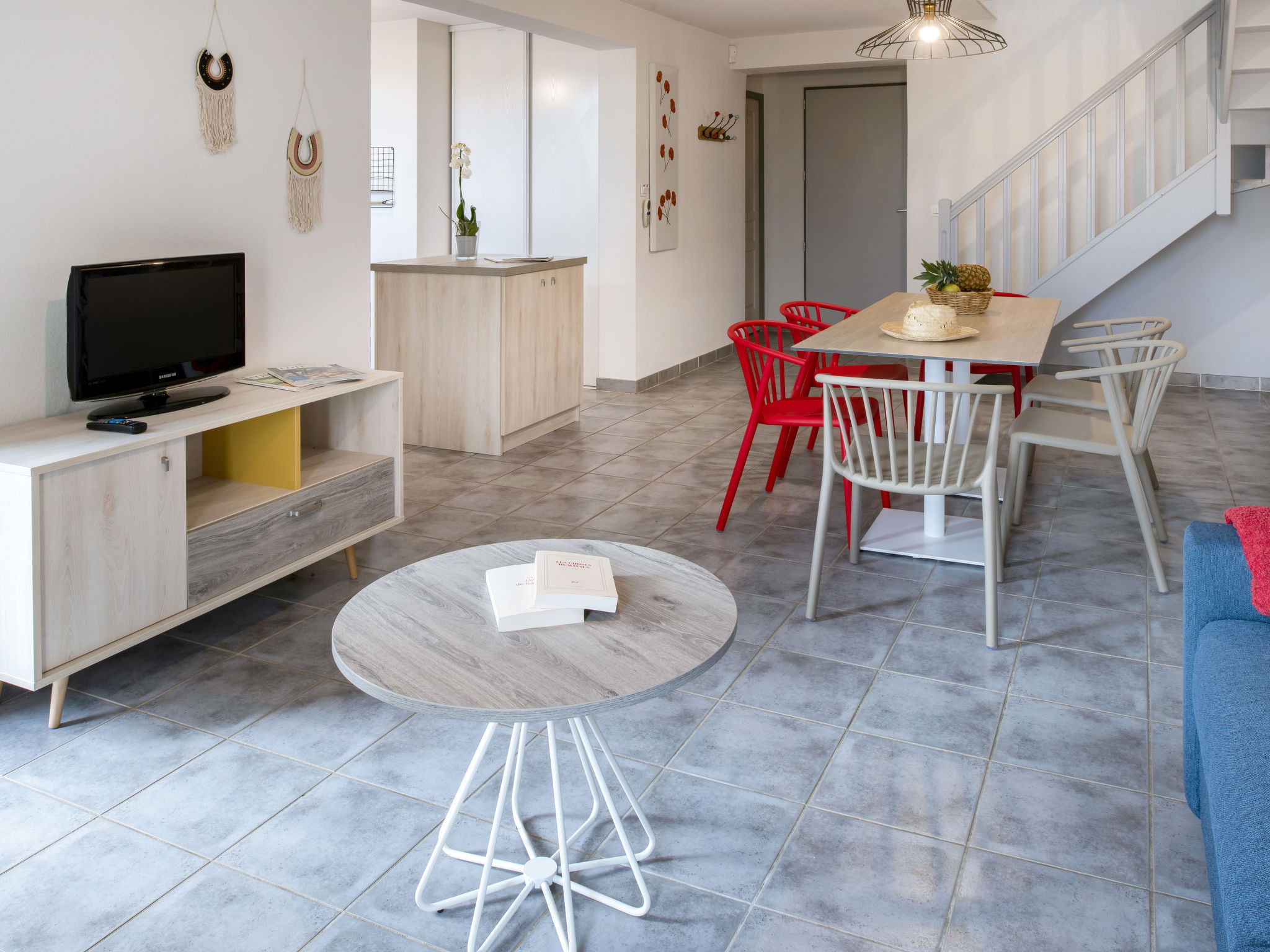 "Domaine du Golf", maison mitoyenne 4 pièces 80 m2 sur 2 niveaux. Clair, rénovée en 2019, aménagement moderne et de style: séjour/chambre à coucher avec 1 divan-lit double, table pour les repas, TV et air-conditionné. Sortie sur la terrasse. 1 chambre avec 1 grand-lit. Coin cuisine (4 plaques de cuisson, lave-vaisselle, micro-ondes, cafetière électrique). Douche, WC séparé. À l'étage supérieur: 1 chambre avec 1 grand-lit. 1 chambre avec 2 lits. Bain/WC. Chauffage électrique. Terrasse. Meubles de terrasse. A disposition: Internet (Connexion WIFI, gratuit). Veuillez noter: maximum 1 animal/ chien autorisé. Détecteur de fumée. Certains appartements de ce type disposent d'un bain à remous privé pour 2 personnes sur la terrasse (140 €/semaine, sur demande, commande ferme, avril-novembre).
