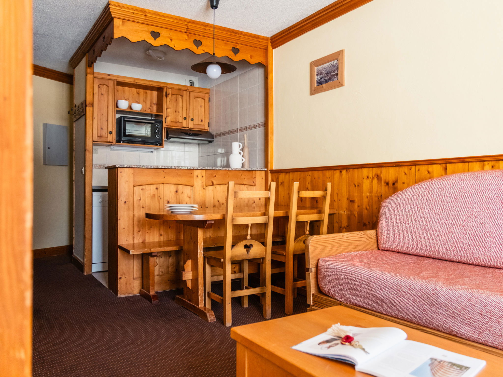 "Le Cheval Blanc Privilège", Appartement de 2 pièces 27 m2. Aménagement rustique: séjour/chambre à coucher avec 1 divan-lit, 1 lit gigogne, table pour les repas et TV (satellite) (écran plat). Sortie sur le balcon. 1 chambre avec 2 lits. Coin cuisine (2 plaques de cuisson, mini-four, lave-vaisselle, bouilloire électrique, micro-ondes, cafetière électrique). Salle de bains, WC séparé. Chauffage électrique. Petit balcon. Vue partielle sur les pistes de ski. A disposition: coffre-fort, chaise haute pour enfant, lit bébé. Internet (Connexion WIFI, gratuit). Veuillez noter: détecteur de fumée.
