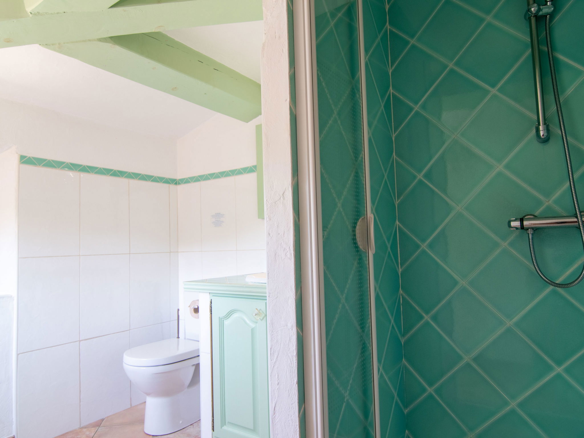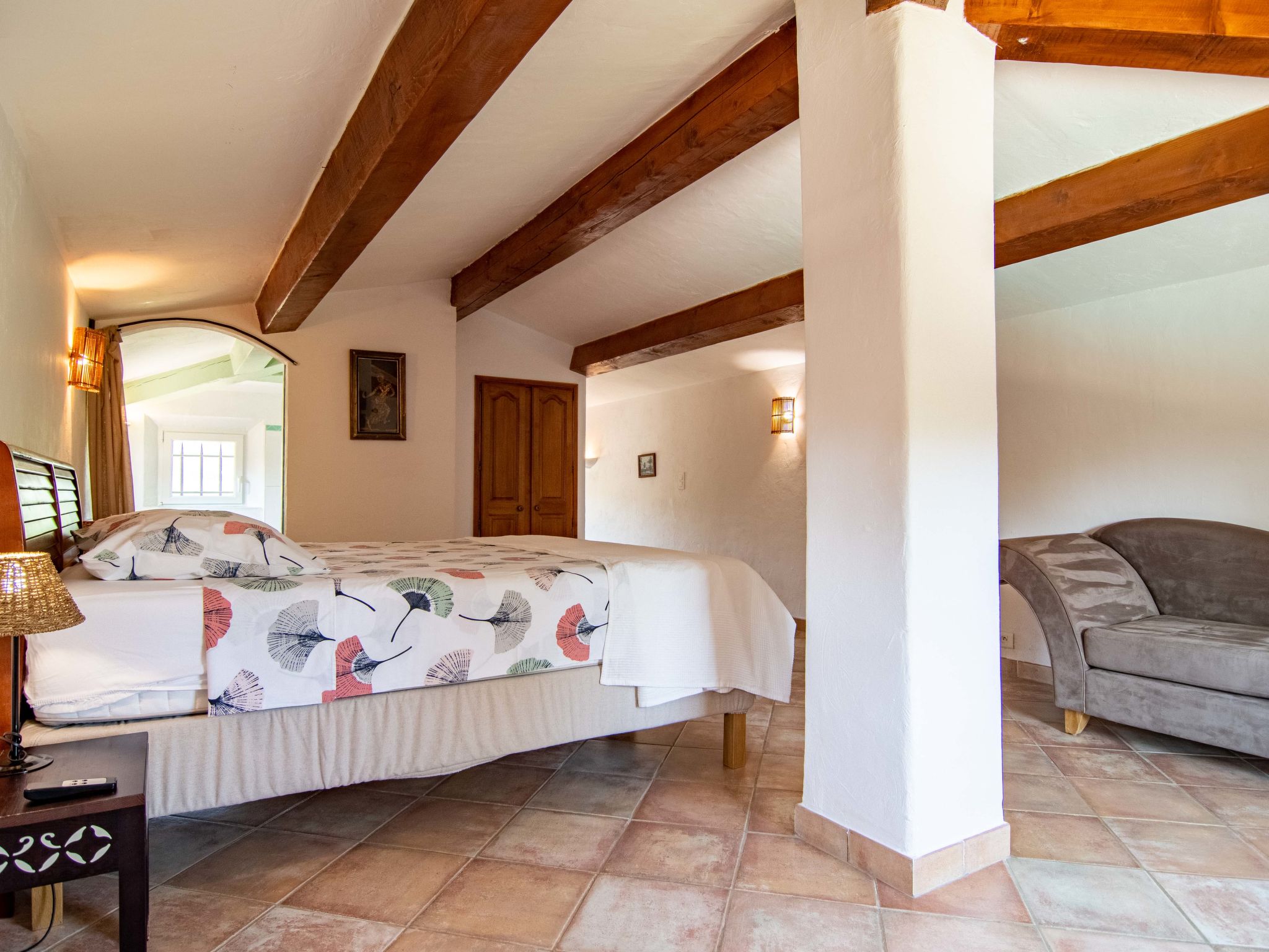"Villa Gaïa", maison 5 pièces 170 m2 sur 2 niveaux. Aménagement confortable et de bon goût: grand séjour avec cheminée, table pour les repas, TV (satellite) et DVD. Sortie sur la terrasse. 1 chambre avec 1 grand-lit (160 cm). Sortie sur la terrasse. 2 chambres, chaque chambre avec: 2 lits. Cuisine (four, lave-vaisselle, 4 feux, grille-pain, bouilloire électrique, micro-ondes, congélateur, cafetière électrique) avec petite table pour les repas. Sortie sur la terrasse. Bain/douche, WC séparé, double vasque. À l'étage supérieur: 1 grande chambre, mansardée, ouverte avec 1 grand-lit (160 cm), douche/WC. Chauffage au gaz, chauffage par le sol. Grande terrasse partiellement couverte. Meubles de terrasse, barbecue, chaises longues (8). Vue sur la piscine et le jardin. A disposition: lave-linge, fer à repasser, chaise haute pour enfant, lit bébé. Internet (Connexion WIFI, gratuit). Veuillez noter: maison non-fumeur. Maximum 1 animal/ chien autorisé. Détecteur de fumée. Accès a la maison par un escalier de 12 marches. Si le nombre d’occupants n’atteint pas le maximum, toutes les chambres ne seront pas disponibles.