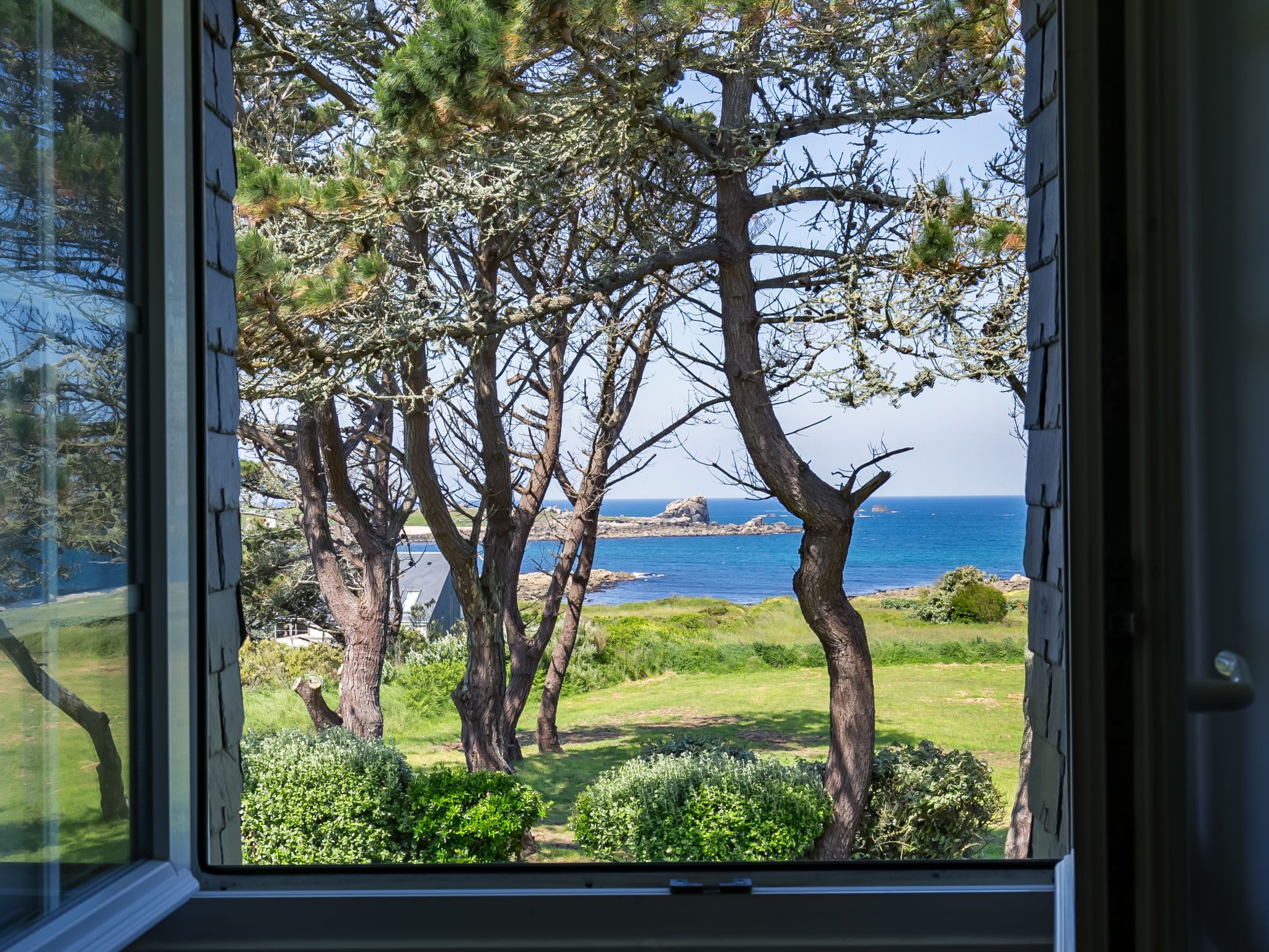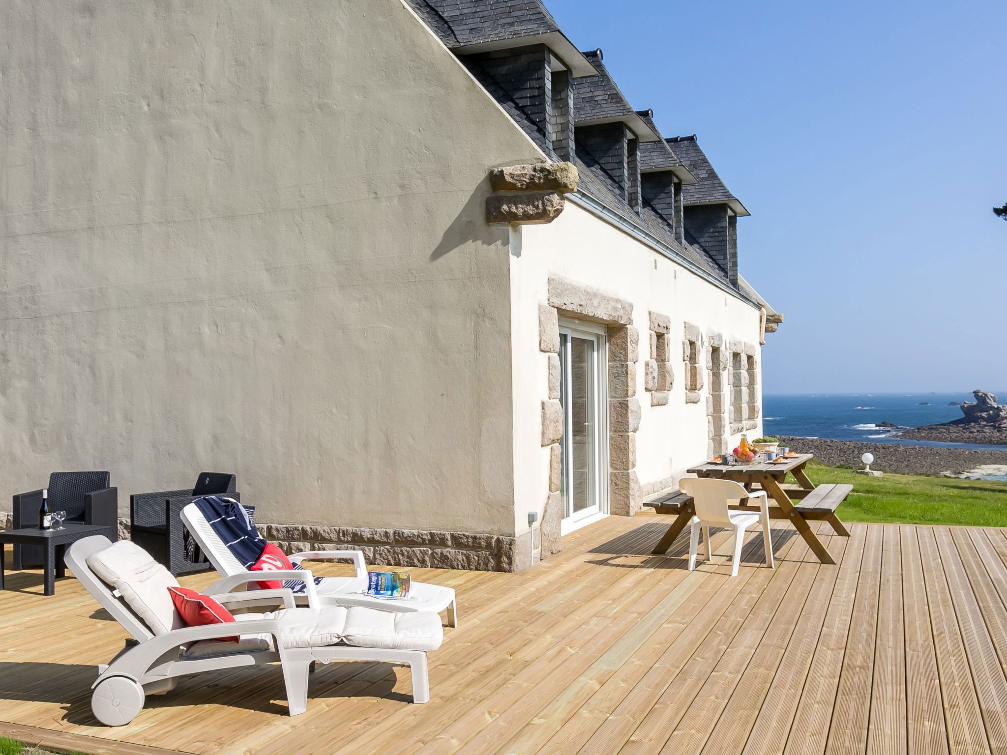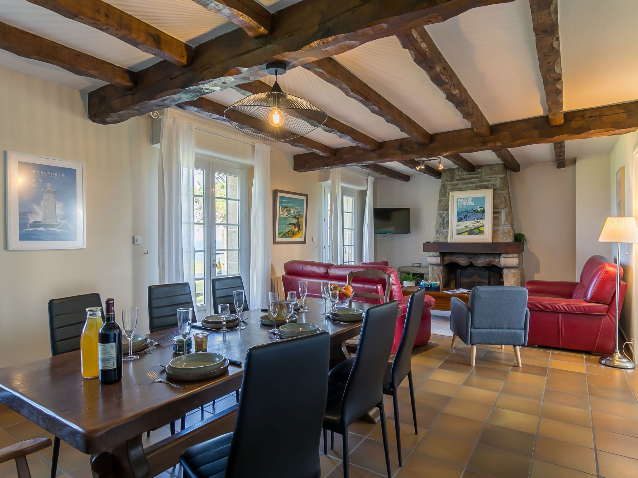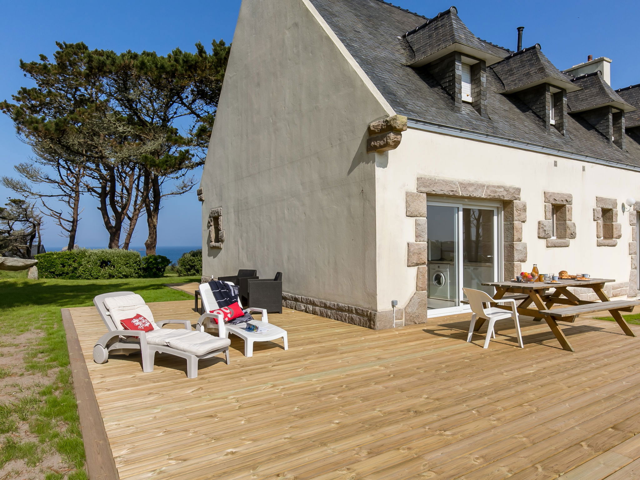 "Saint Gonvel", maison 6 pièces 200 m2 sur 2 niveaux. Aménagement plaisant et avec beaucoup de bois: séjour/salle à manger avec baie vitrée avec table pour les repas, TV et DVD. Sortie sur la terrasse. 1 chambre avec 1 grand-lit (180 cm, longueur 200 cm). Cuisine (four, lave-vaisselle, 3 plaques à induction, grille-pain, bouilloire électrique, micro-ondes, cafetière électrique) avec table pour les repas. Douche, WC séparé. À l'étage supérieur: 2 chambres, chaque chambre avec: 1 grand-lit (140 cm, longueur 190 cm). 1 chambre avec 1 grand-lit (140 cm, longueur 190 cm), lavabo. 1 chambre avec 1 lit (120 cm, longueur 190 cm). Douche, WC séparé. Chauffage au fuel. Sol en parquet. Terrasse. Meubles de terrasse, barbecue (portable), chaises longues (4), réduit. Superbe vue panoramique sur la mer et jusqu'à l'île d'Ouessant. A disposition: lave-linge, fer à repasser, chaise haute pour enfant, lit bébé. Internet (Connexion WIFI, gratuit). Veuillez noter: maison non-fumeur. Détecteur de fumée. La répartition des lits est flexible: Il y a plus de couchages que le nombre maximum de personnes admis dans la location. Ce nombre maximum doit néanmoins être respecté.